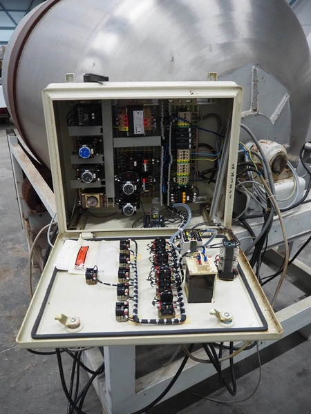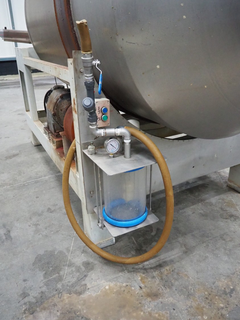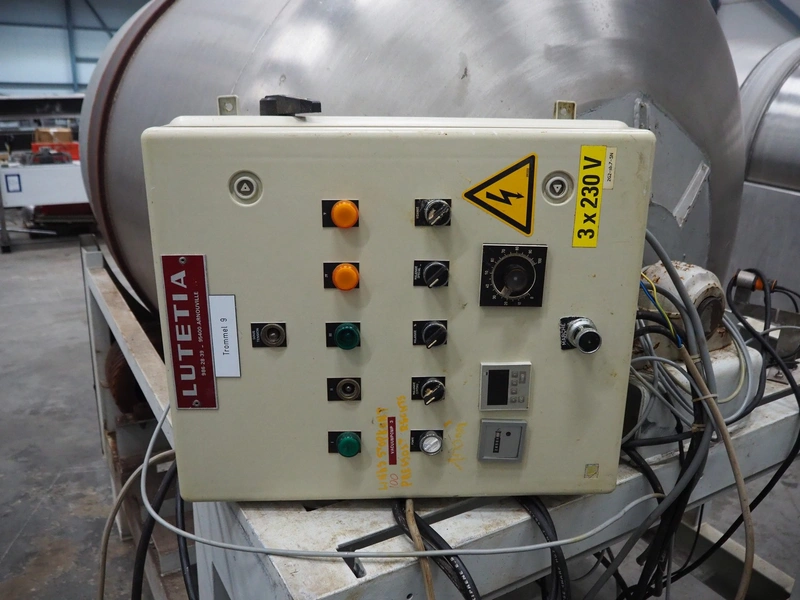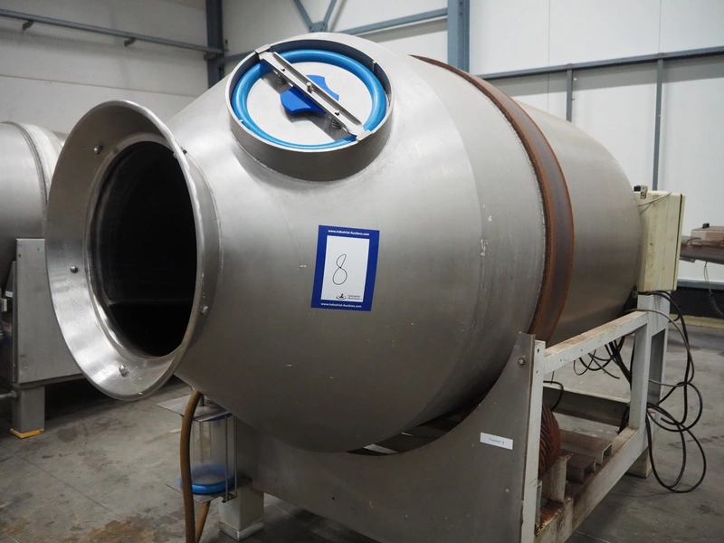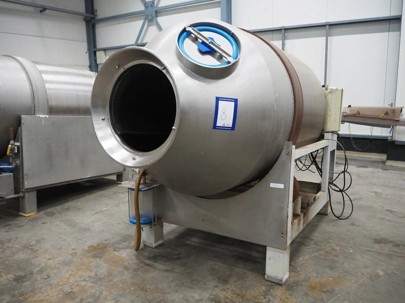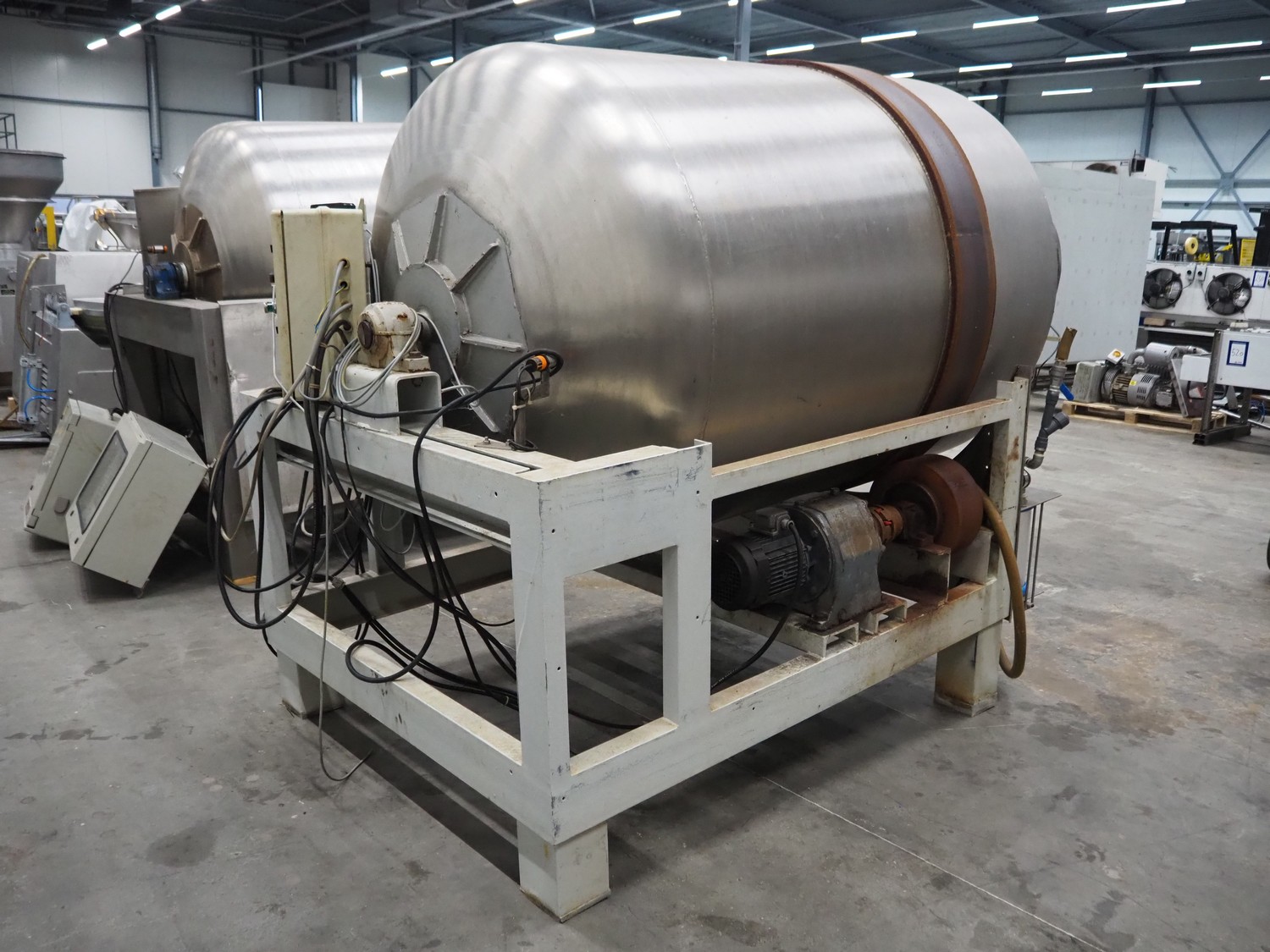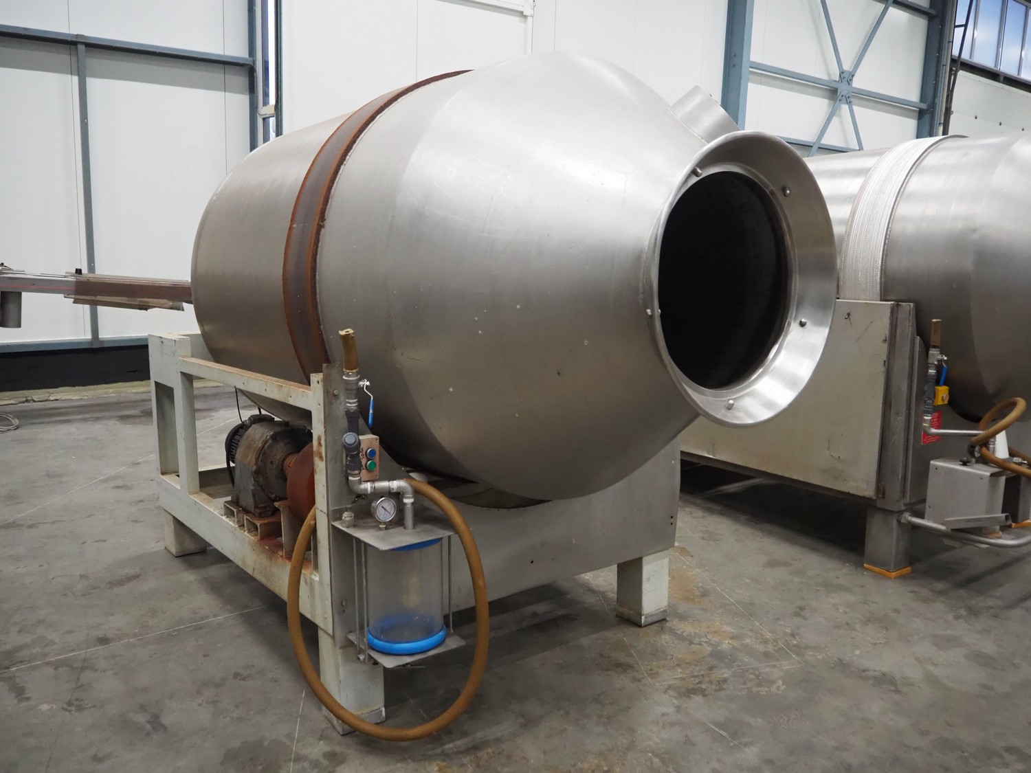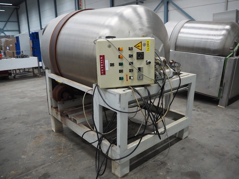 Lutetia vacuum tumbler, 220 V, 3 Ph, dimensions drum: Ø 1300 mm x 1600 mm, total dimensions: 2900 mm x 1450 mm x 1950 mm. Without vacuum pump, lids are with the machine.