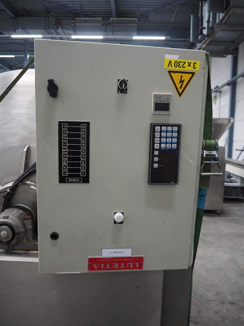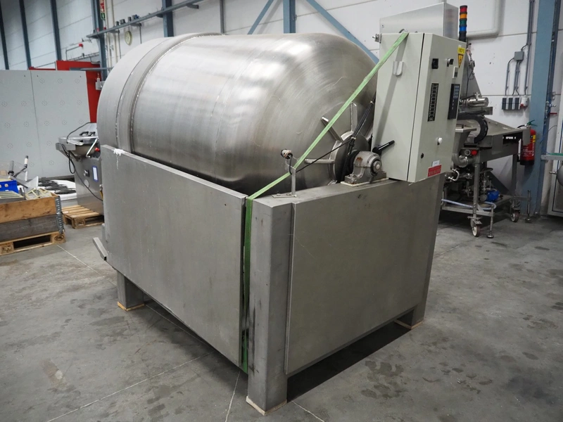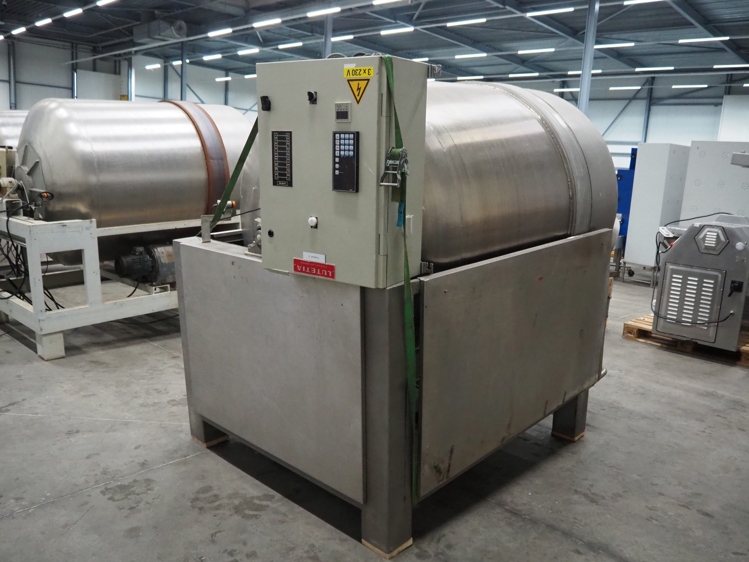Lutetia vacuum tumbler, serial number: 7666, 3 Ph, 220 V, dimensions drum: Ø 1300 mm x 1600 mm, total dimensions: 2900 mm x 1450 mm x 1950 mm. Without vacuum pump, missing 1 lid.