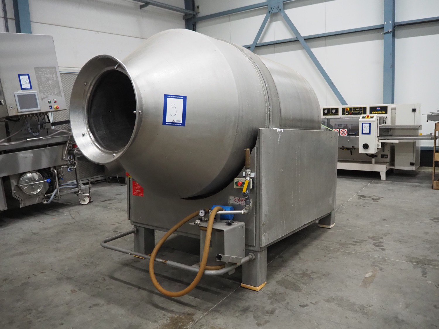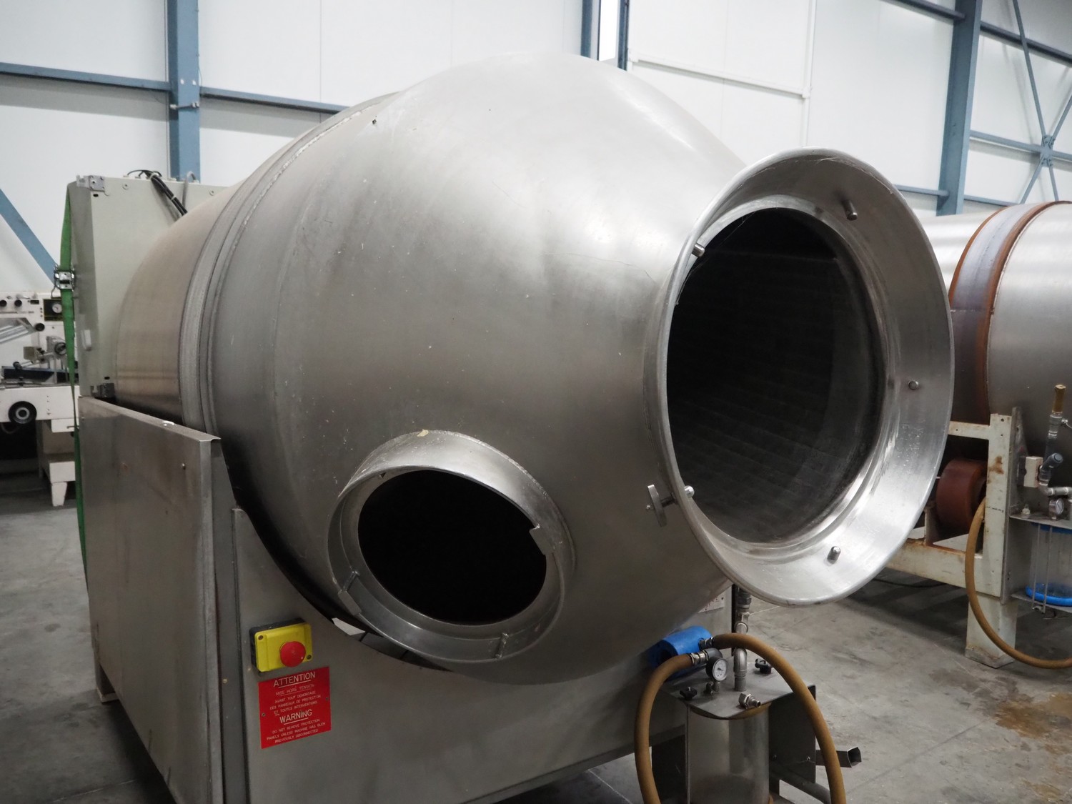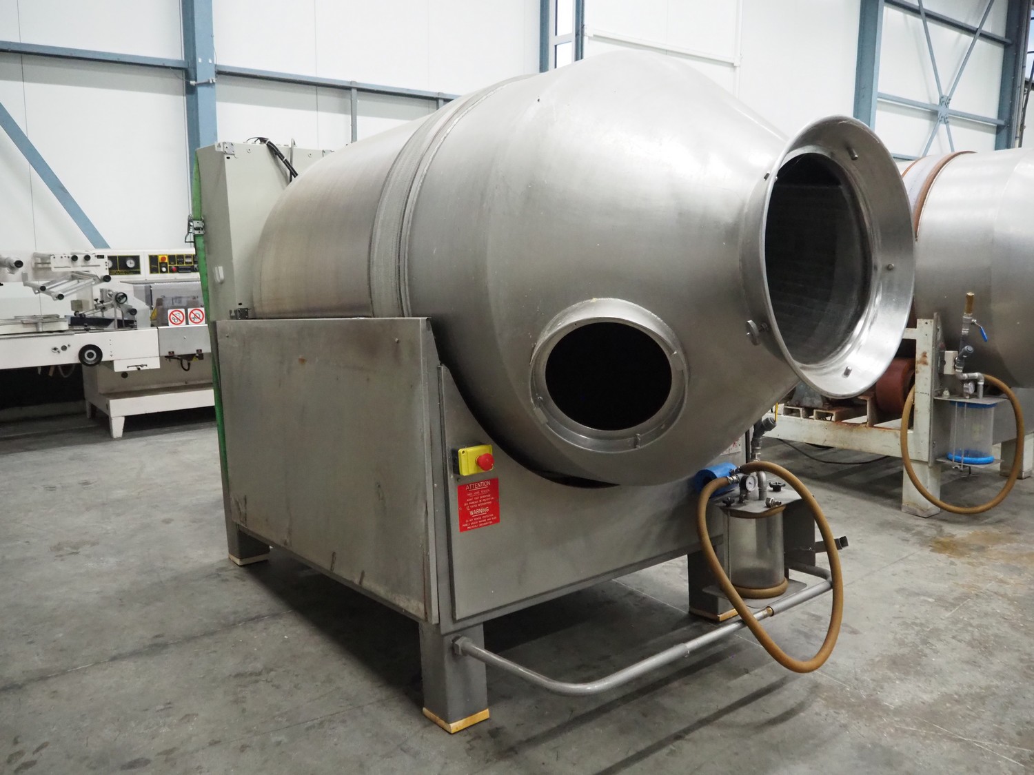 Lutetia vacuum tumbler, serial number: 7666, 3 Ph, 220 V, dimensions drum: Ø 1300 mm x 1600 mm, total dimensions: 2900 mm x 1450 mm x 1950 mm. Without vacuum pump, missing 1 lid.