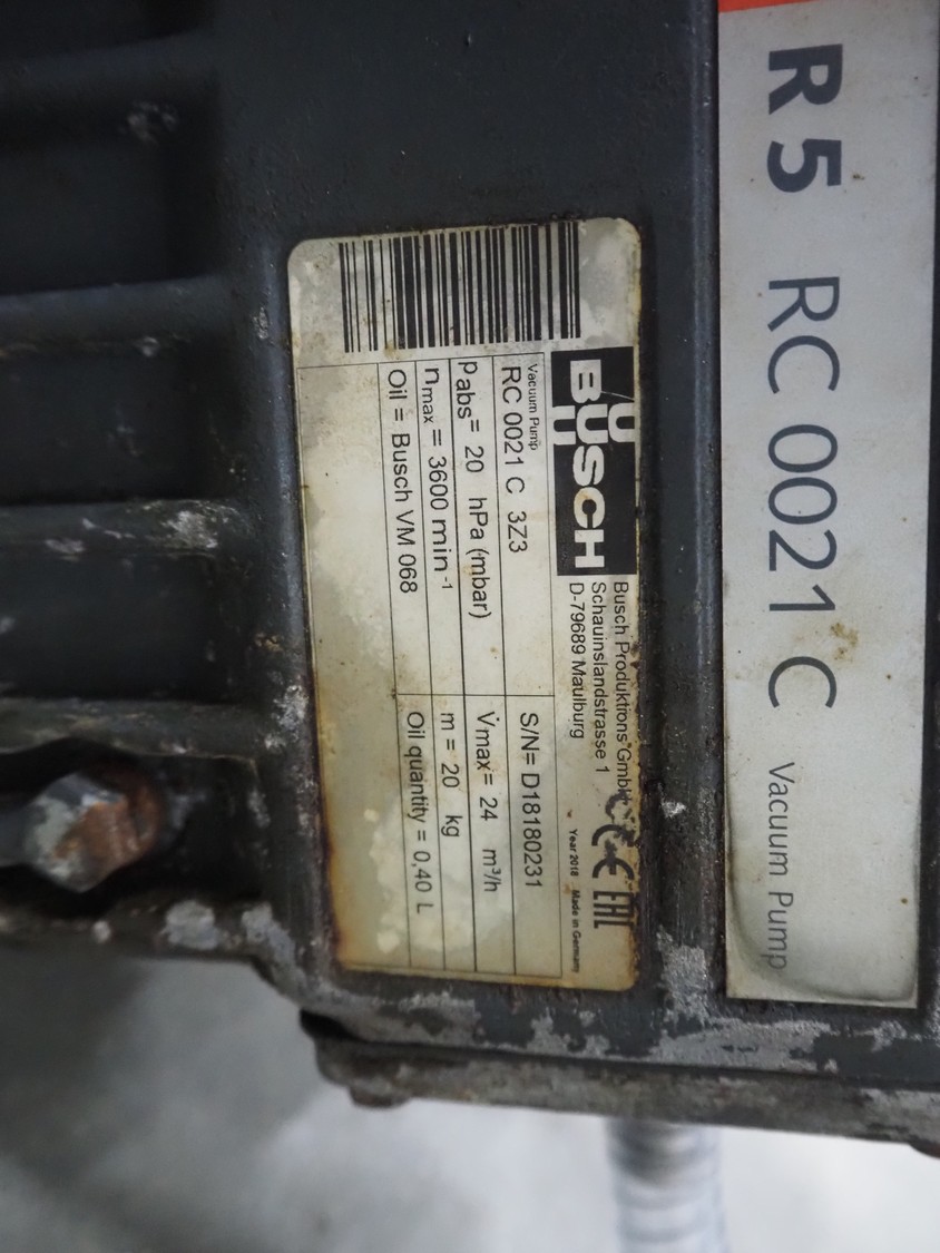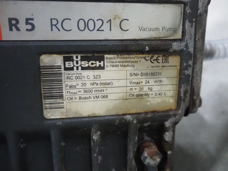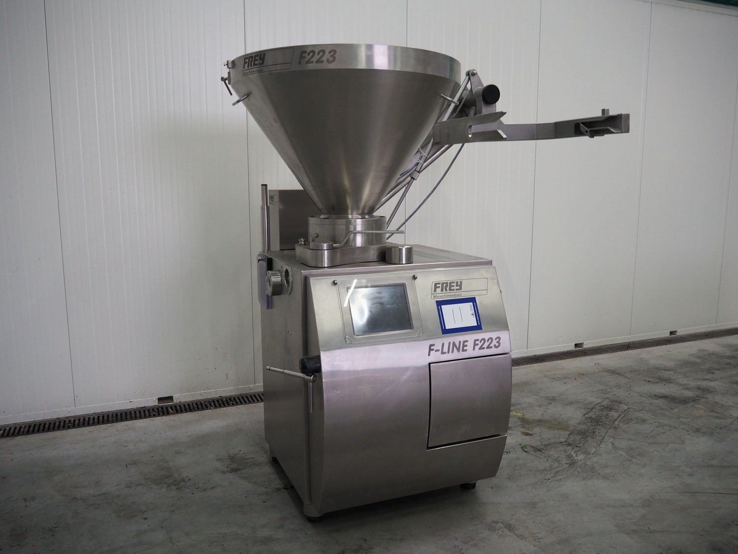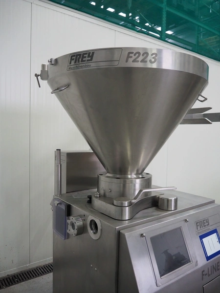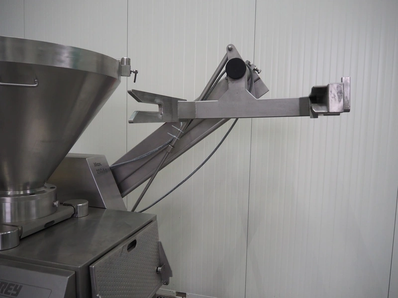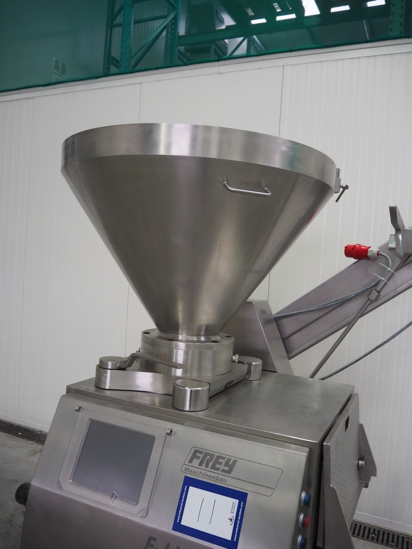 Frey Maschinenbau vacuum filling machine with lifter for 200 liter meat bins, type: F-Line F223, machine number: F223PT1092864, year of construction: 2014, 400 V, 50/60 Hz, 10.45 kW, Busch vacuum pump, type: RC 0021 C 3Z3, serial number: D18180231, year of construction: 2018, capacity: 24 m³ per hour, total dimensions: 2000 mm x 1300 mm x 2100 mm. Including box with various parts.