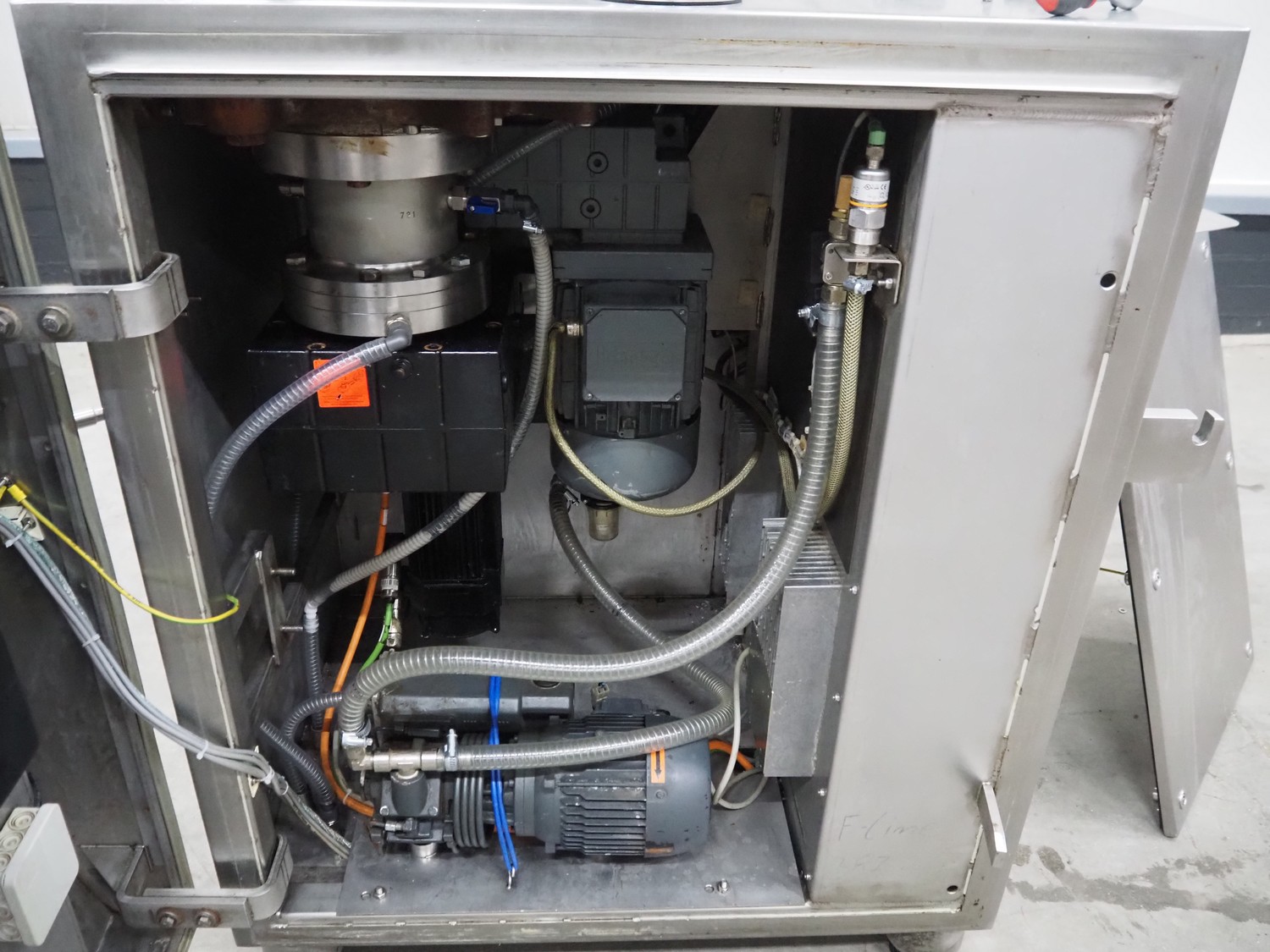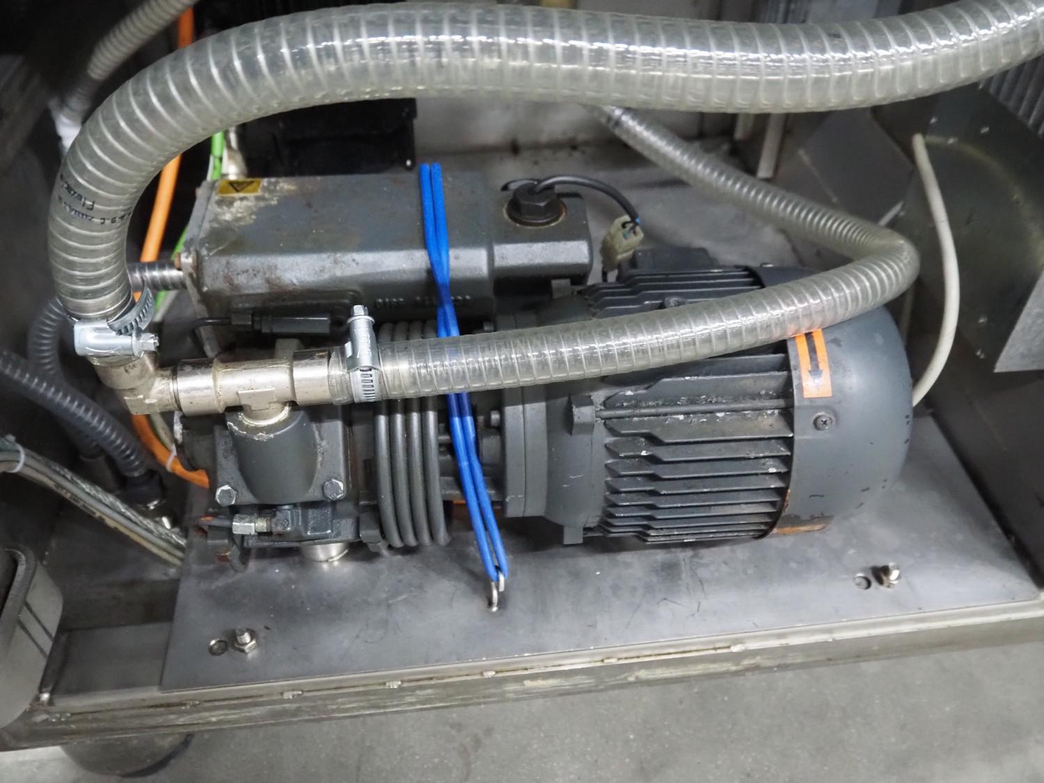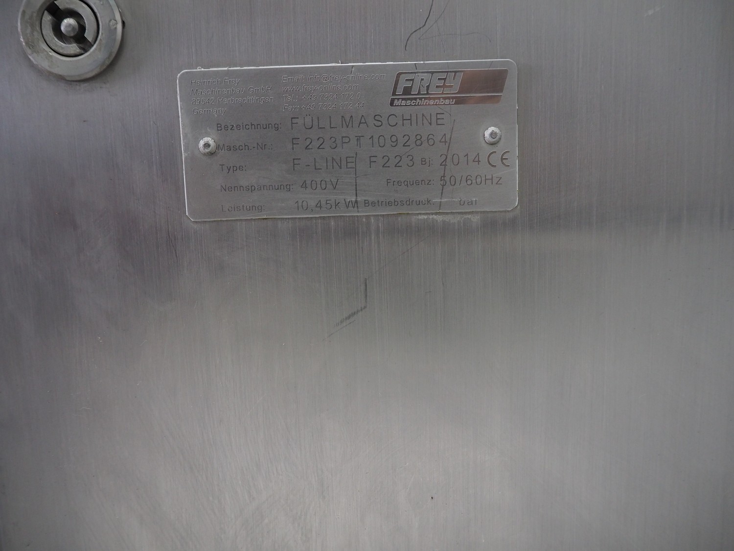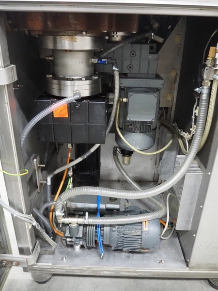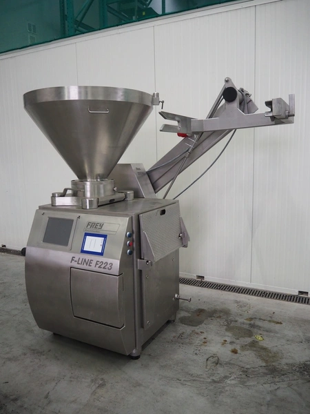 Frey Maschinenbau vacuum filling machine with lifter for 200 liter meat bins, type: F-Line F223, machine number: F223PT1092864, year of construction: 2014, 400 V, 50/60 Hz, 10.45 kW, Busch vacuum pump, type: RC 0021 C 3Z3, serial number: D18180231, year of construction: 2018, capacity: 24 m³ per hour, total dimensions: 2000 mm x 1300 mm x 2100 mm. Including box with various parts.