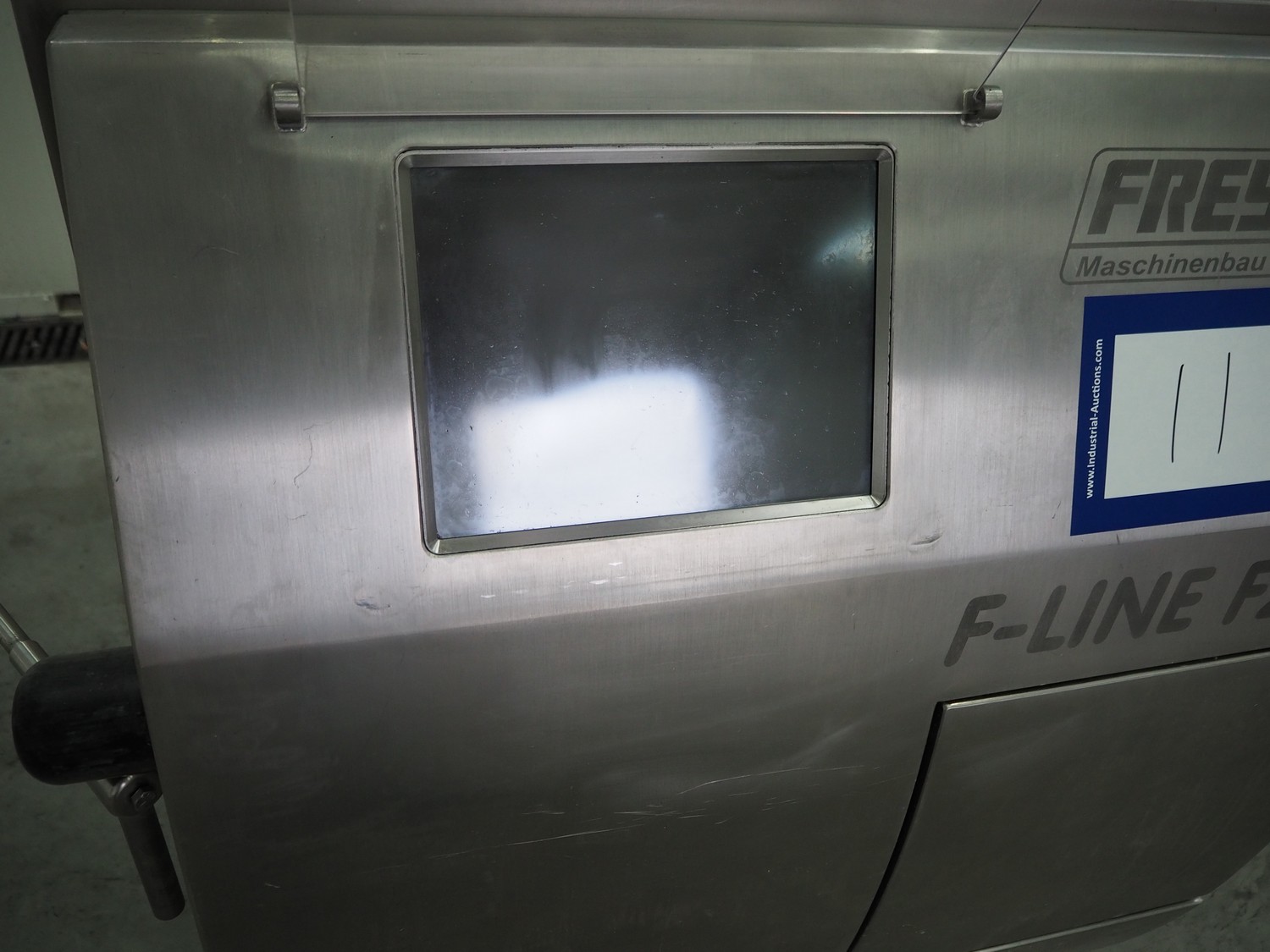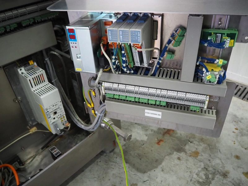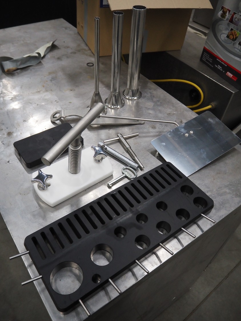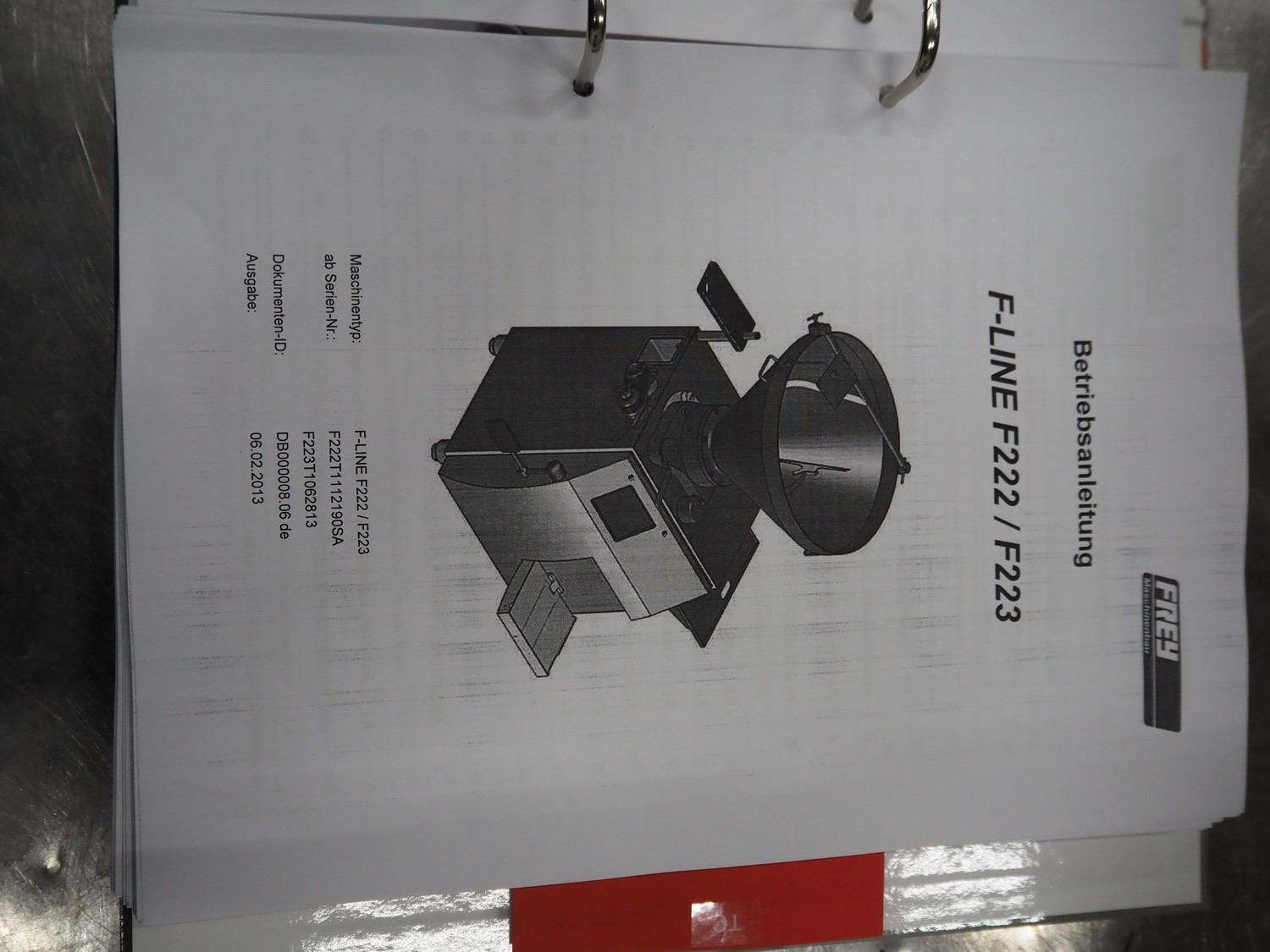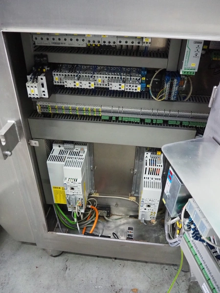 Frey Maschinenbau vacuum filling machine with lifter for 200 liter meat bins, type: F-Line F223, machine number: F223PT1092864, year of construction: 2014, 400 V, 50/60 Hz, 10.45 kW, Busch vacuum pump, type: RC 0021 C 3Z3, serial number: D18180231, year of construction: 2018, capacity: 24 m³ per hour, total dimensions: 2000 mm x 1300 mm x 2100 mm. Including box with various parts.