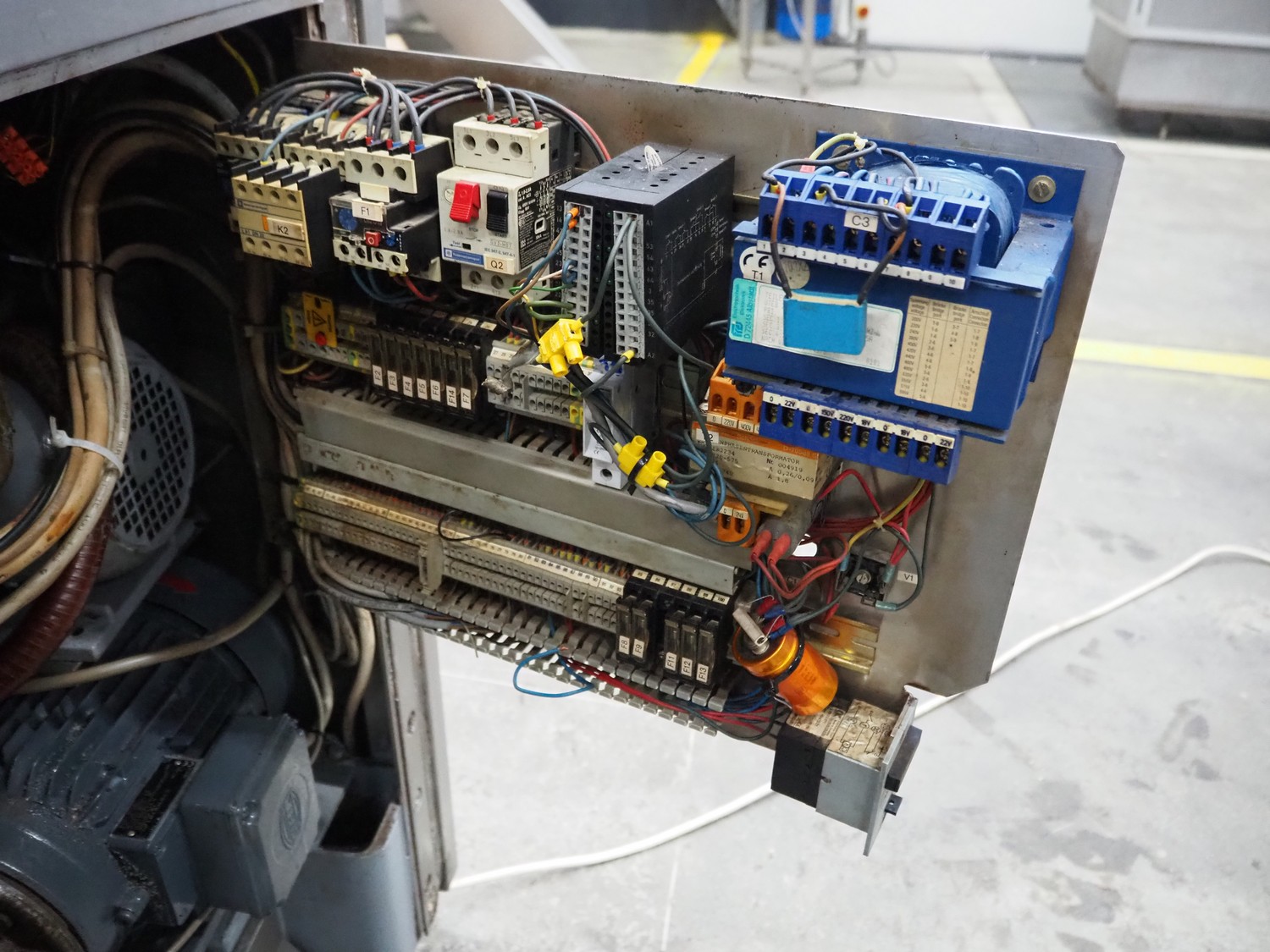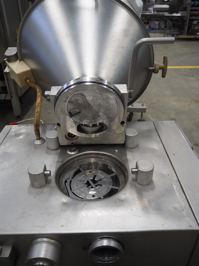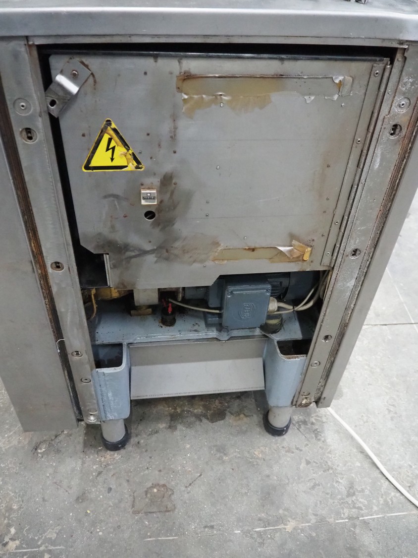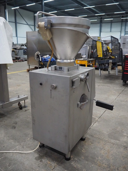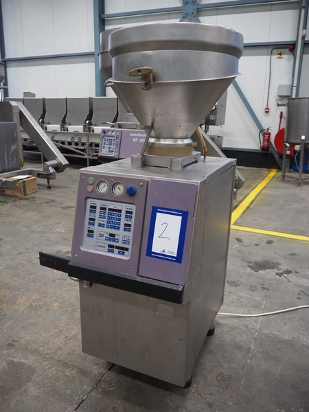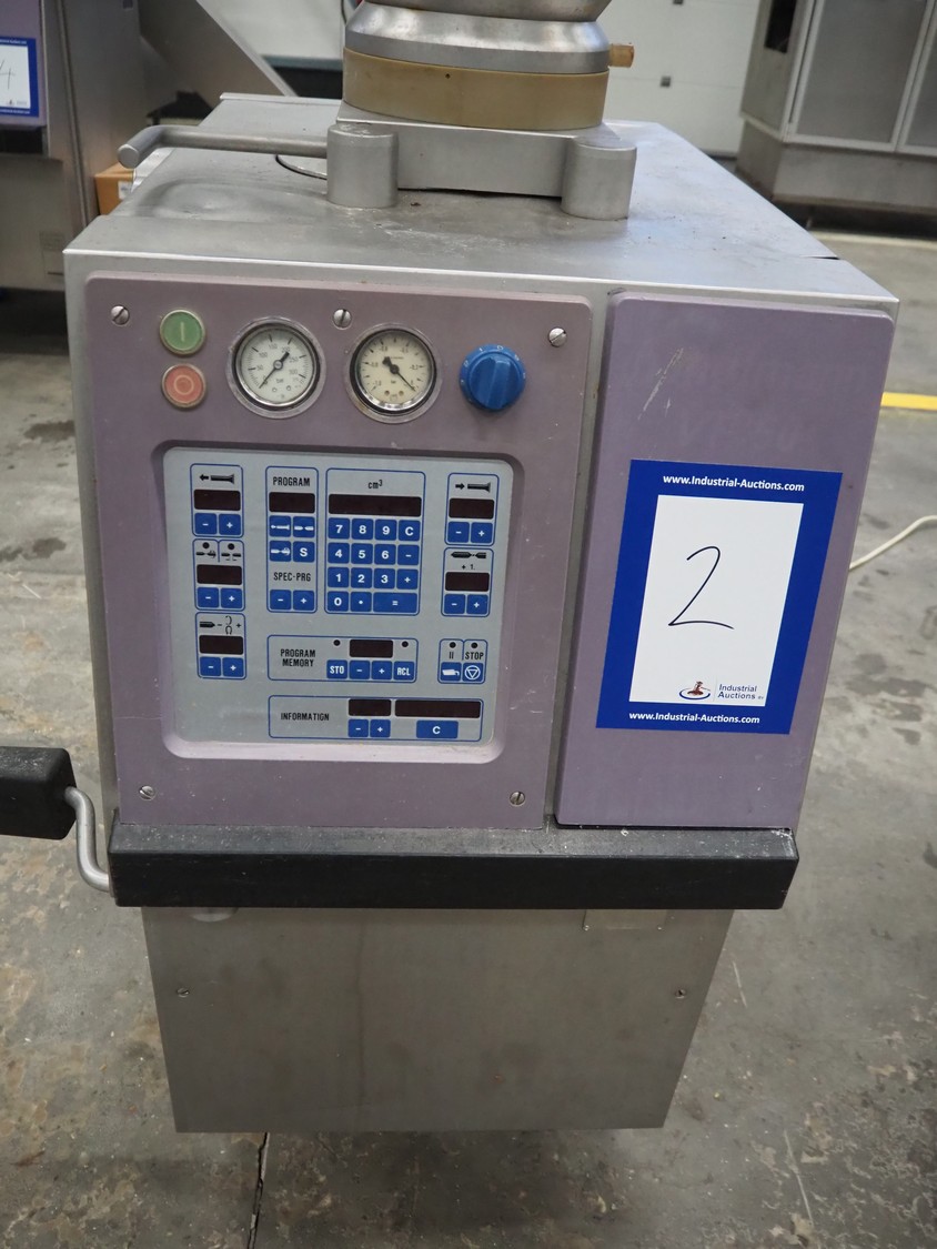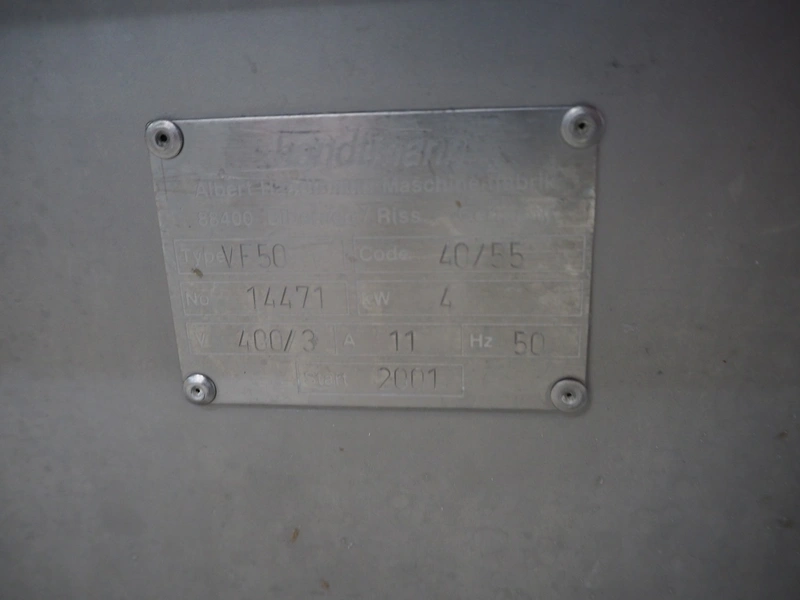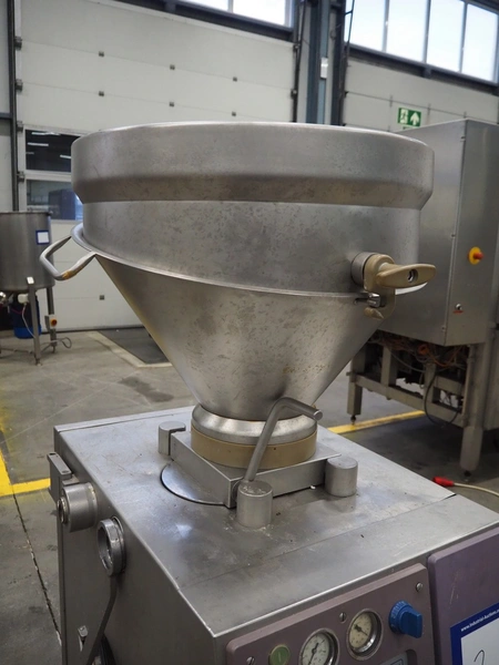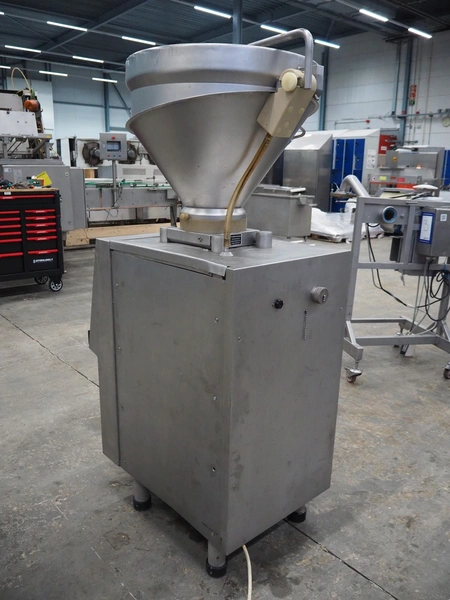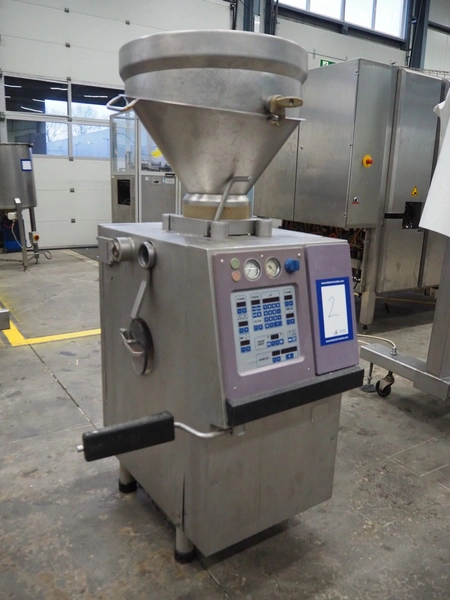 Handtmann vacuum filling machine, type: VF50, number: 14471, year of construction: 2001, 400 V, 3 Ph, 50 Hz, 11 A, 4 kW, dimensions: 900 mm x 550 mm x 1650 mm.