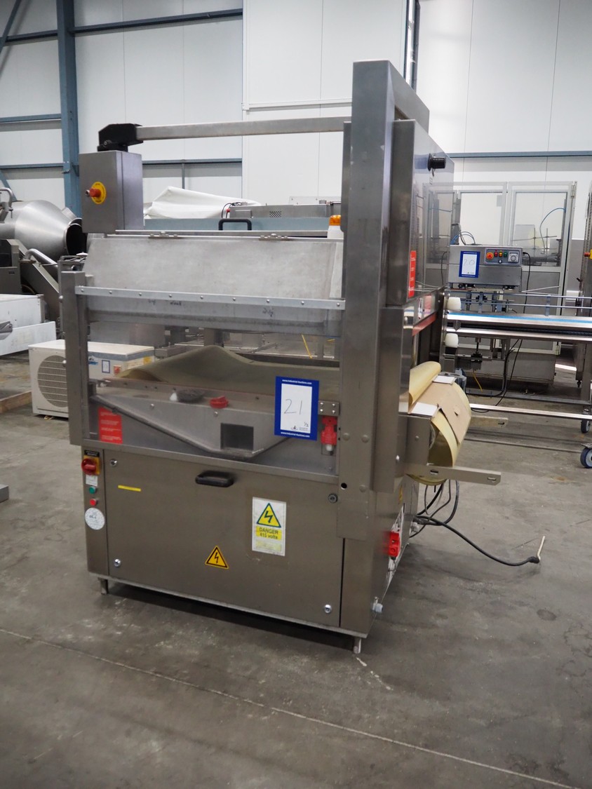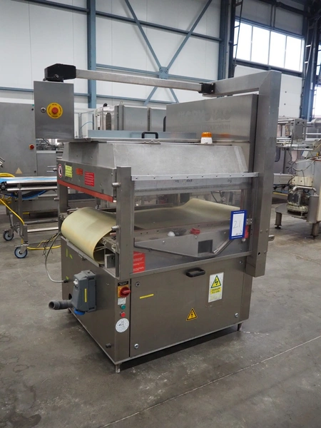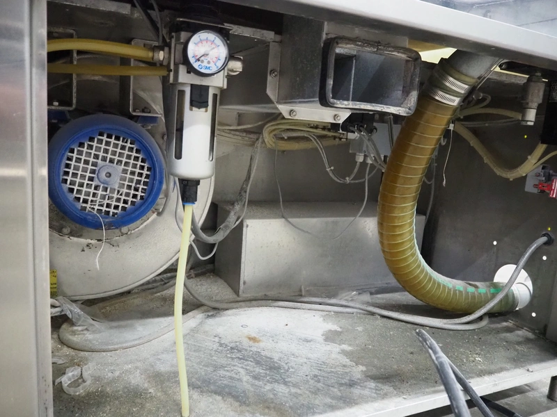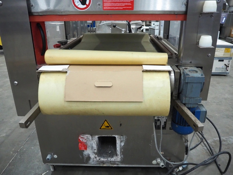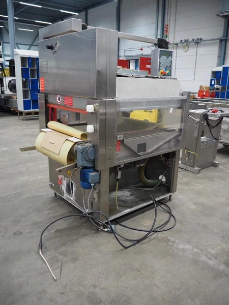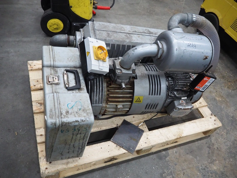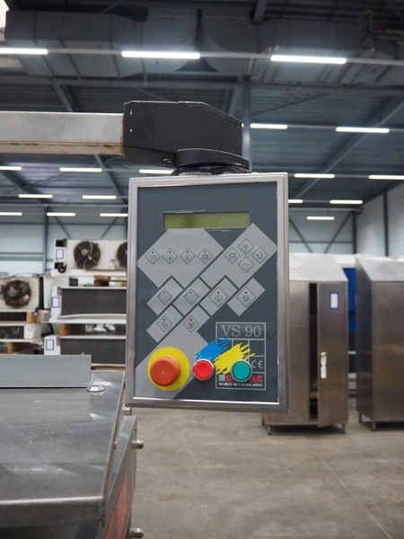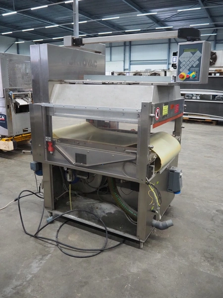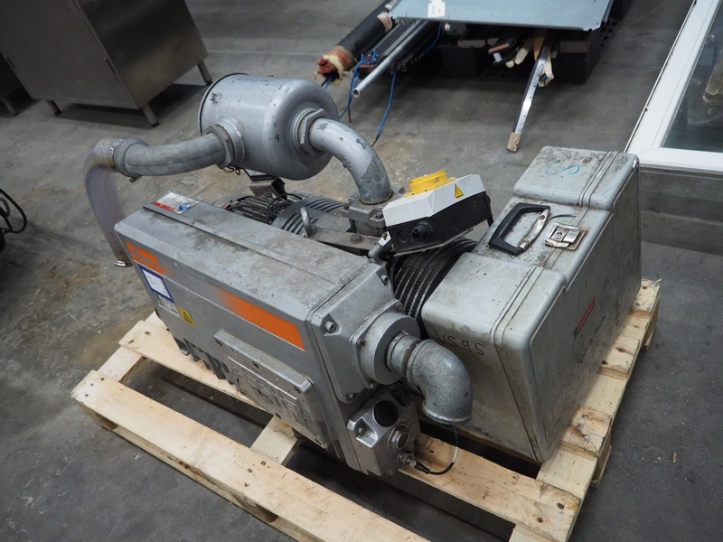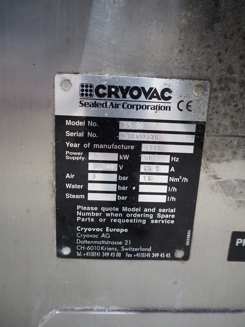 Cryovac belt vacuum machine, model number: VS 90, serial number: A03301339, year of construction: 1999, 400 V, 3 Ph, 50 Hz, 20 A, 5 kW, 15 Nm³/h, 6 bar, belt width: 660 mm, seal length: (2x) 960 mm, dimensions chamber: 960 mm x 720 mm, total dimensions: 2240 mm x 1200 mm x 1960 mm, including Busch vacuum pump, type: RA 0160 D 5Z1 GQXX, year of construction: 2010, dimensions: 860 mm x 500 mm x 600 mm. Incomplete.