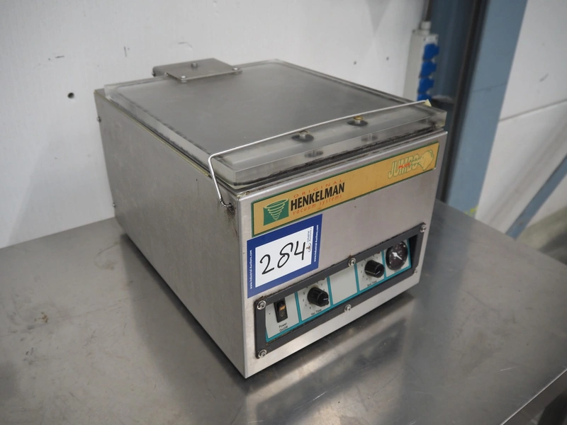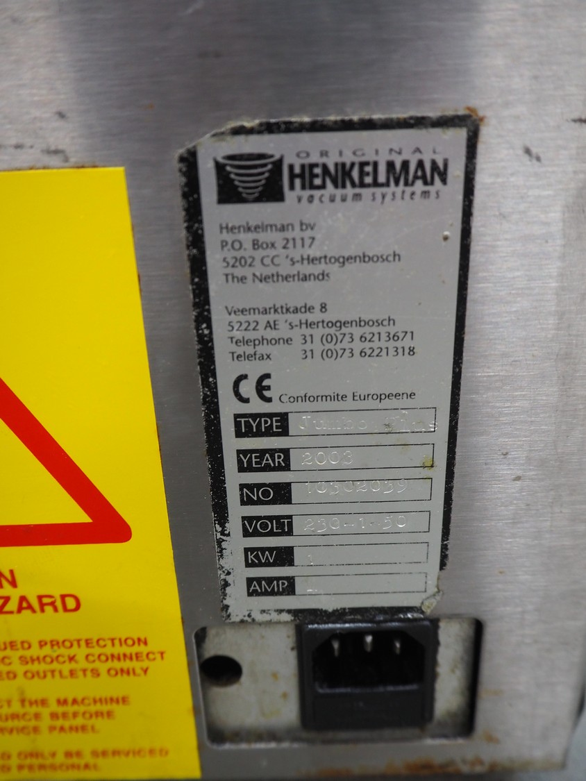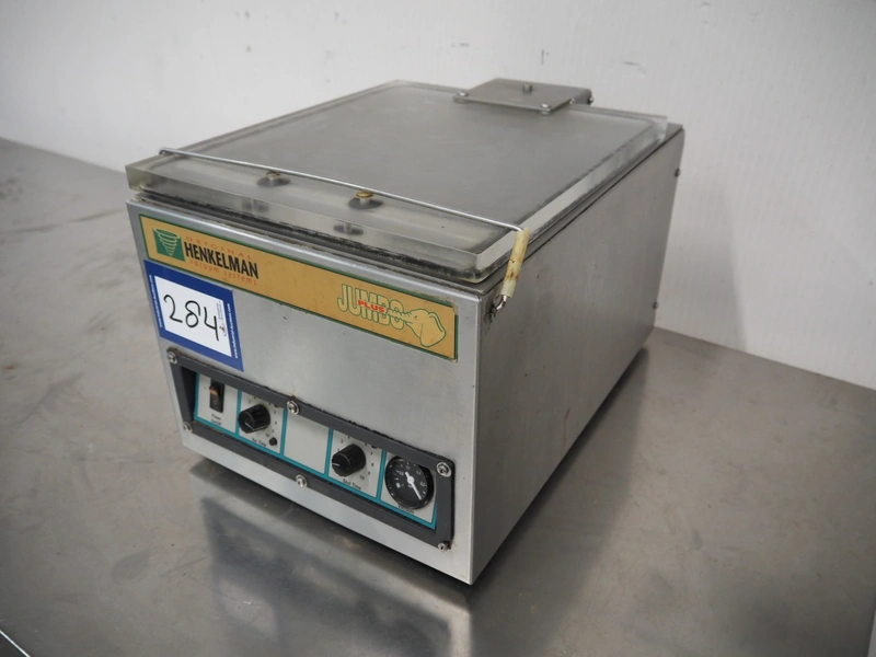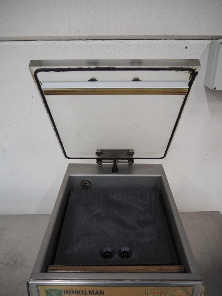 Henkelman vacuum machine, type: JUMBO PLUS, number: 10302039, year of construction: 2003, 230 V, 1 Ph, 50 Hz, 1 kW, seal length: 280 mm, dimensions chamber: 305 mm x 285 mm x 50 mm, total dimensions: 450 mm x 340 mm x 300 mm.