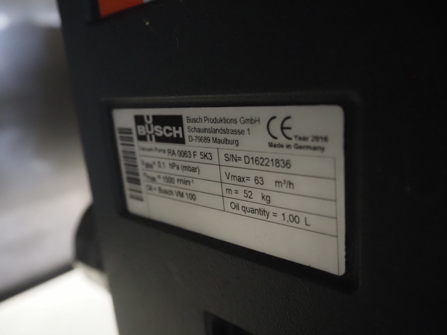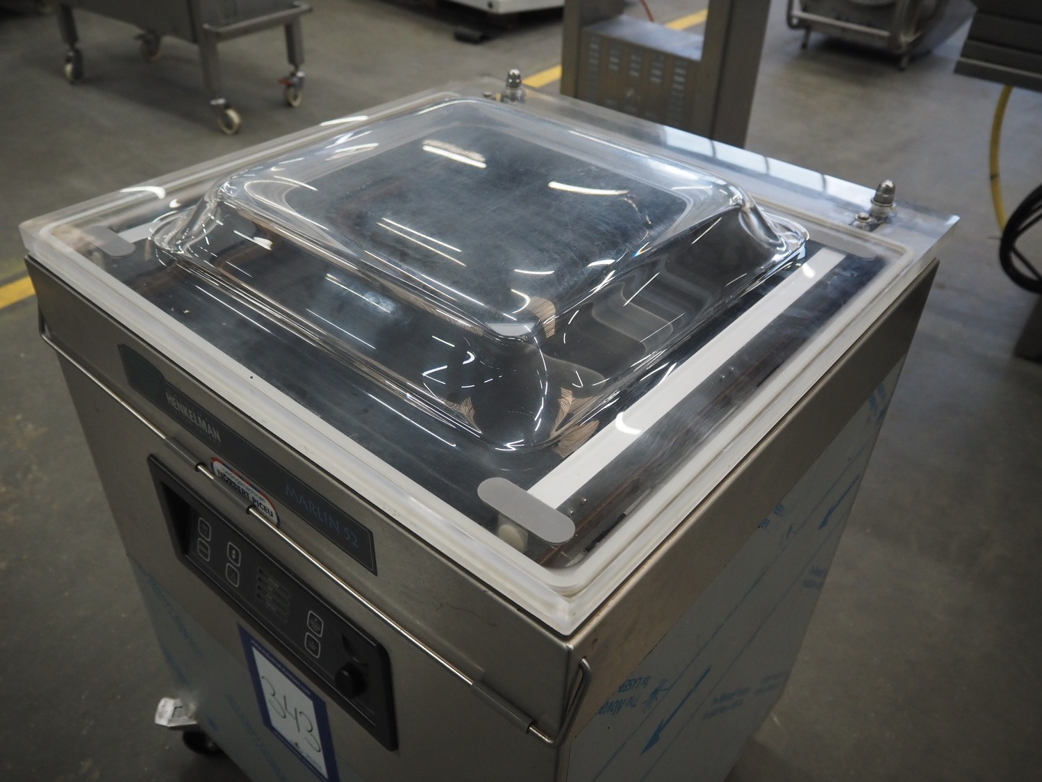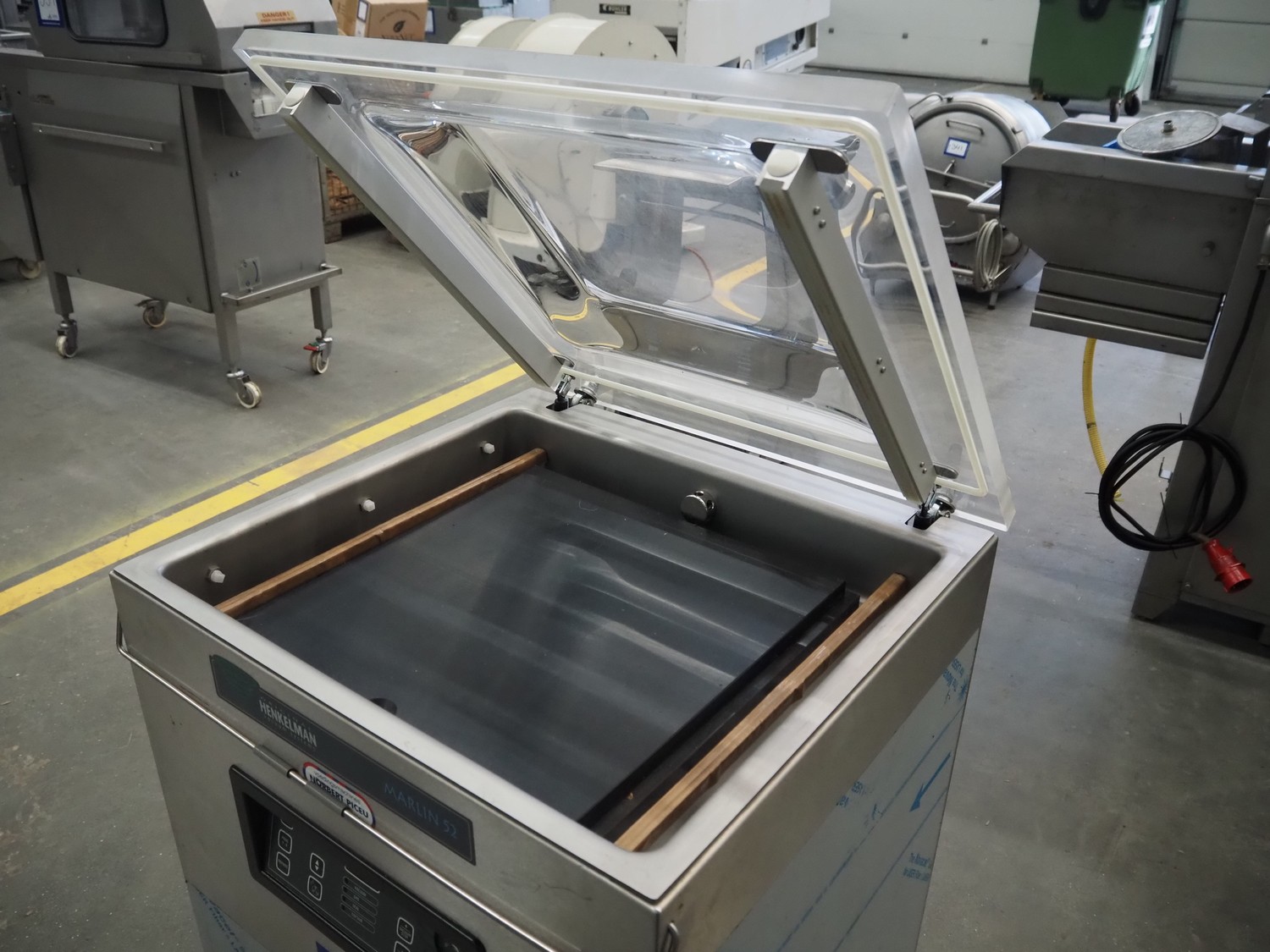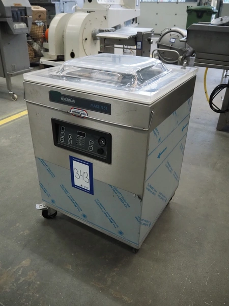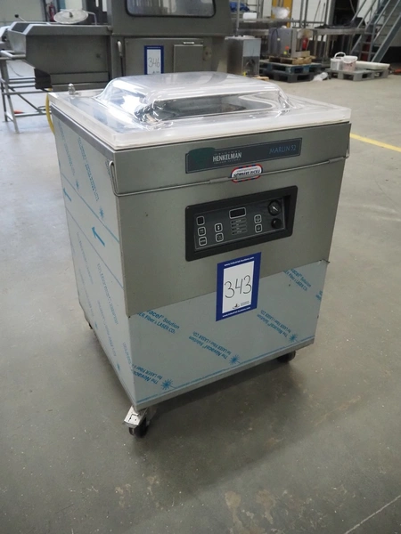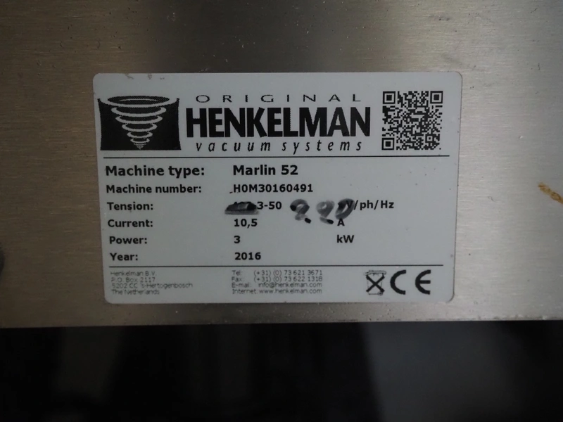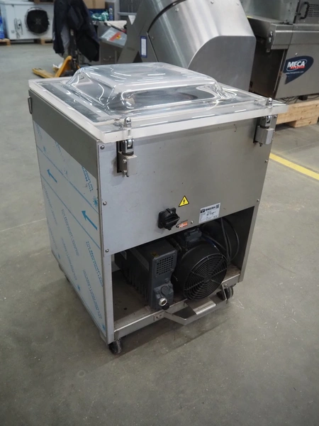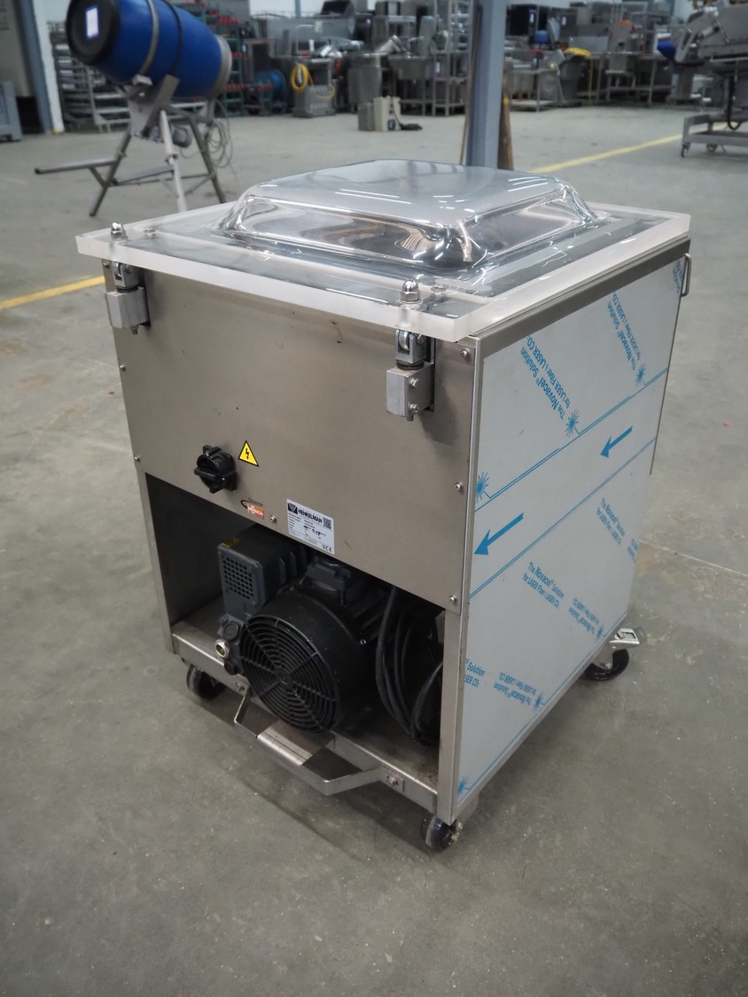 Henkelman mobile vacuum machine, type: Marlin 52, number: H0M301640491, year of construction: 2016, 200 V, 3 Ph, 50 Hz, 10.5 A, 3 kW, chamber dimensions: 530 mm x 500 mm x 50 mm, seal length: (2x) 530 mm, Busch vacuum pump, type: RA 0063 F 5K3, serial number: D16221836, year of construction: 2016, capacity: 63 m³ per hour, total dimensions: 700 mm x 700 mm x 1000 mm.