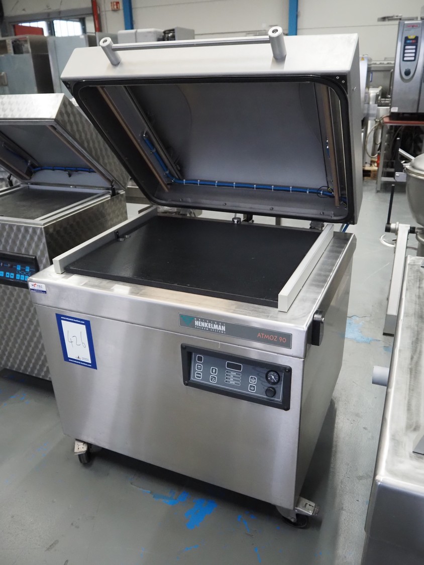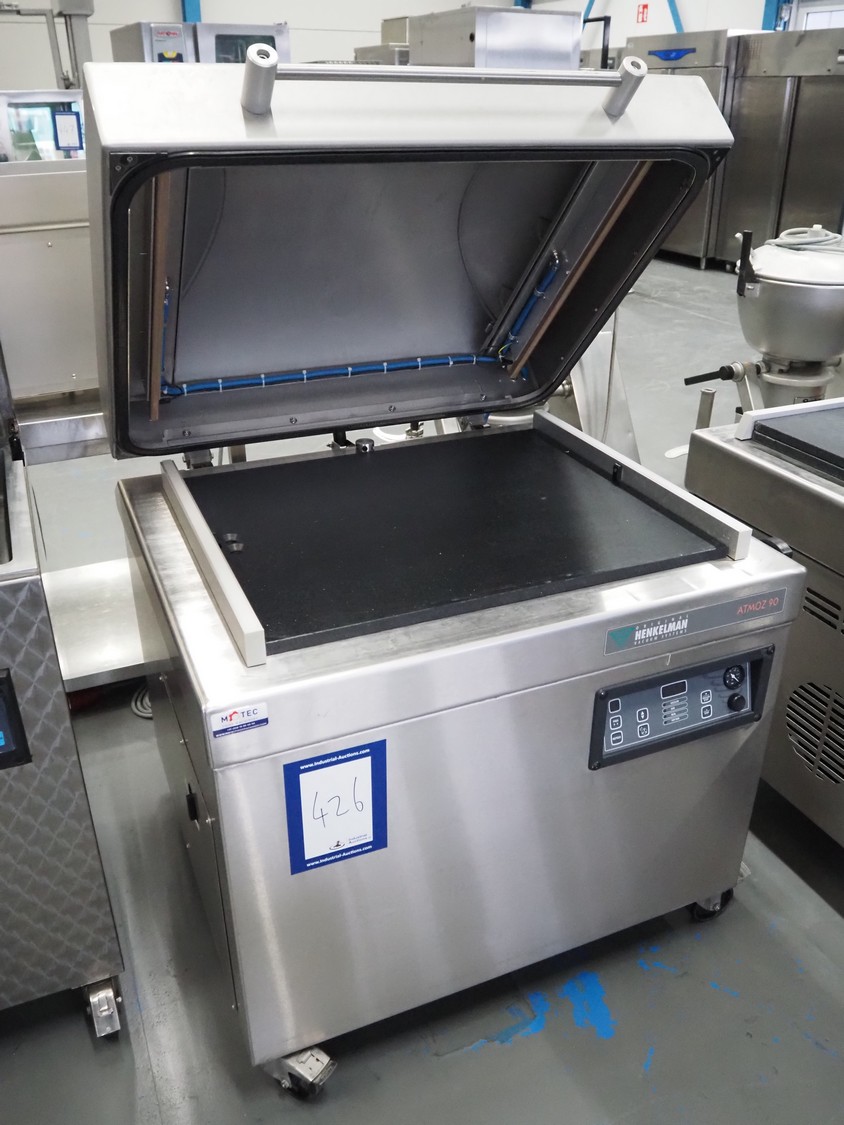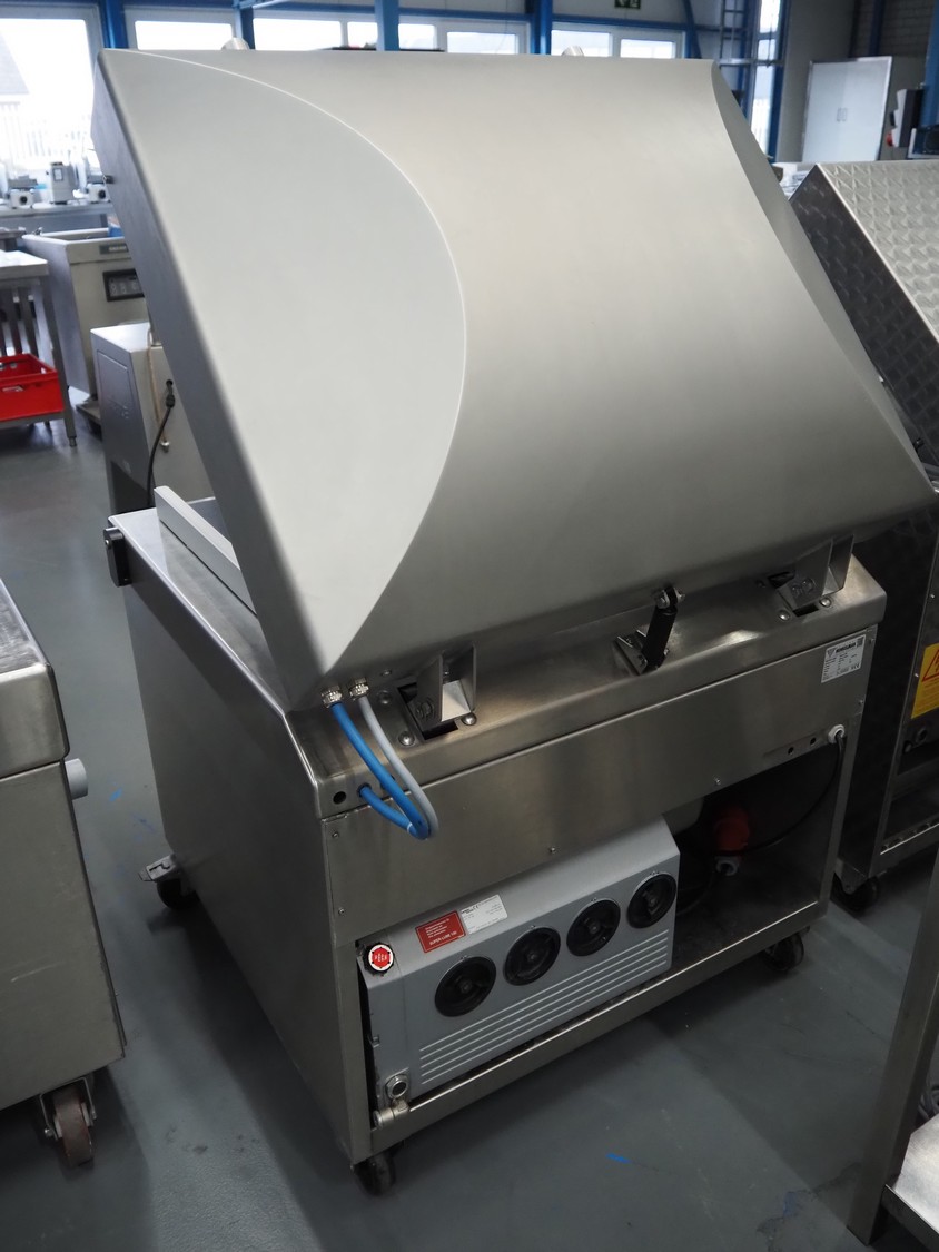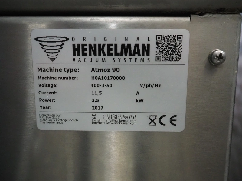 Henkelman mobile vacuum machine, type: Atmoz 90, machine number: H0A10170008, year of construction: 2017, 400 V, 3 Ph, 50 Hz, 11.5 A, 3.5 kW, chamber: 760 mm x 630 mm, seal length: (2x) 685 mm, Gardner Denver vacuum pump, type: V-VC 100 (20), capacity: 100/120 m³ per hour, total dimensions: 1000 mm x 1000 mm x 1120 mm.