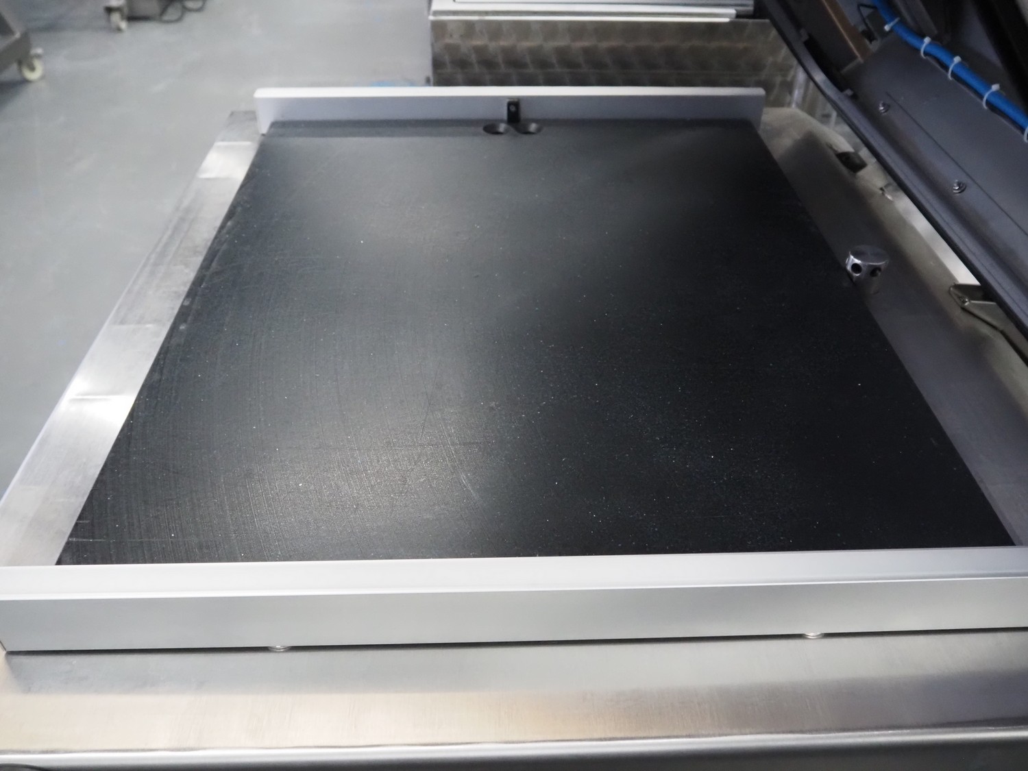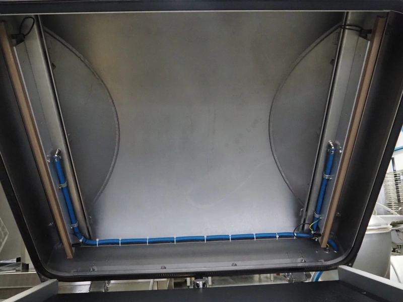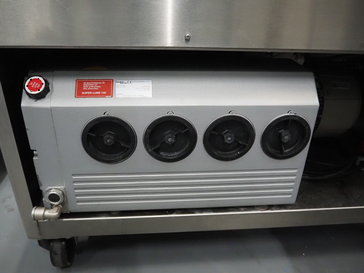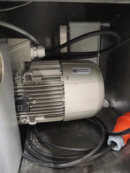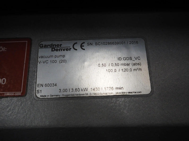 Henkelman mobile vacuum machine, type: Atmoz 90, machine number: H0A10170008, year of construction: 2017, 400 V, 3 Ph, 50 Hz, 11.5 A, 3.5 kW, chamber: 760 mm x 630 mm, seal length: (2x) 685 mm, Gardner Denver vacuum pump, type: V-VC 100 (20), capacity: 100/120 m³ per hour, total dimensions: 1000 mm x 1000 mm x 1120 mm.