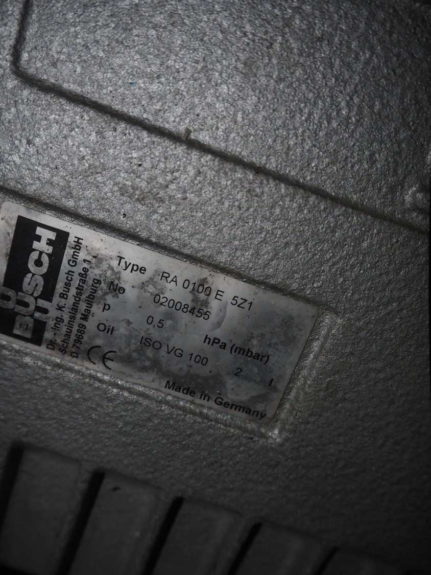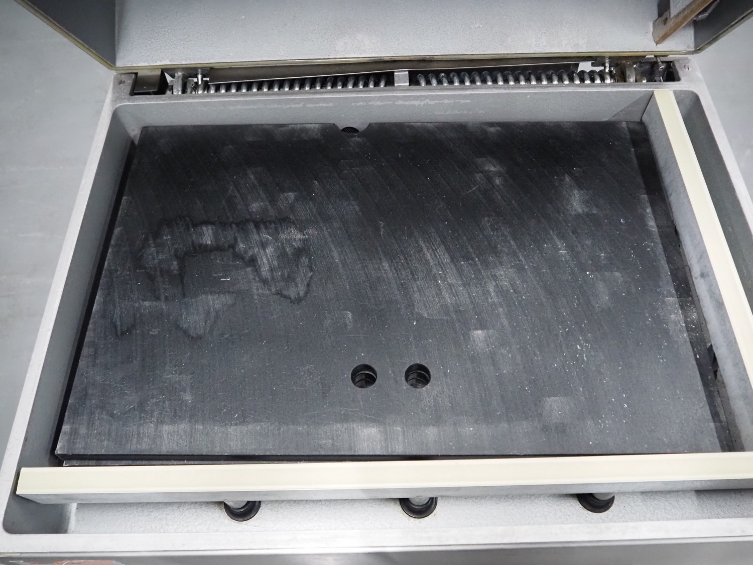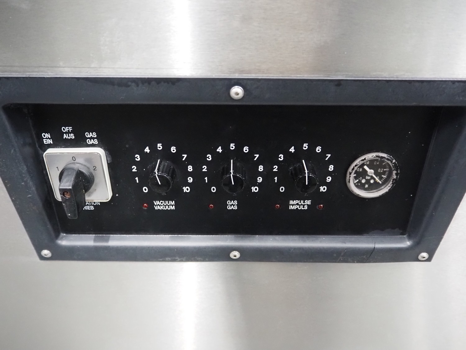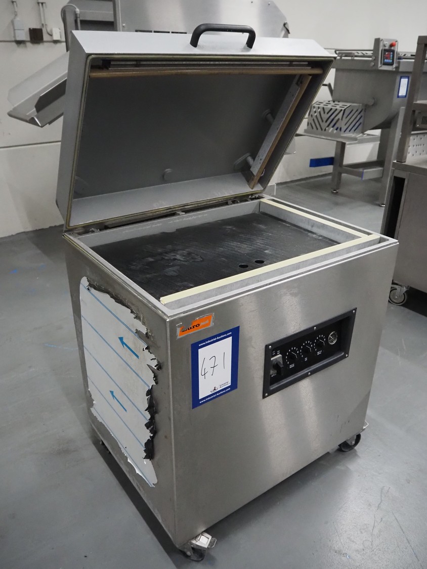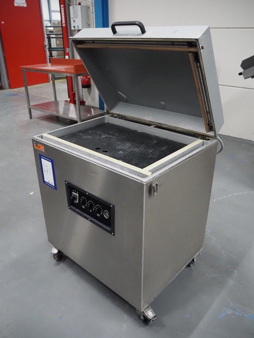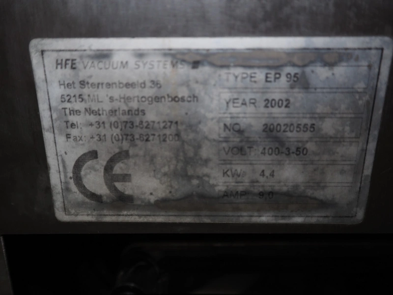 HFE Vacuum Systems mobile vacuum machine, type: EP 95, number: 20020555, year of construction: 2002, 400 V, 3 Ph, 50 Hz, 9 A, 4.4 kW, seal length: 800 mm and 500 mm, chamber dimensions: 740 mm x 500 mm, Busch vacuum pump, type: RA 0100 E 5Z1, number: 02008455, total dimensions: 850 mm x 700 mm x 1040 mm.