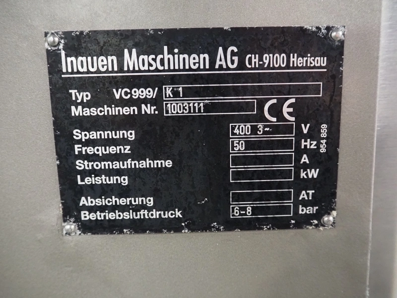 Inauen Maschinen AG belt vacuum machine, type: VC999/K 1, machine number: 1003111, 400 V, 3 Ph, 50 Hz, 6-8 bar, plastic belt, belt width: 550 mm, total dimensions: 2800 mm x 1050 mm x 1140 mm.