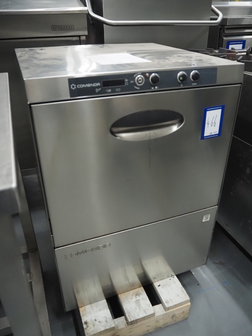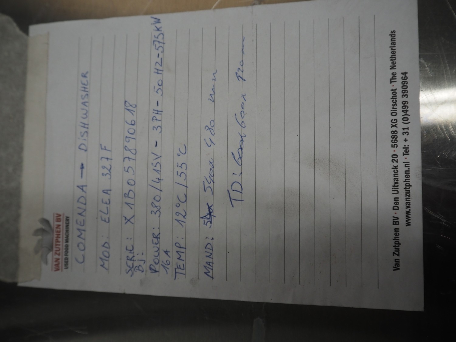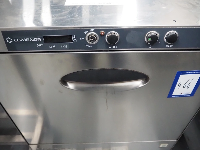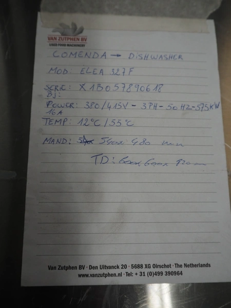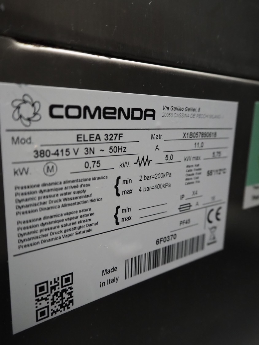 Comenda dishwasher, model: ELEA 327F, serial number: X1B057890618, 380*415 V, 3 Ph, 50 Hz, 11 A, 5 kW, dimensions: 600 mm x 600 mm x 820 mm.