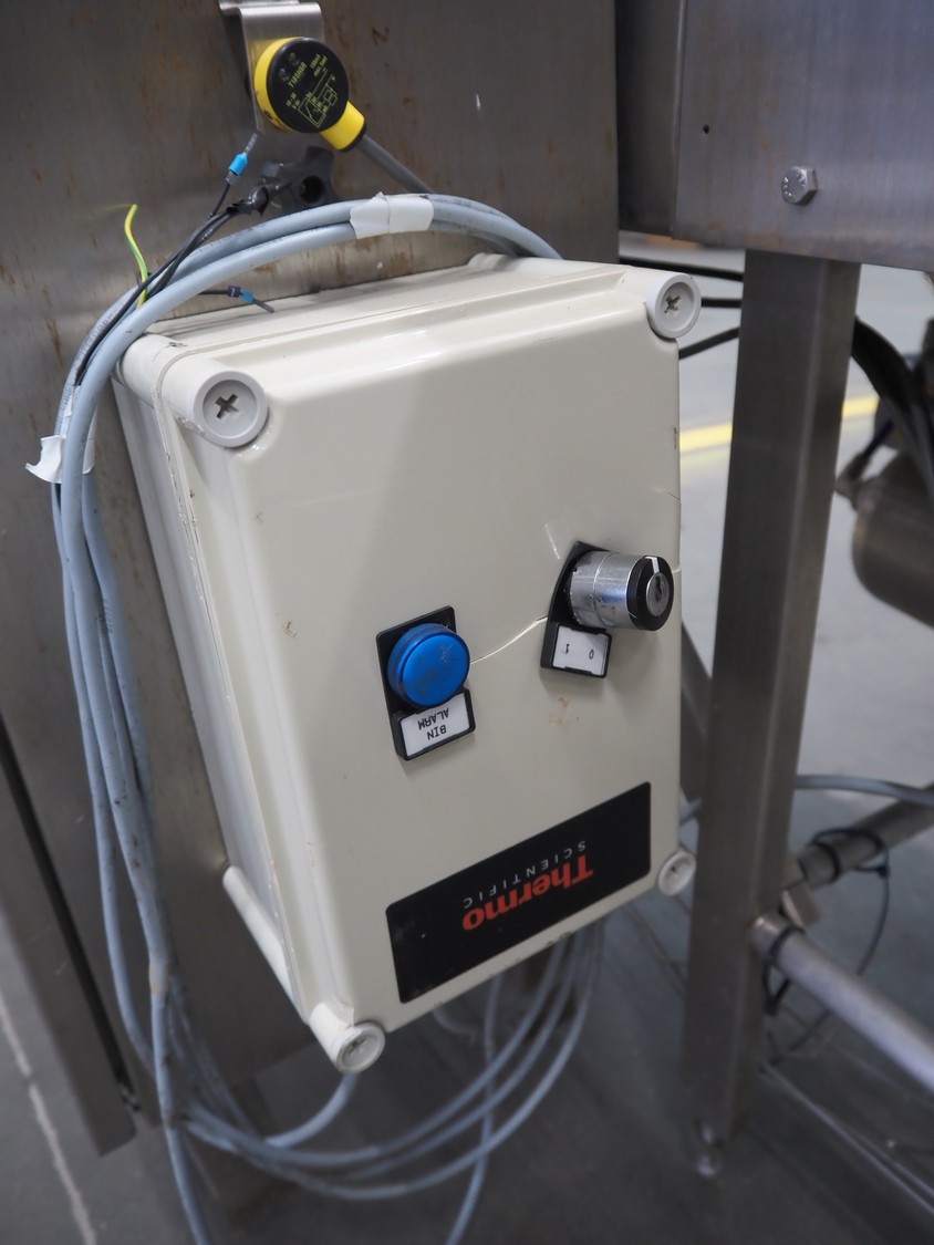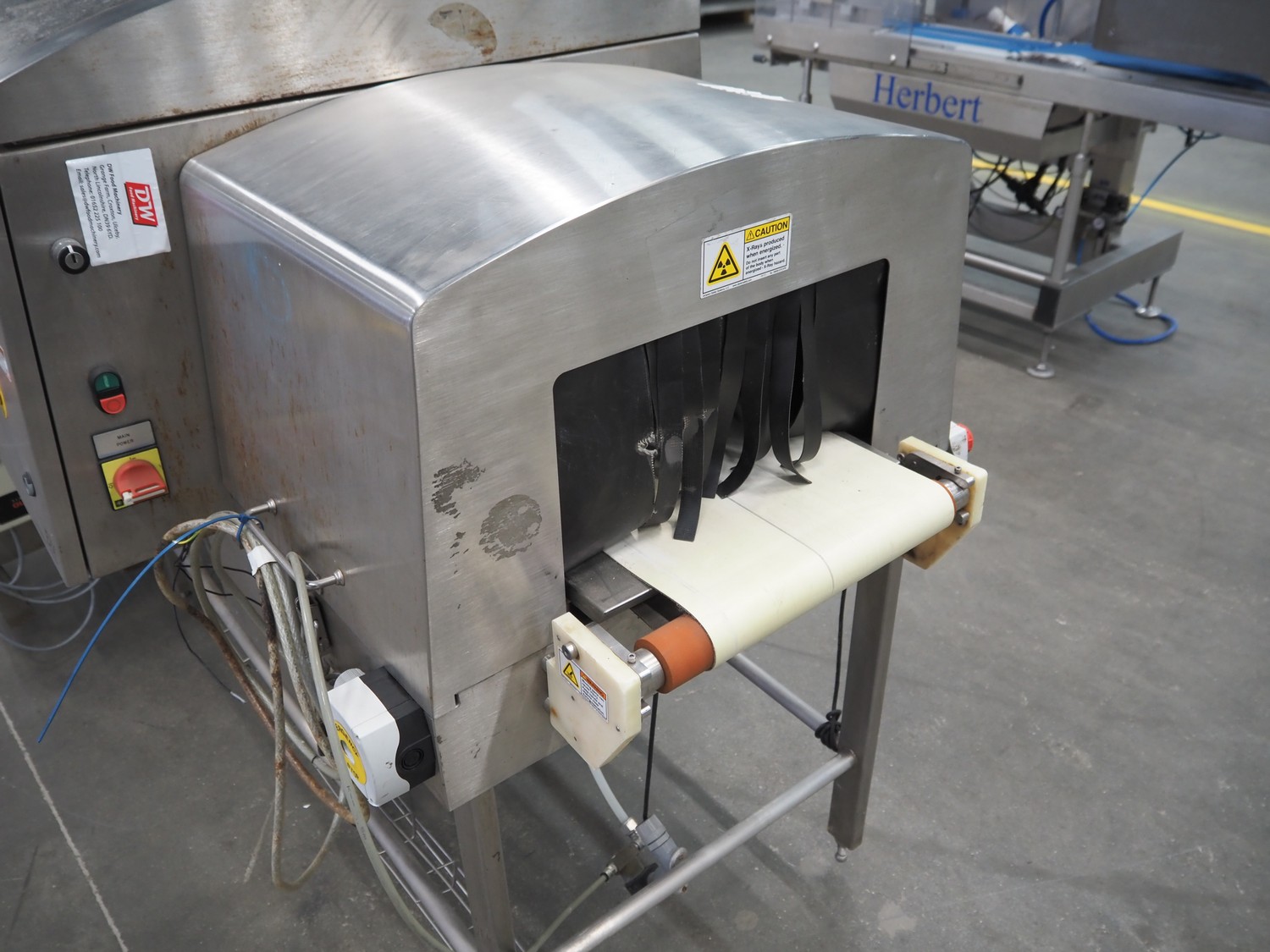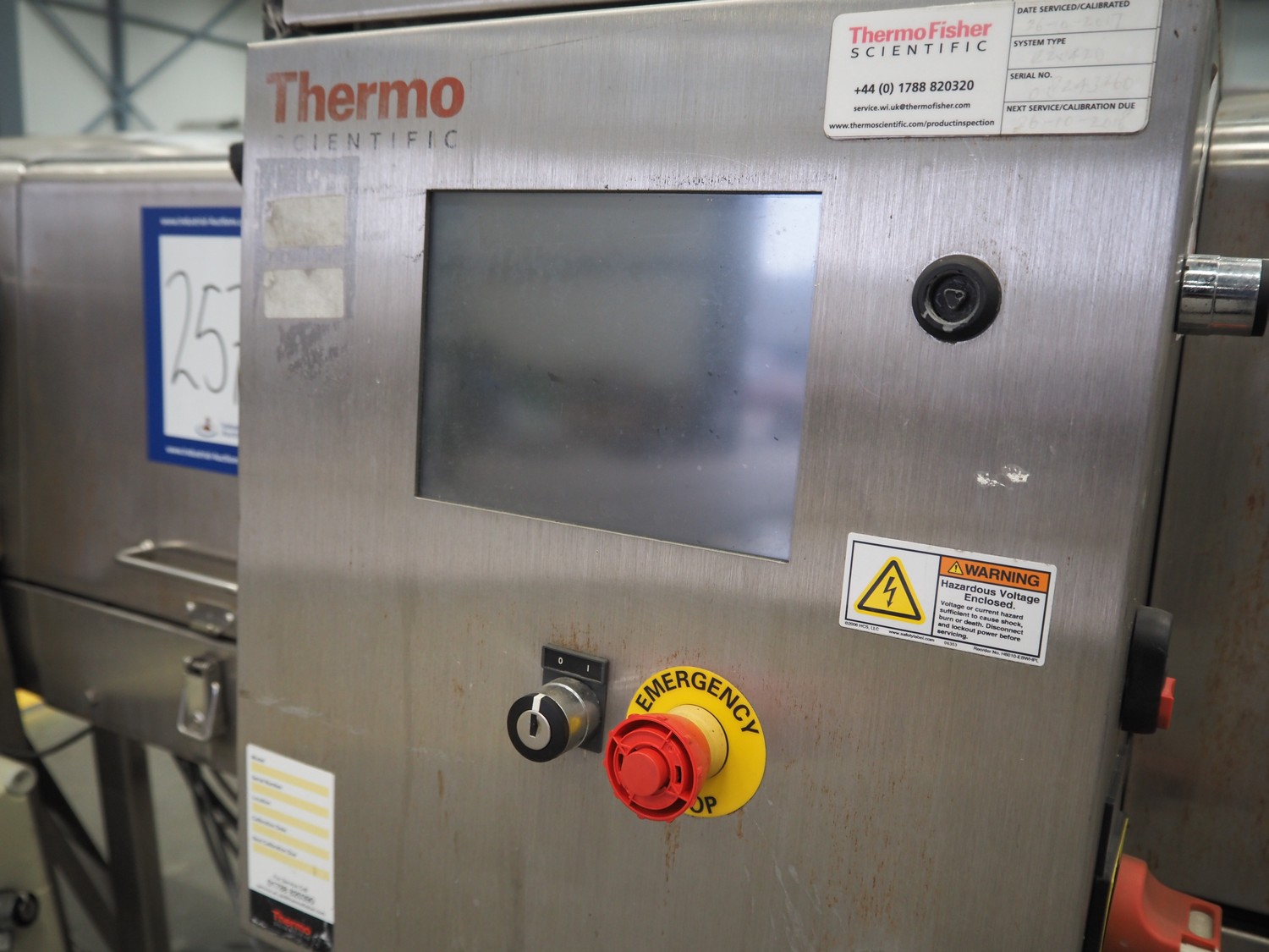 Thermo Fischer x-ray scanner with rejecter, type: EZX 420, serial number: 08243260, year of construction: JUNE 2008, 100-240 V, 50//60 Hz, 7.5-15 A, plastic belt, belt width: 310 mm, clearance: 380 mm x 190 mm, total dimensions: 2000 mm x 1100 mm x 1730 mm.
