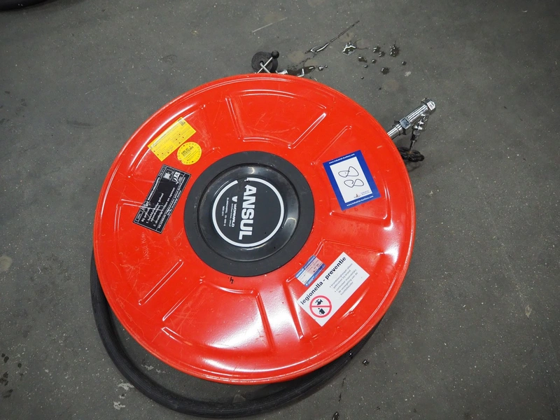 Ansul hose reel with hose, dimensions: 600 mm x 600 mm x 150 mm.