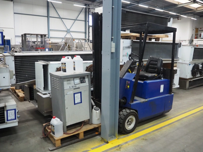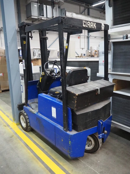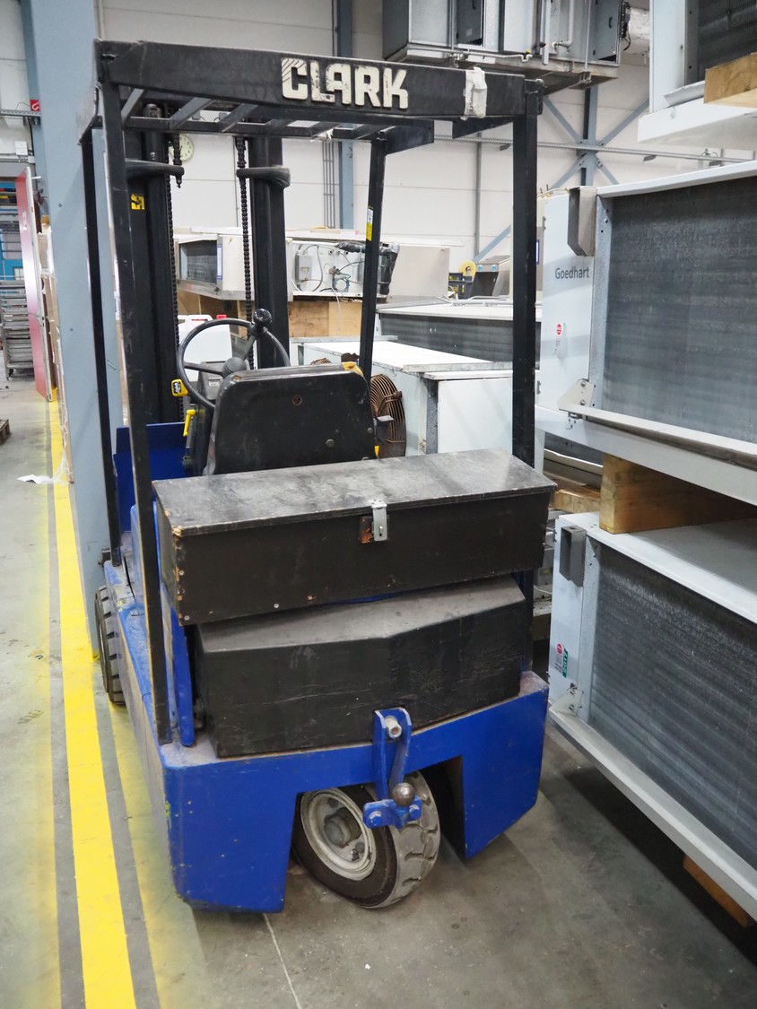 Clark forklift, model: IM 15N, serial number: IM145-7686-GFF, capacity: 1500 kg, fork length: 1000 mm, total dimensions: 2800 mm x 1100 mm x 2150 mm. Including battery charger.