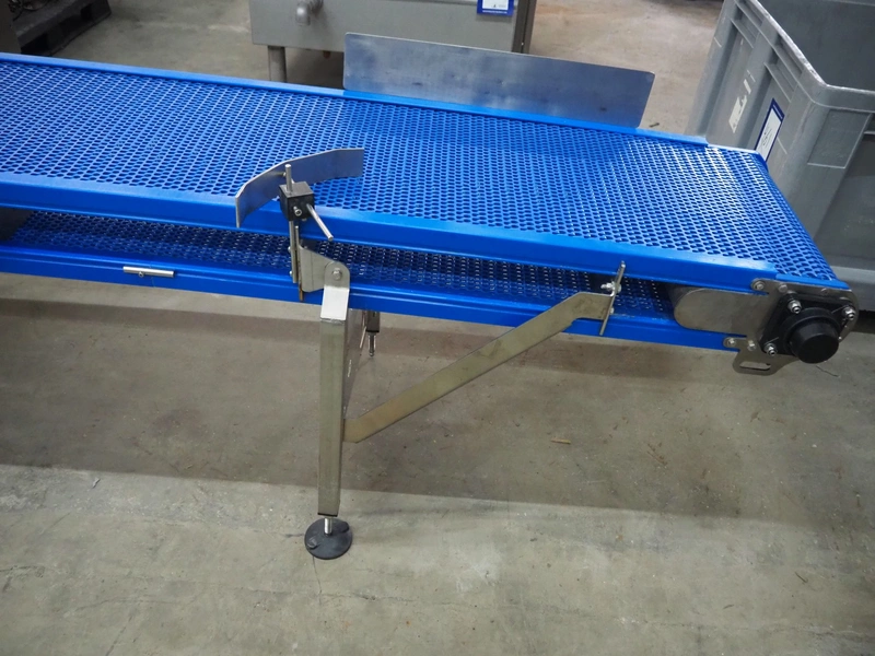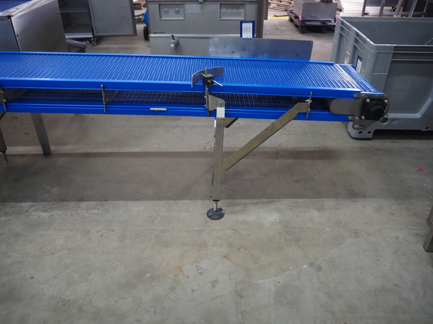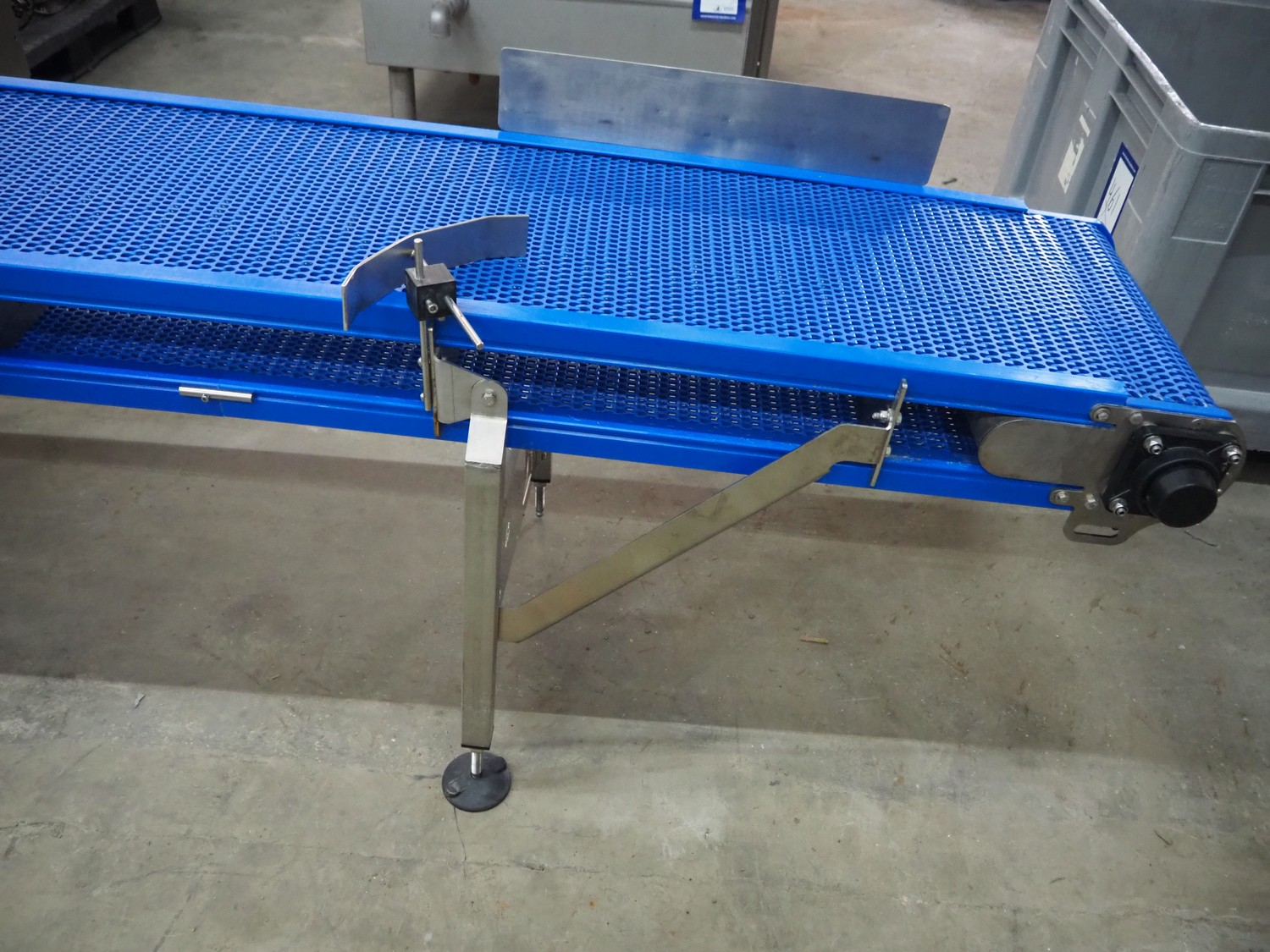 Freshtech Solutions 90° curved conveyor, model: Food Schakelband, serial number: 19003, year of construction: 2019, s/s frame, plastic mesh belt, belt width: 430 mm, total dimensions: 1950 mm x 5200 mm x 900 mm.