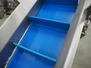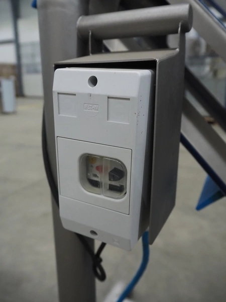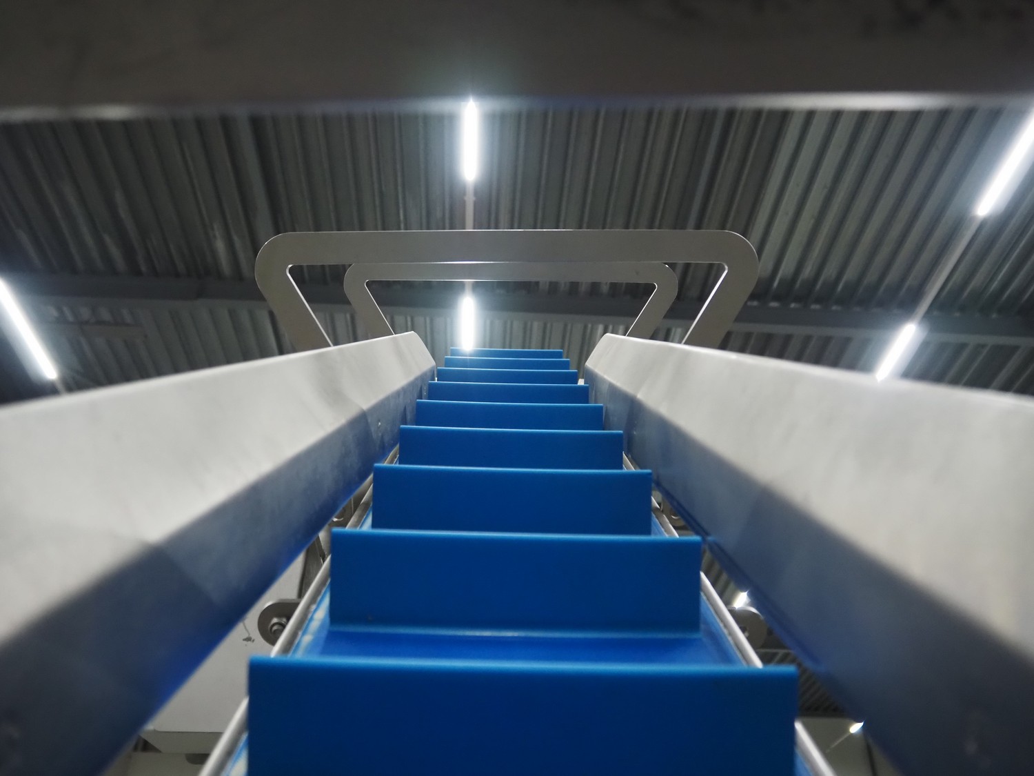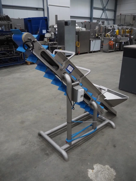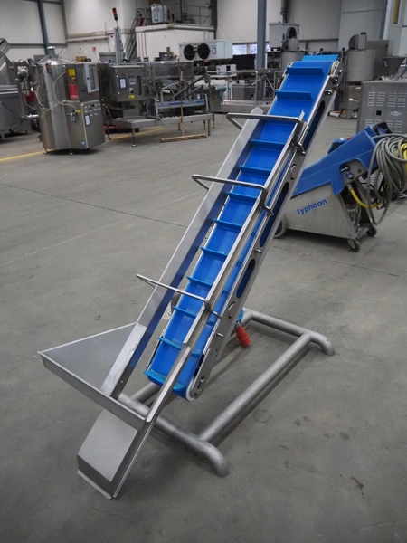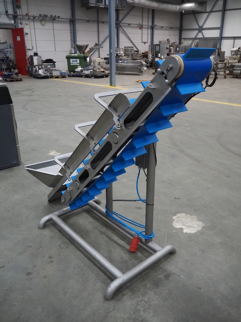 Elevating belt with dividers, s/s frame, plastic belt, belt width: 210 mm, elevating height: 1400 mm, distance between dividers: 140 mm, divider height: 50 mm, total dimensions: 1500 mm x 700 mm x 1550 mm.