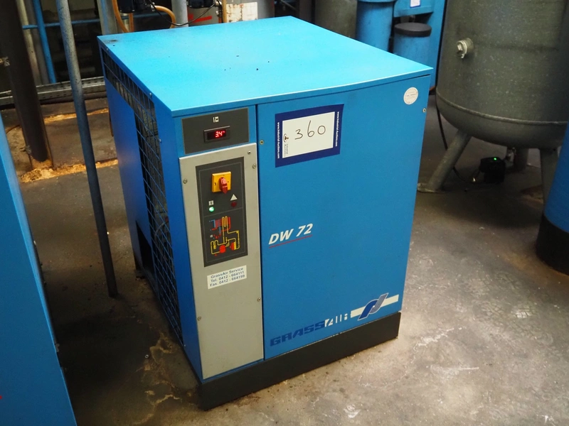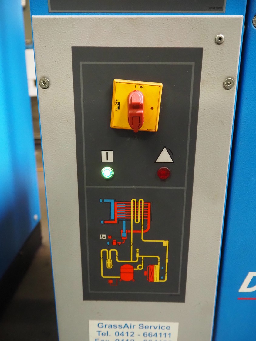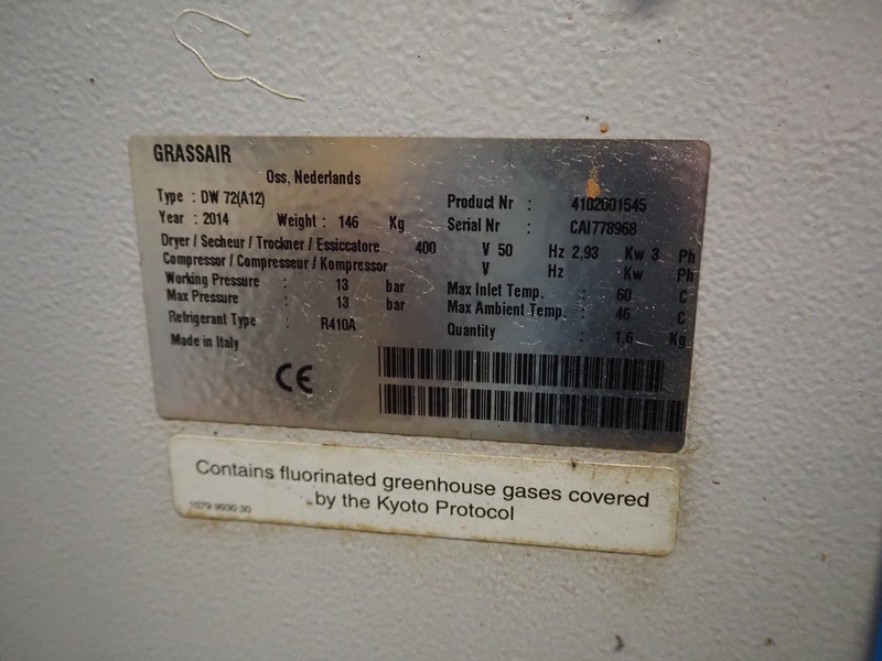 Grassair air dryer, type: DW 72 (A12), serial number: CAI778968, year of construction: 2014, 400 V, 3 Ph, 50 Hz, 2.93 kW, maximum working pressure: 13 bar, refrigerant: R410A (1.6 kg), dimensions: 750 mm x 850 mm x 980 mm.