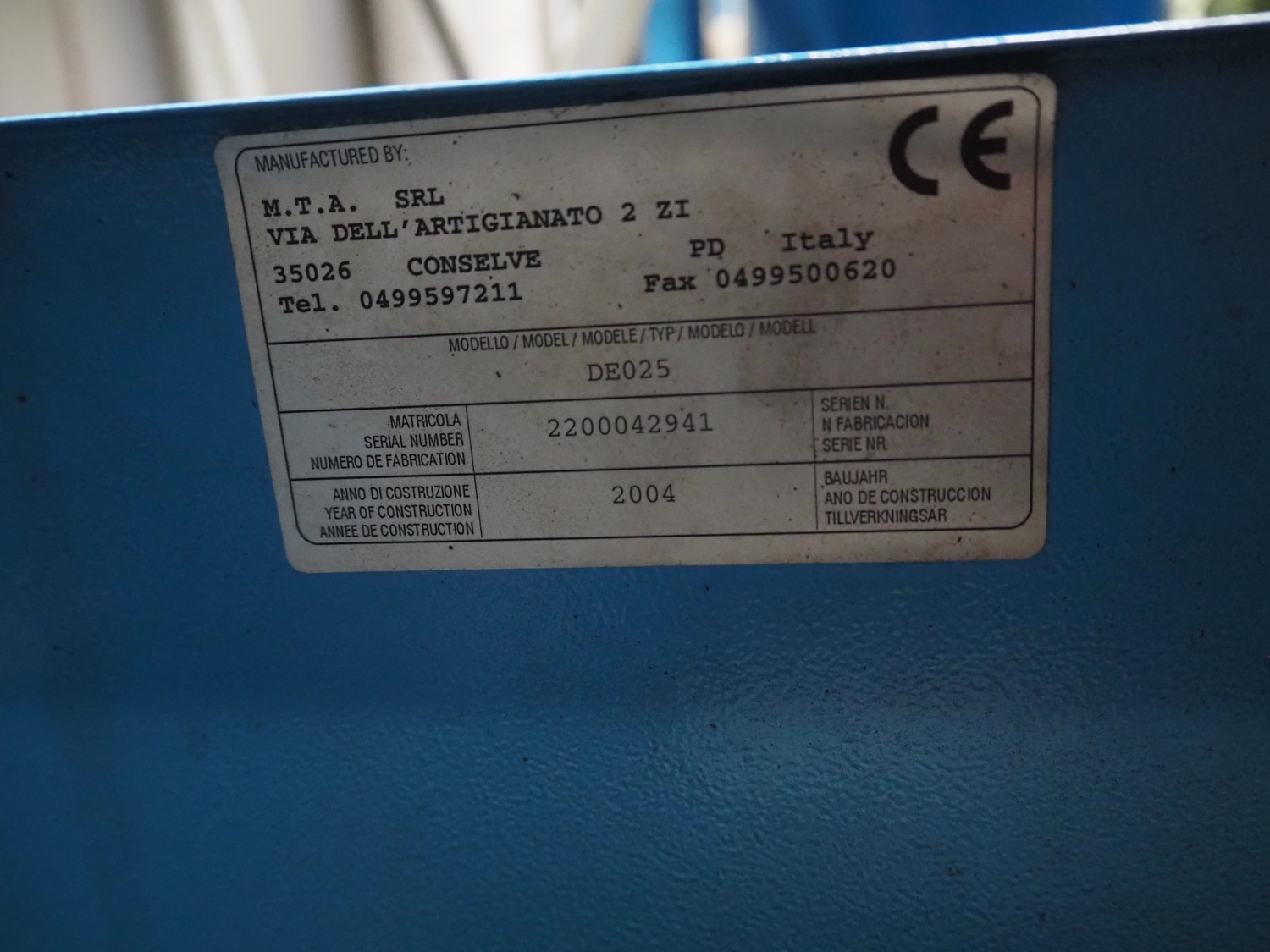 M.T.A. SRL air dryer, type: DE025, serial number: 2200042941, year of construction: 2004, dimensions: 650 mm x 400 mm x 800 mm.