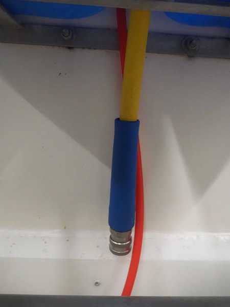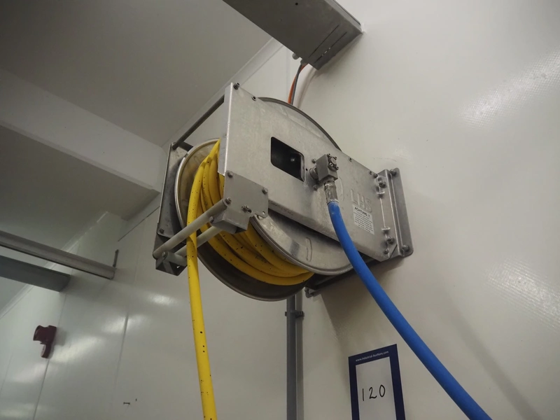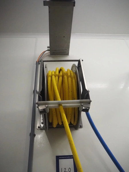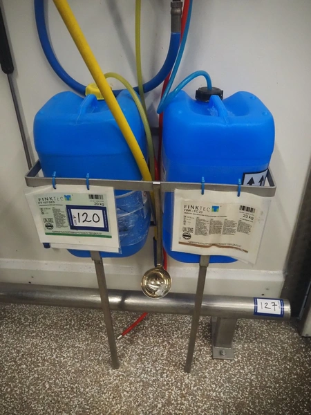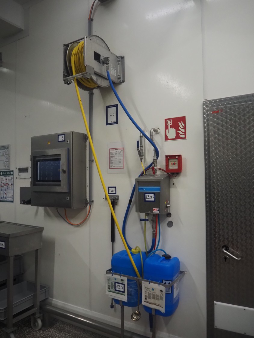 Hygiene station consisting of LHS s/s hose reel with hose, type: ST40/12/2ep-eco, working pressure: 200 bar, dimensions hose reel: 550 mm x 400 mm x 500 mm, Foamico soap mixing station, dimensions: 260 mm x 200 mm x 350 mm, s/s wall mounted frame for jerry cans and s/s wall mounted peg for spraying pistols.