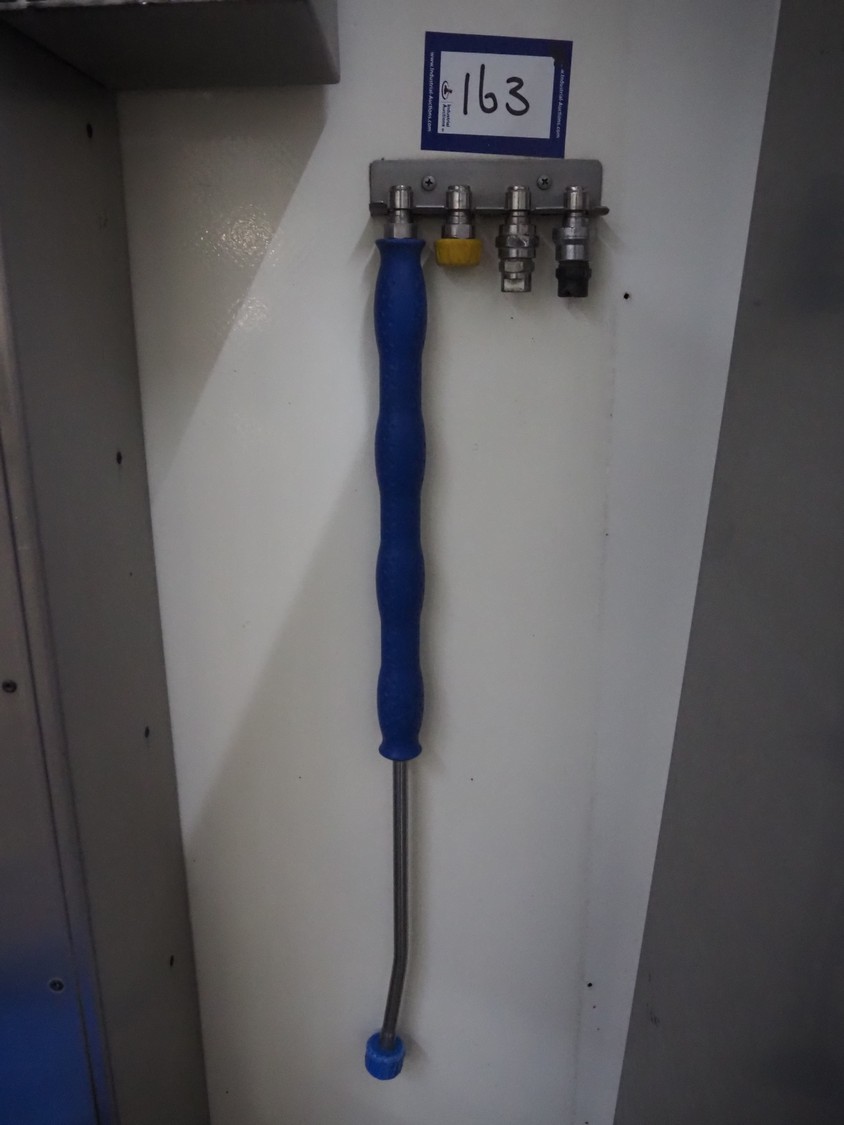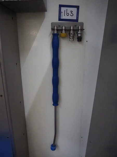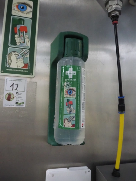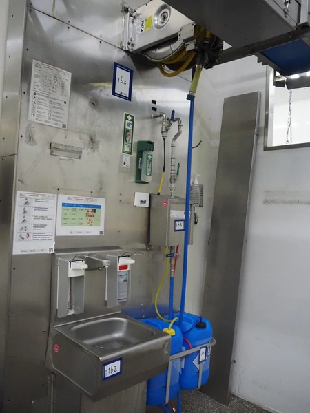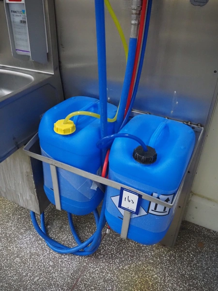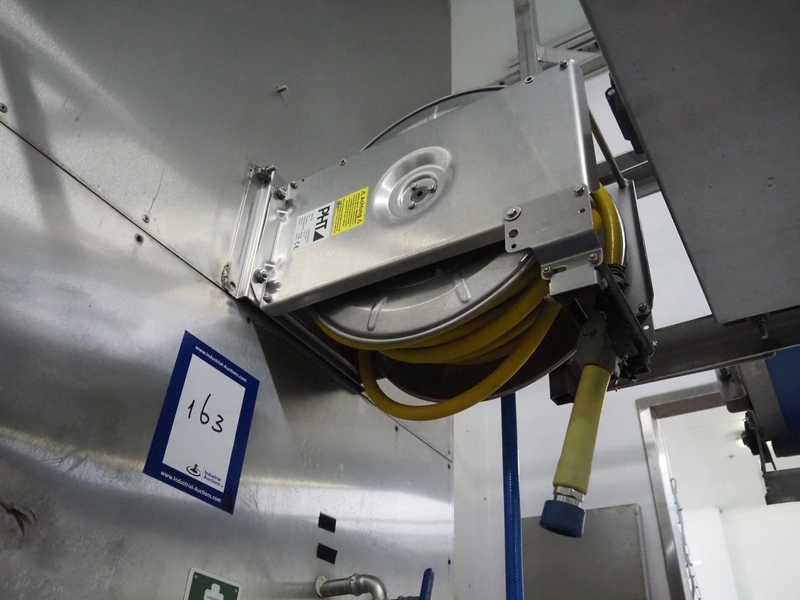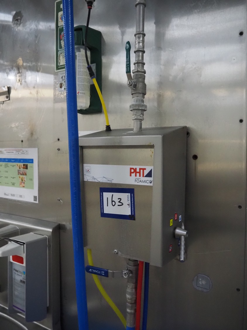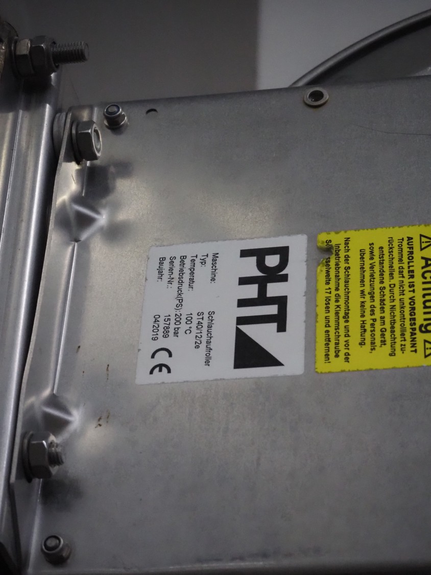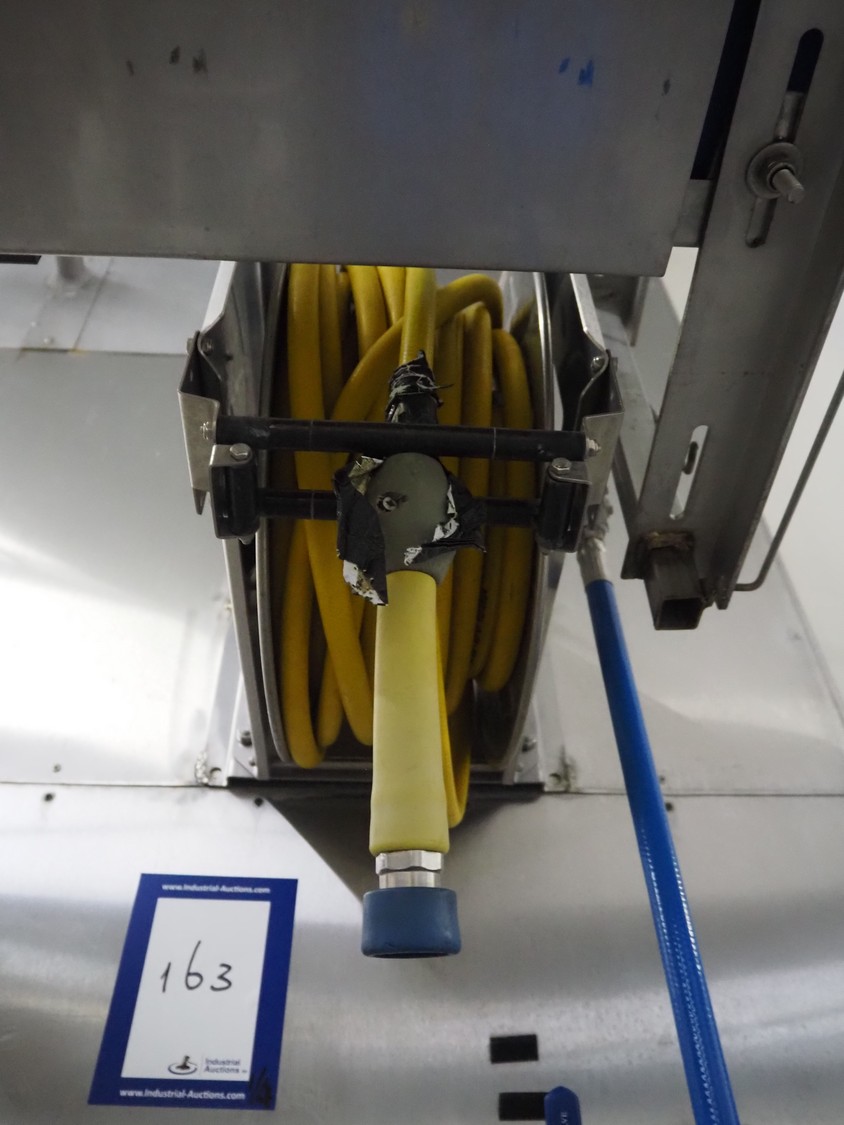 Hygiene station consisting of PHT s/s hose reel with hose and pistol, type: ST40/12/2e, serial number: 157889, year of construction: 04/2019, working pressure: 200 bar, dimensions: 530 mm x 400 mm x 500 mm. Including Foamico s/s soap mixing station, dimensions soap mixing station: 260 mm x 180 mm x 400 mm, frame for jerry cans and steel waste bin.
