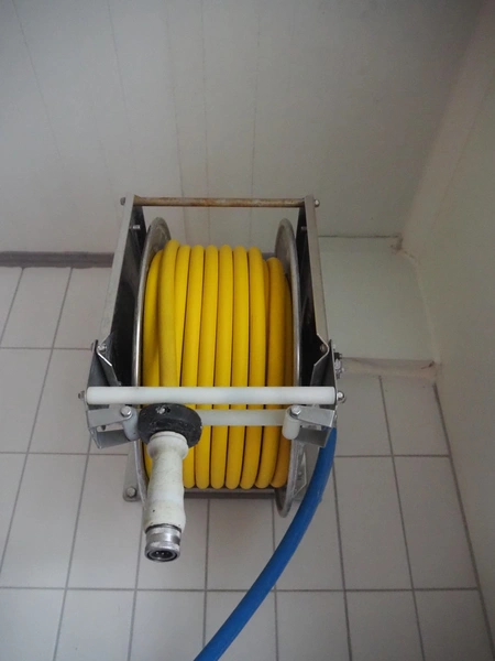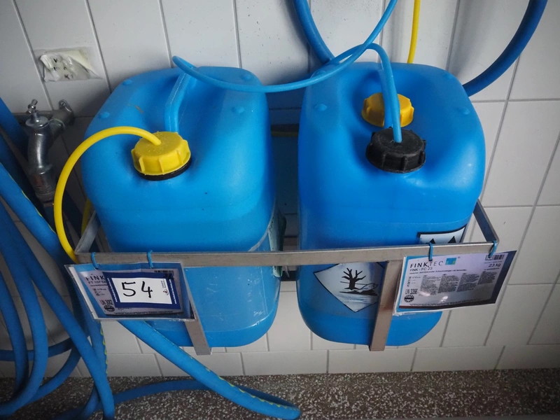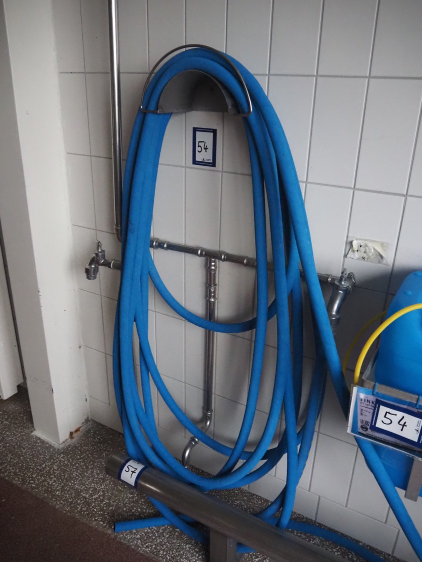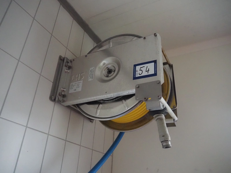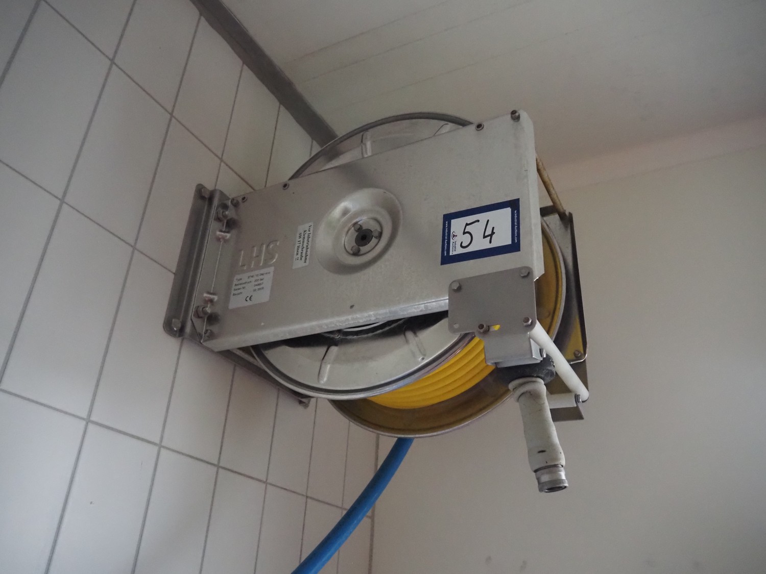 Hygiene station consisting of LHS s/s hose reel with hose, type: ST40/12/2ep-eco, serial number: 049657, year of construction: 2005, pressure: 200 bar, dimensions hose reel: 550 mm x 400 mm x 500, Ecolab soap mixing station, dimensions: 400 mm x 150 mm x 330 mm, s/s wall mounted frame for jerry cans and s/s hose reel with plastic hose.