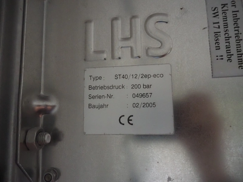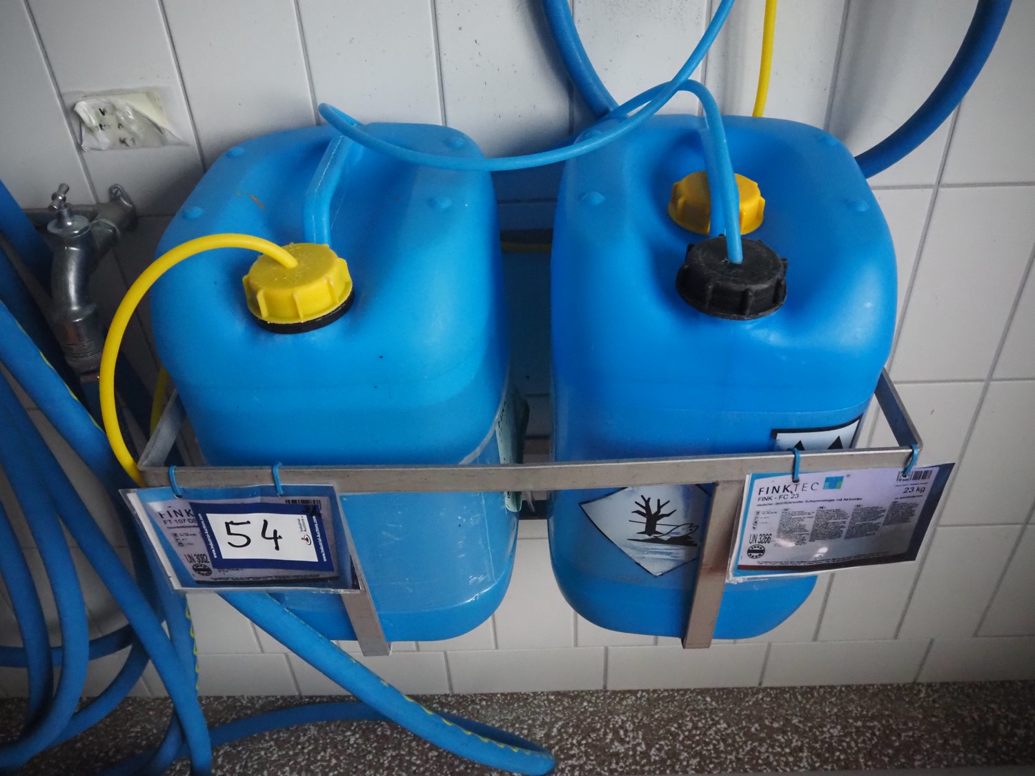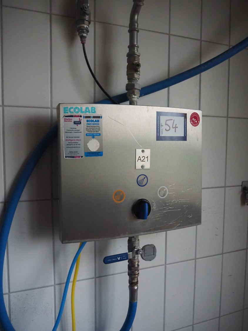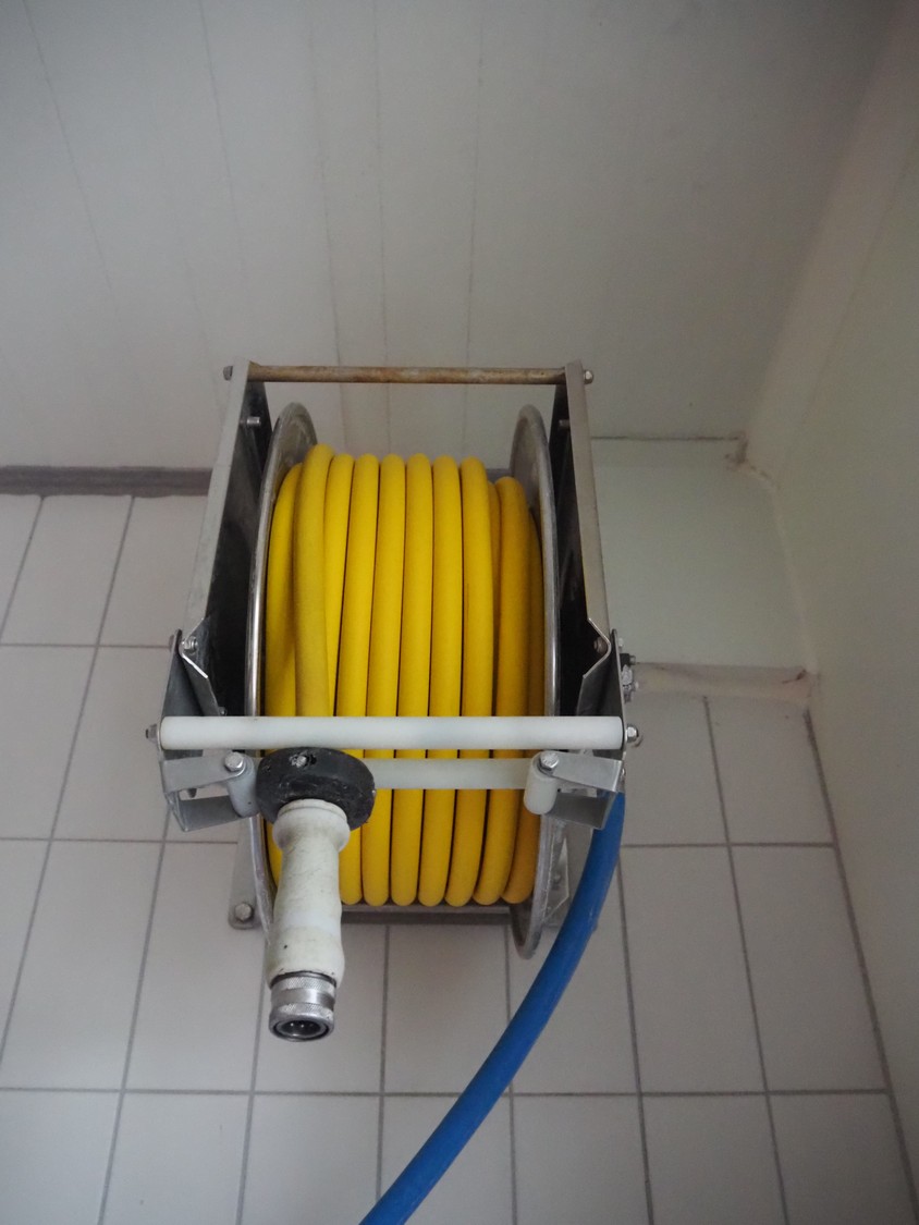 Hygiene station consisting of LHS s/s hose reel with hose, type: ST40/12/2ep-eco, serial number: 049657, year of construction: 2005, pressure: 200 bar, dimensions hose reel: 550 mm x 400 mm x 500, Ecolab soap mixing station, dimensions: 400 mm x 150 mm x 330 mm, s/s wall mounted frame for jerry cans and s/s hose reel with plastic hose.