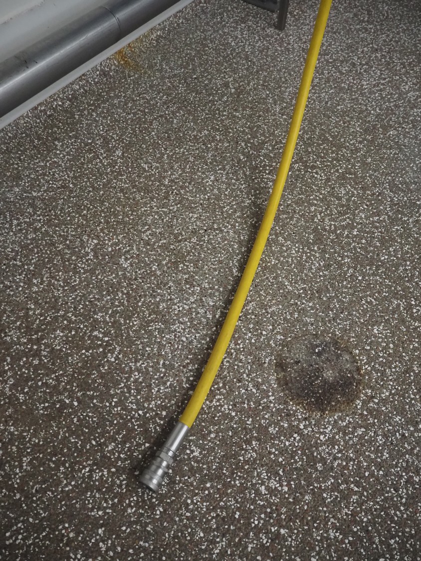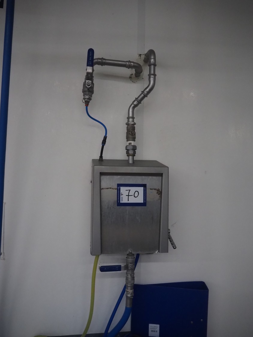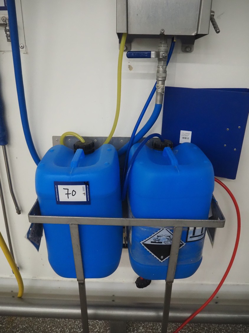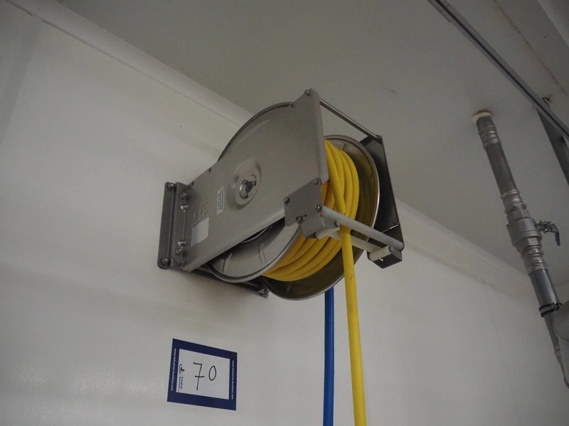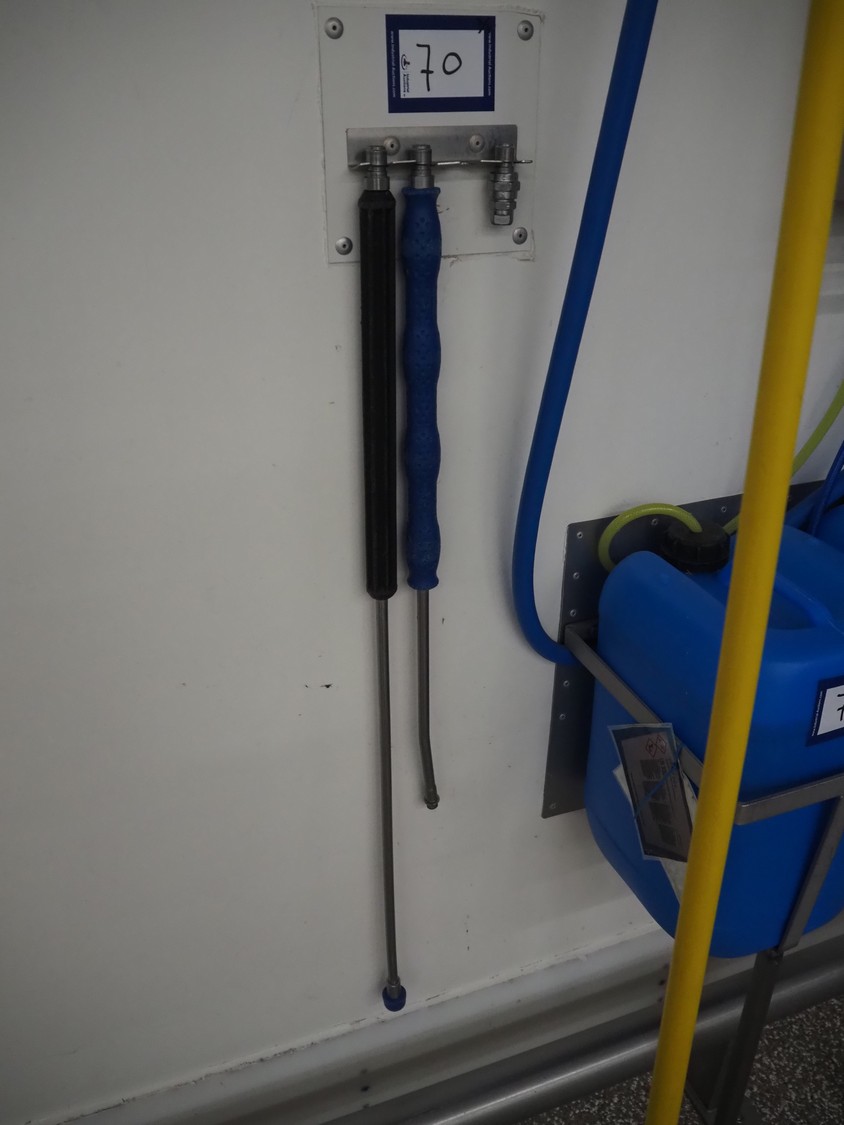 Hygiene station consisting of LHS s/s hose reel with hose and pistol, dimensions hose reel: 550 mm x 400 mm x 500, Foamico soap mixing station, dimensions: 260 mm x 200 mm x 350 mm, s/s wall mounted frame for jerry cans and s/s wall mounted peg for spraying pistols.