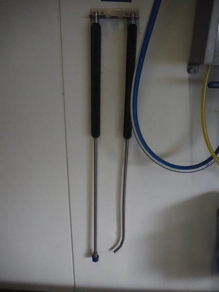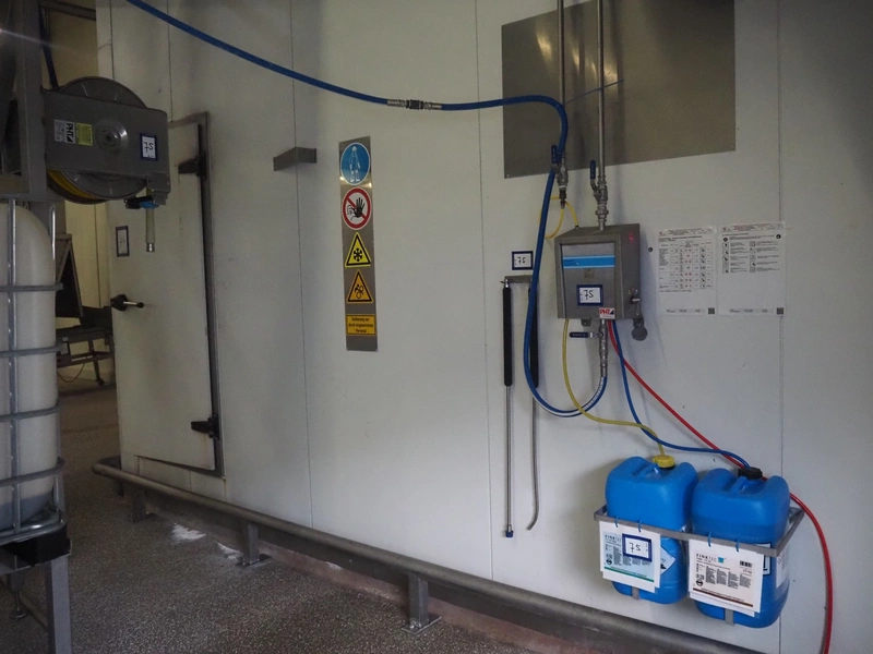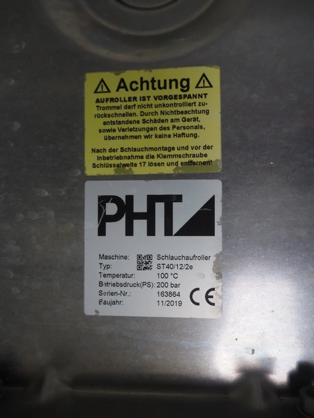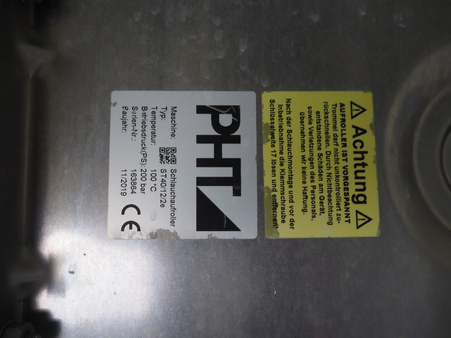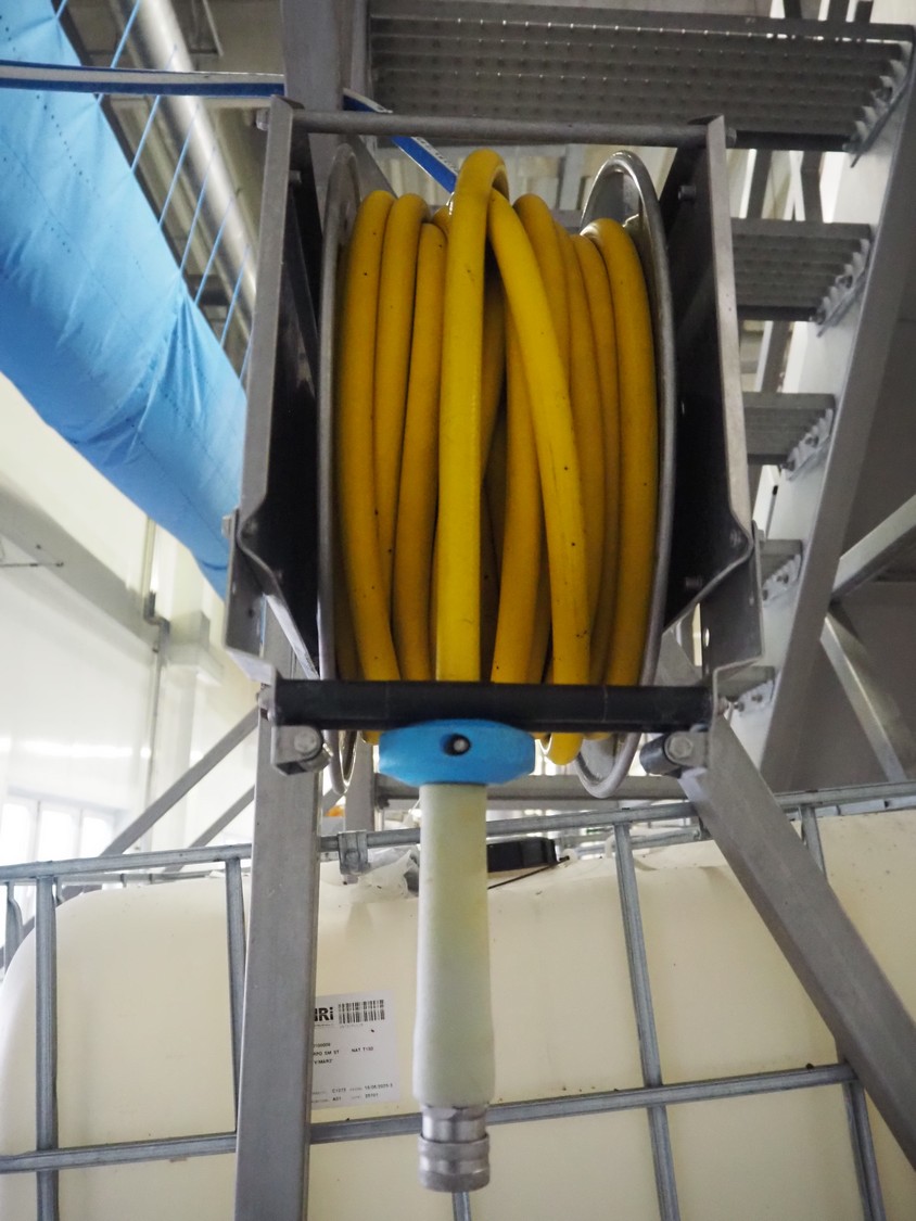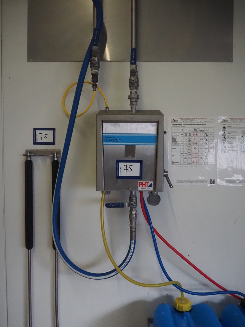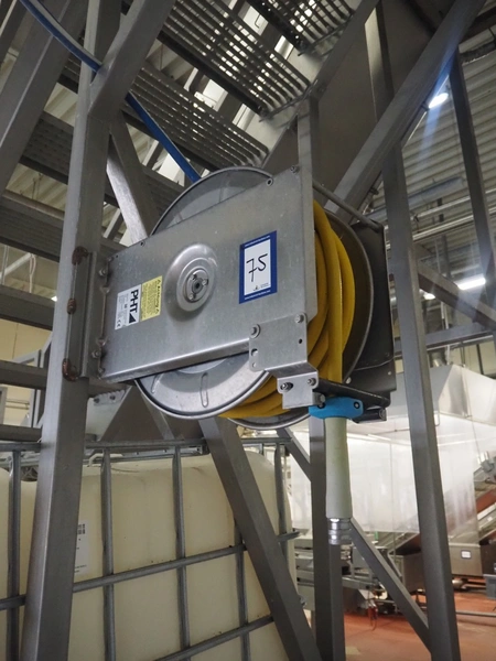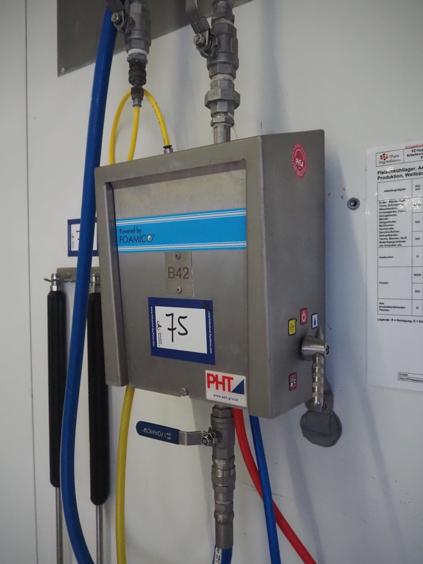 Hygiene station consisting of PHT s/s hose reel with hose and pistol, type: ST40/12/2e, serial number: 163864, year of construction: 2019, maximum pressure: 200 bar, dimensions hose reel: 550 mm x 400 mm x 500 mm, Foamico soap mixing station, dimensions: 260 mm x 200 mm x 350 mm, s/s wall mounted frame for jerry cans and s/s wall mounted peg for spraying pistols.