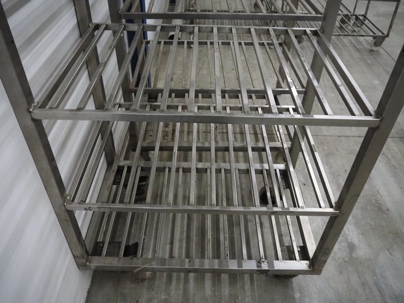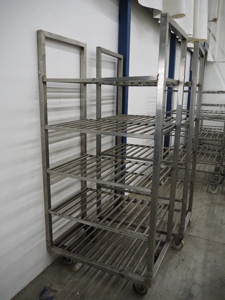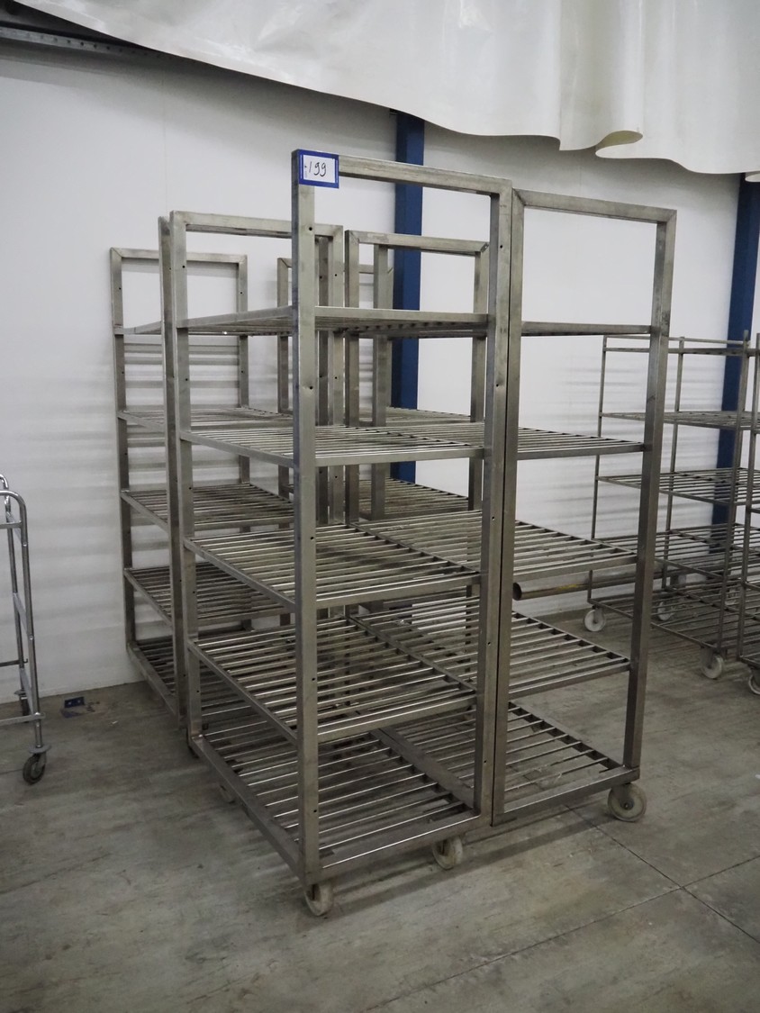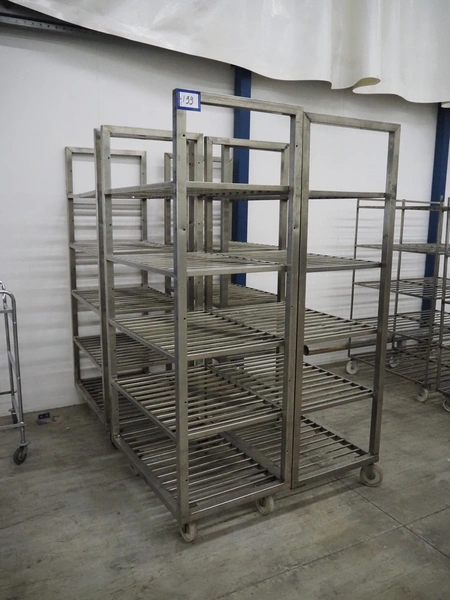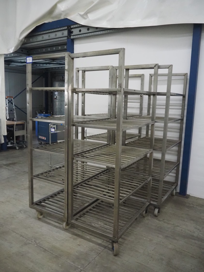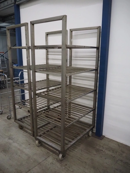 4 s/s trolleys, 5 floors, dimensions floors: (5x) 870 mm x 600 mm, total dimensions: (4x) 950 mm x 600 mm x 1950 mm.