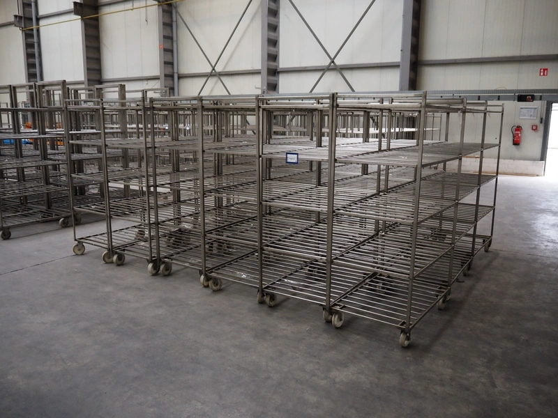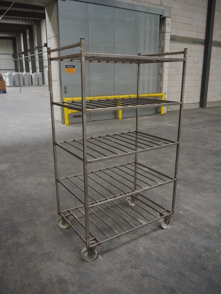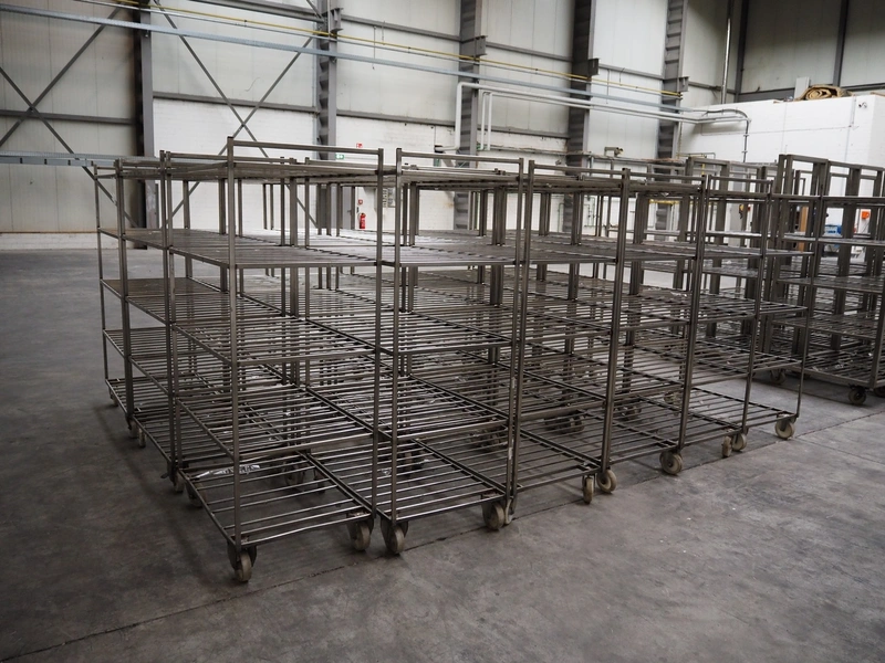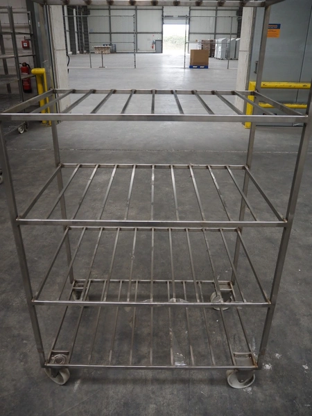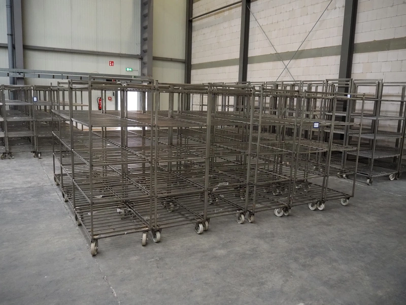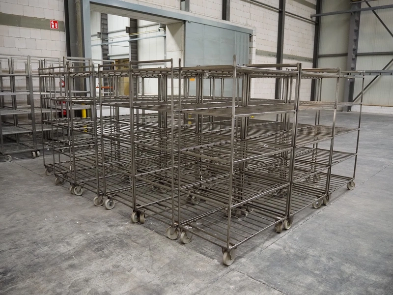 18 s/s trolleys, 5 floors, floor dimensions: (5x) 910 mm x 600 mm, total dimensions: (18x) 950 mm x 600 mm x 1650 mm.
