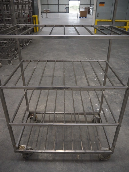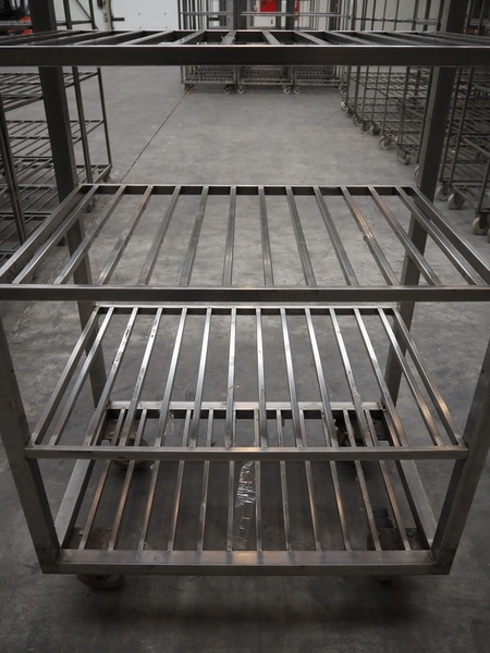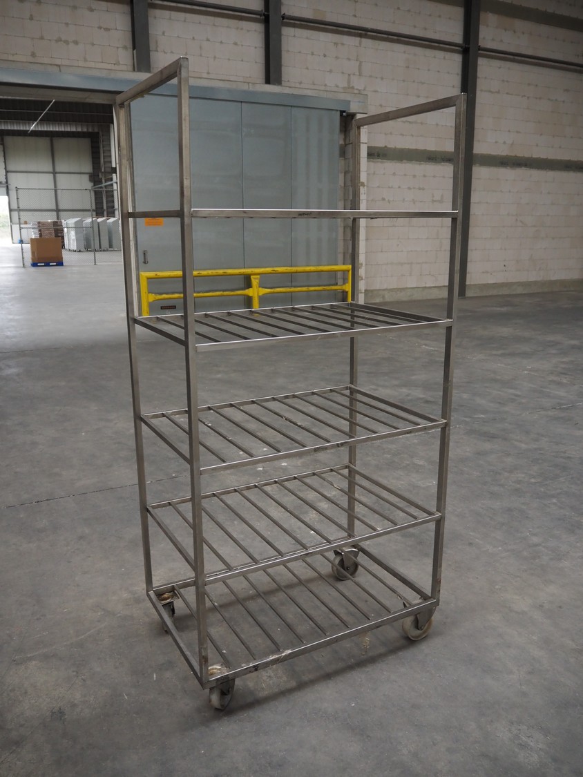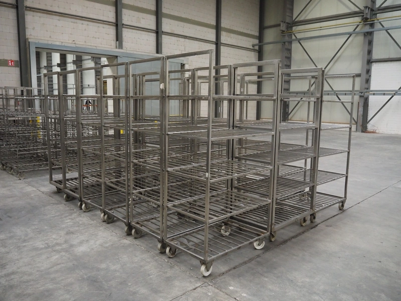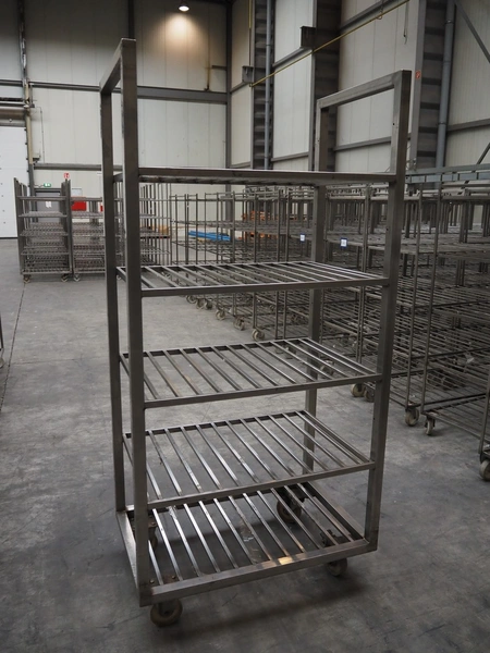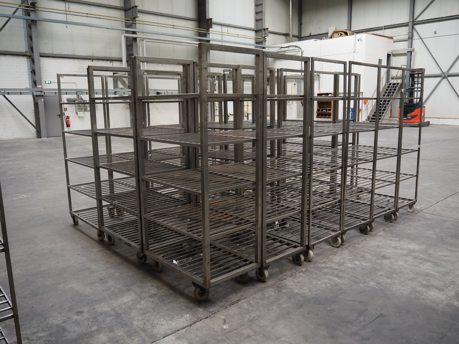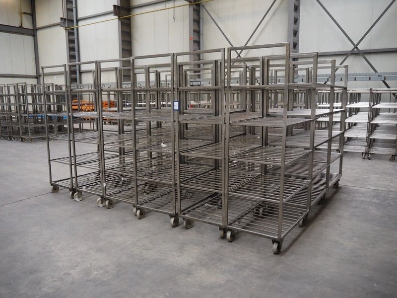18 s/s trolleys, 5 floors, floor dimensions: (5x) 910 mm x 600 mm, total dimensions: (18x) 950 mm x 600 mm x 1950 mm.