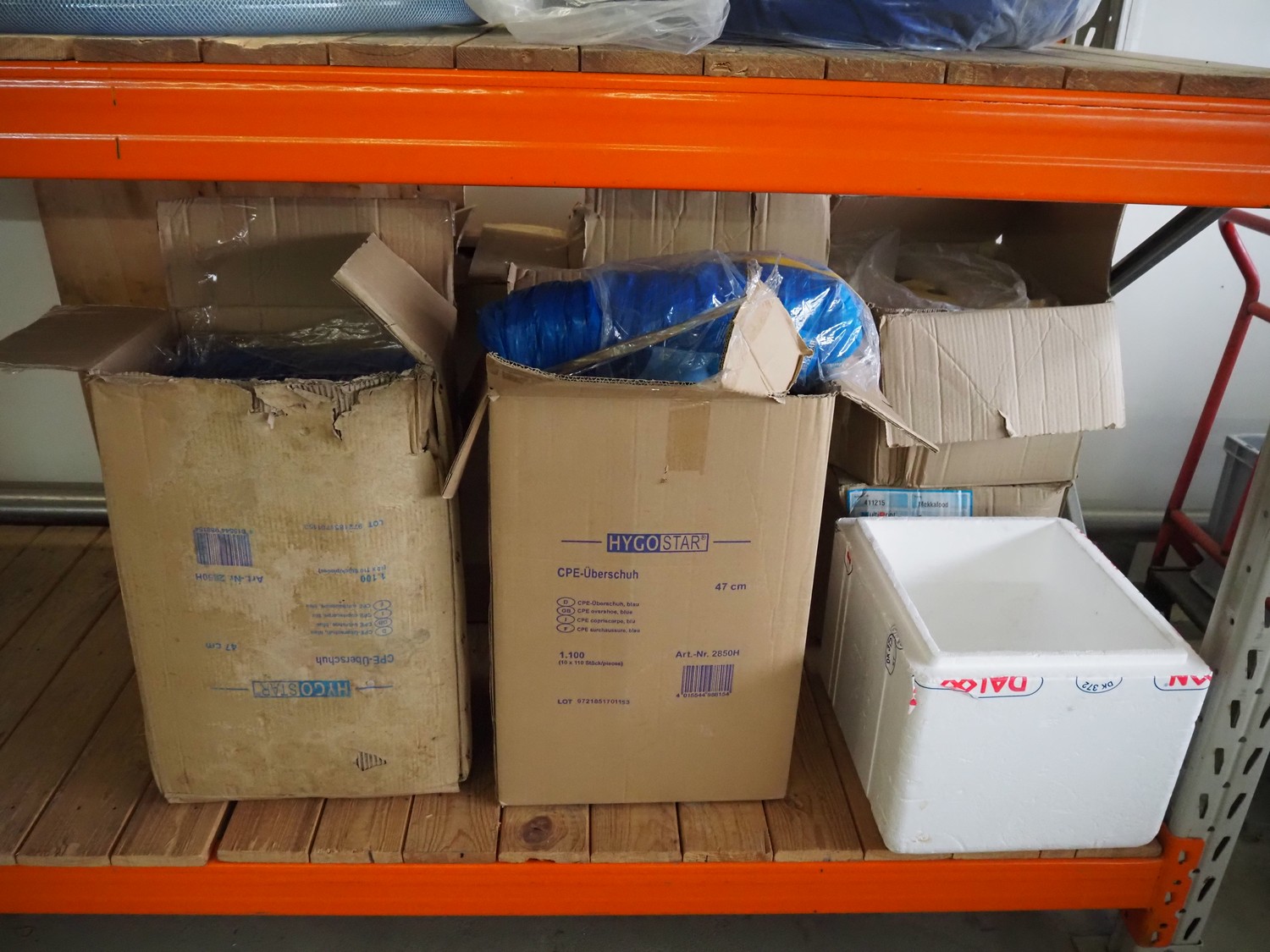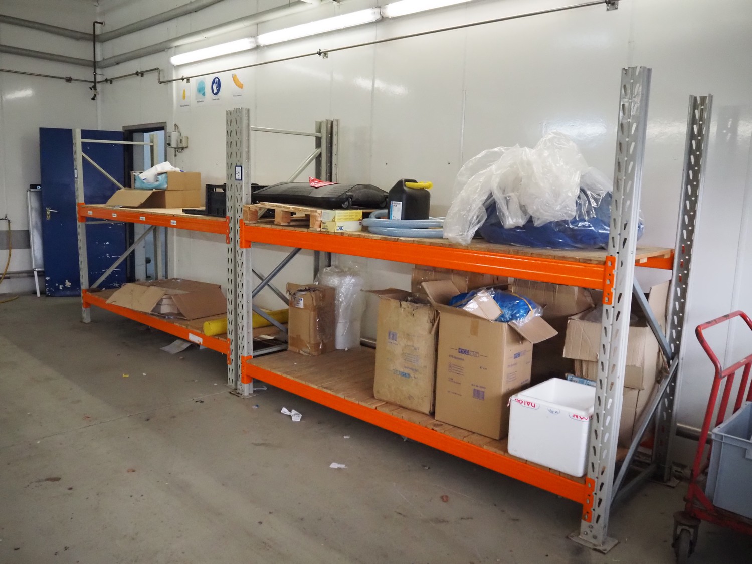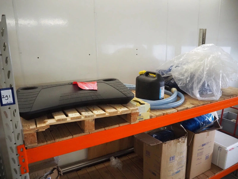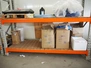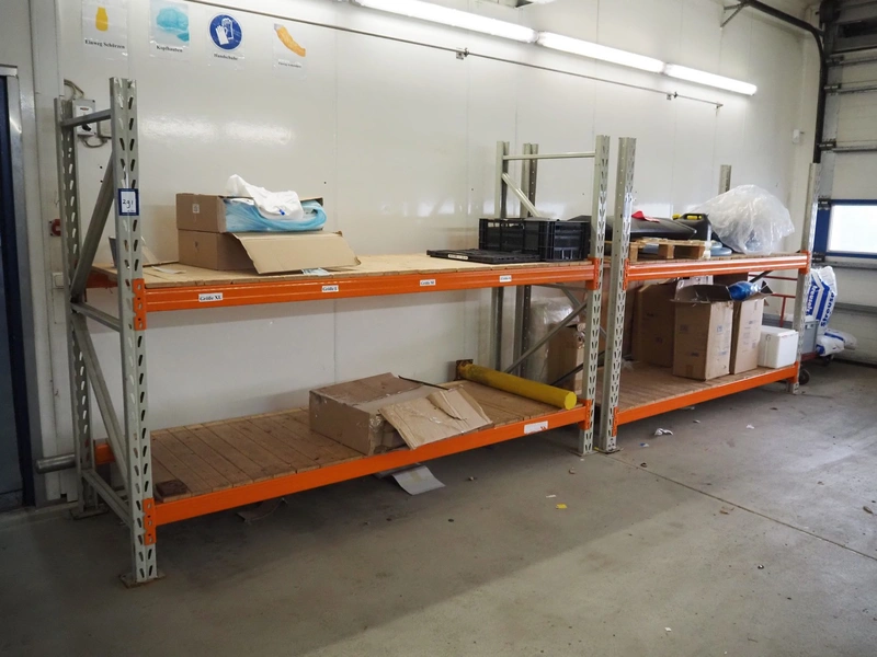 2 steel racks with wooden floors, consisting of: 2 uprights and 4 beams each, floors dimensions: (4x) 2680 mm x 900 mm, total dimensions: (2x) 2900 mm x 900 mm x 2000 mm. Including various content.
