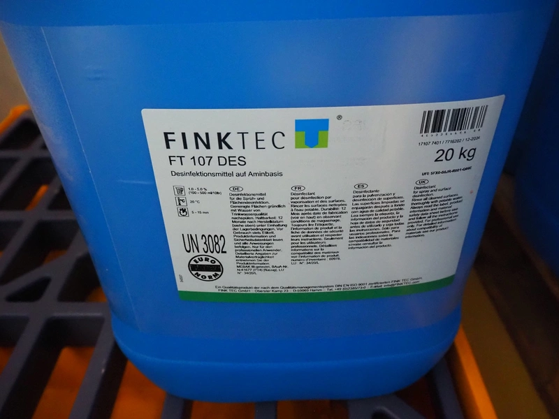 3 jerry cans with FINKTEC FT 107 DES disinfectant for spray and surface disinfection, dimensions: (3x) 300 mm x 250 mm x 420 mm.
