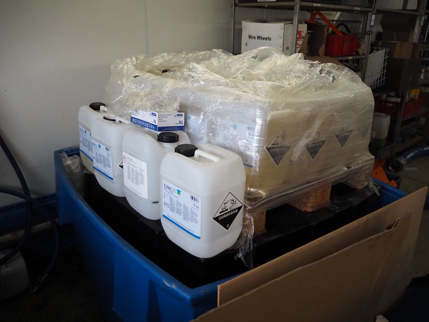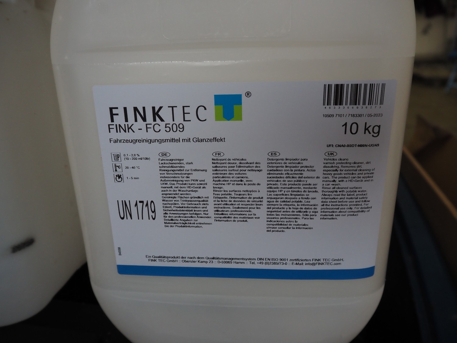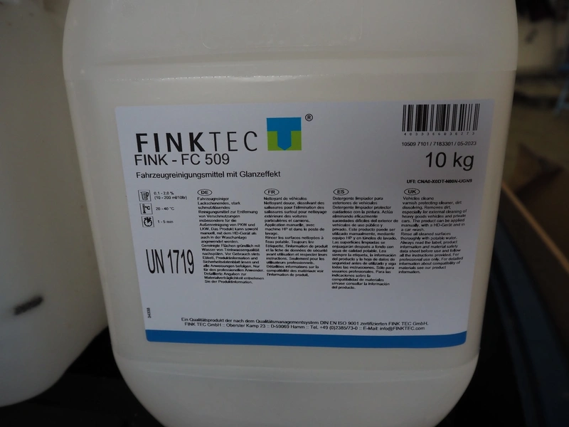 Pallet with 17 FINKTEC jerrycans with vehicle cleaner, type: FC 509, dimensions pallet: 1200 mm x 800 mm x 450 mm.