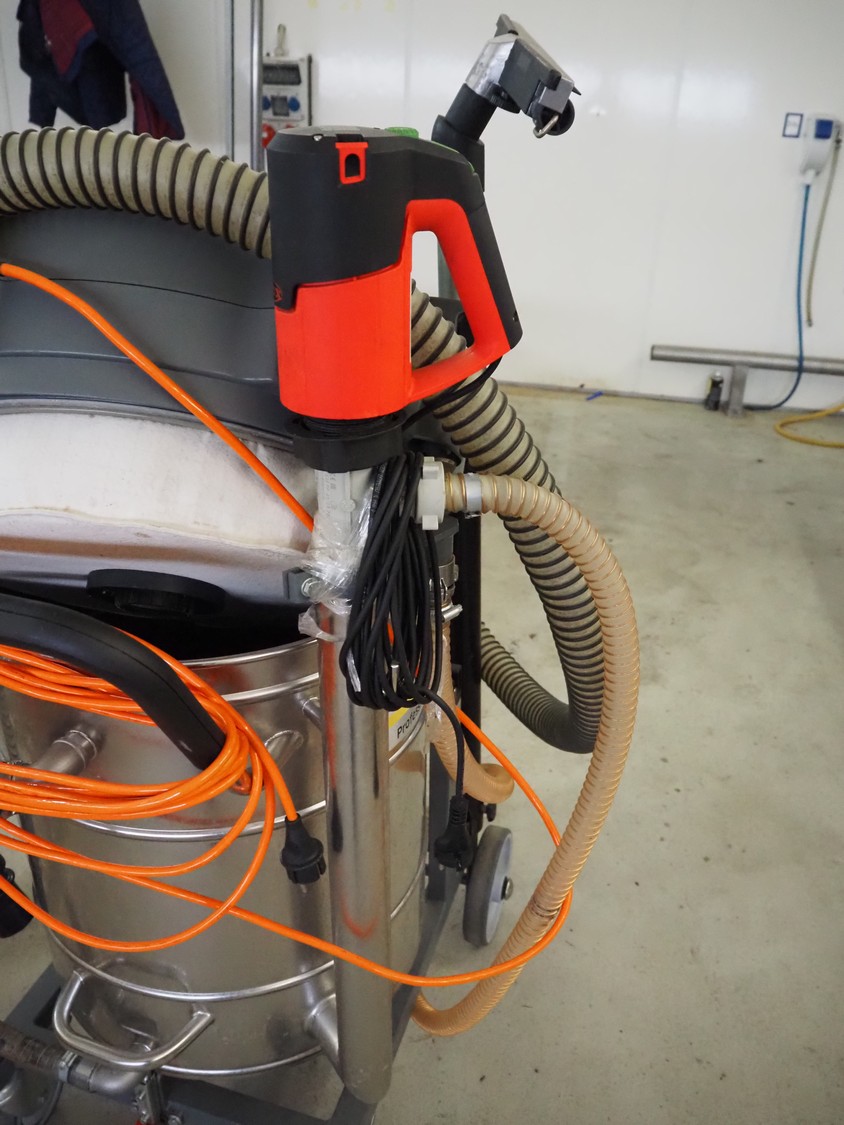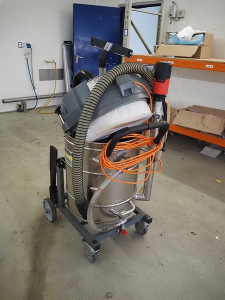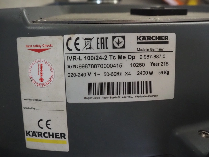Kärcher industrial vacuum machine, type: IVR-L 100/24-2 Tc Me Dp, serial number: 99878870000415, year of construction: 2021, 220-240 V, 1 Ph, 50/60 Hz, 2400 W, 56 kg, dimensions: 750 mm x 650 mm x 1400 mm.