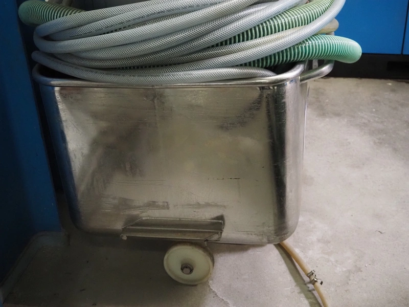 S/s meat bin, volume: 200 liter, including barrel with used oil.