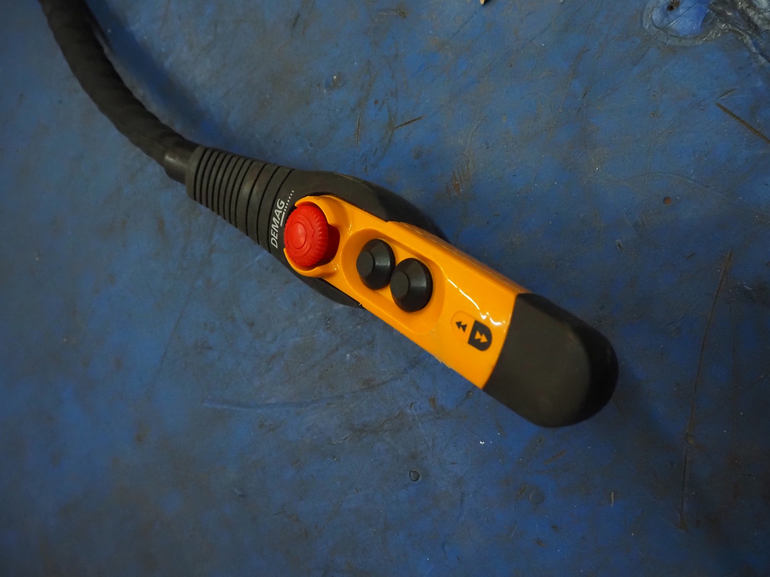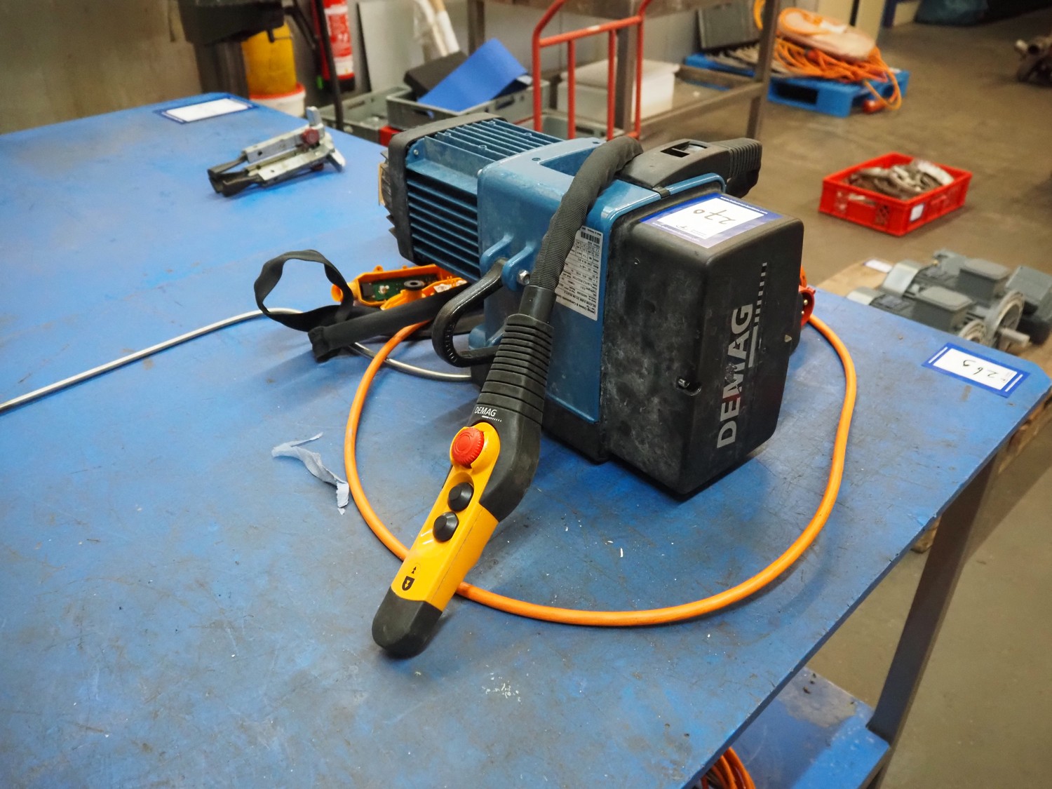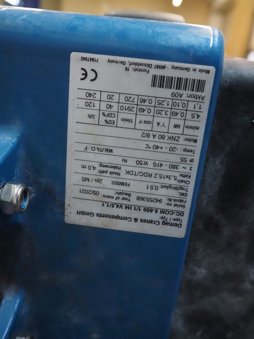 Demag hoist, type: DC-COM 5-500 1/1 H4 V4.5/1.1, serial number: 942255368, year of construction: 05/2021, 380-415 V, 50 Hz, hook path: 4 meter, capacity: 500 kg, dimensions: 500 mm x 300 mm x 500 mm.