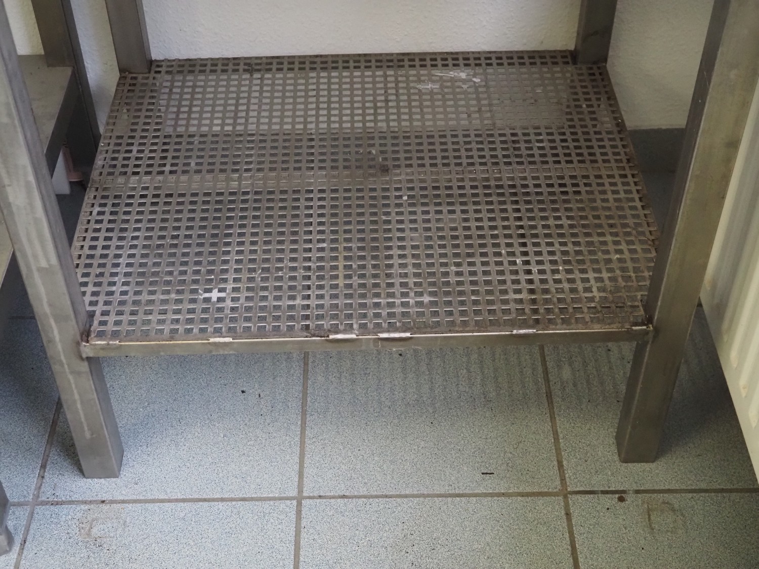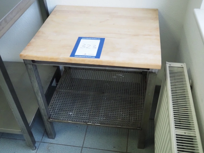S/s table with wooden worktop, dimensions: 680 mm x 590 mm x 750 mm.