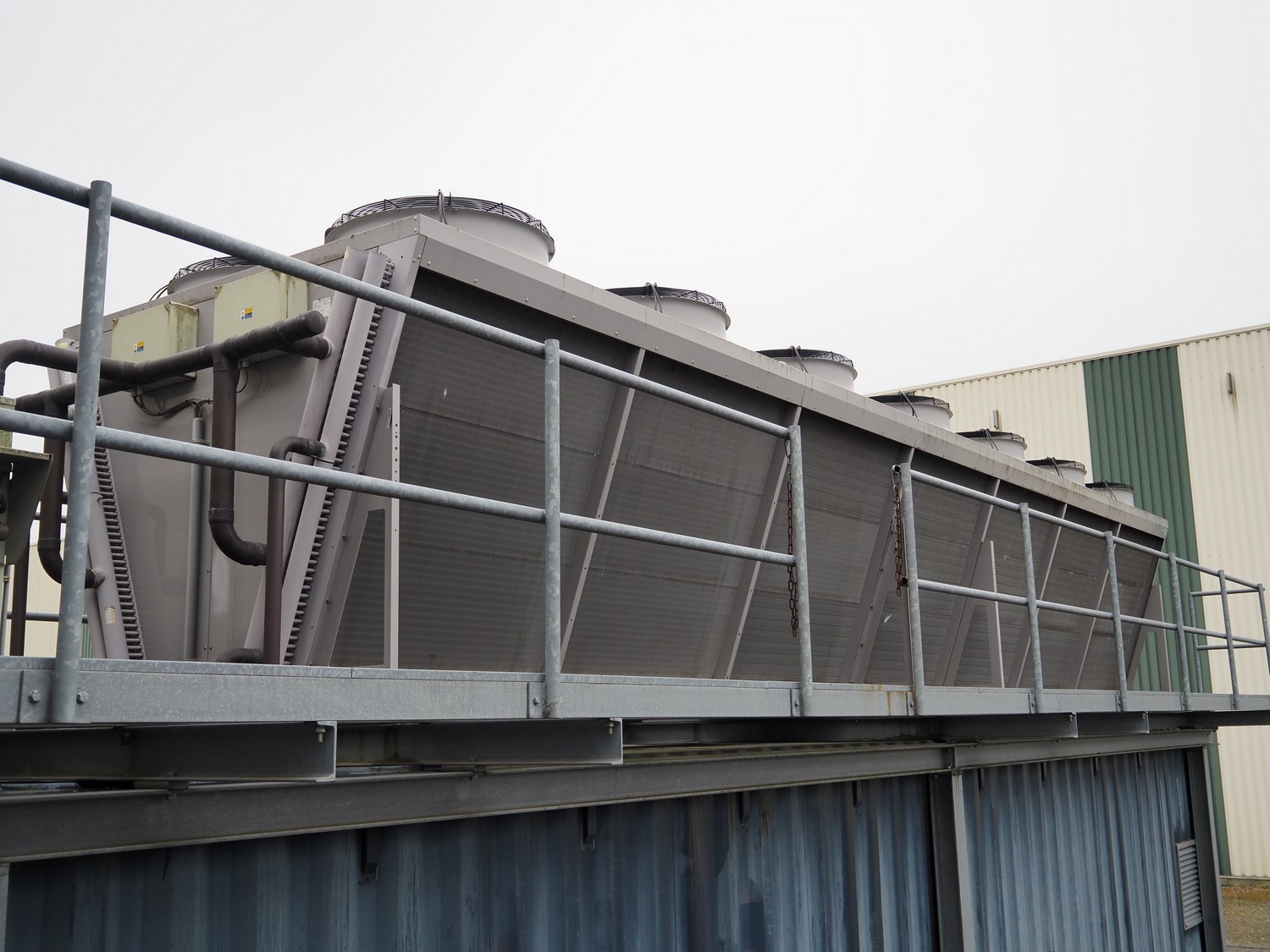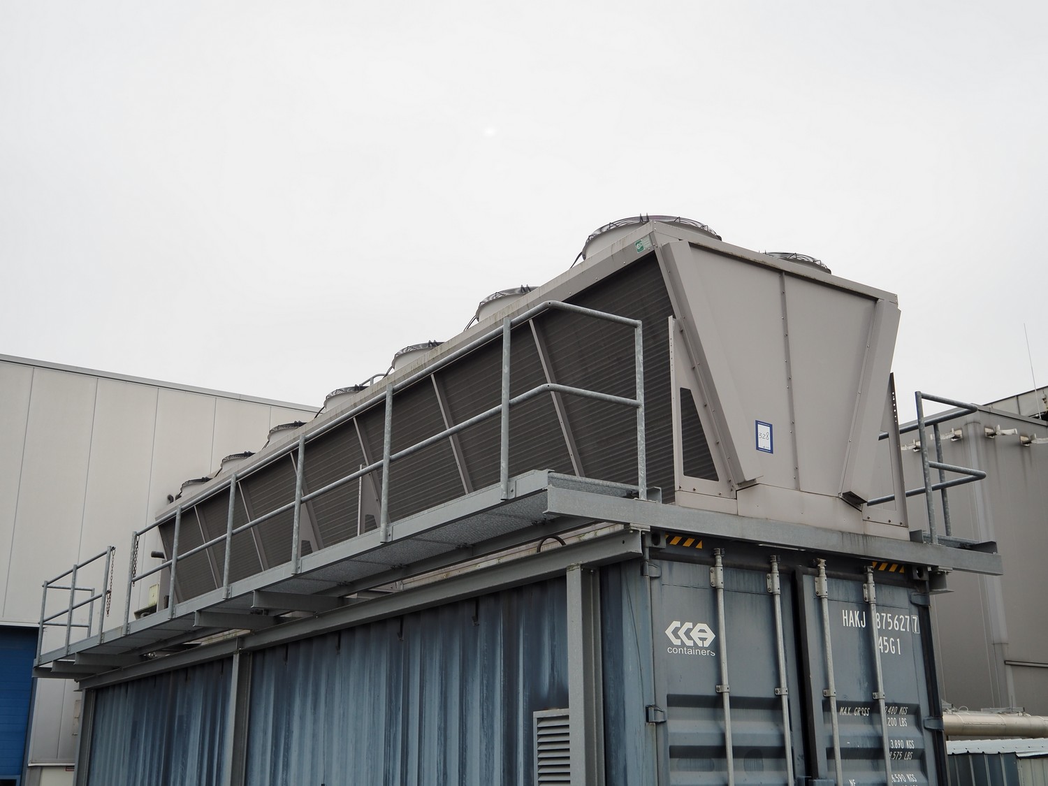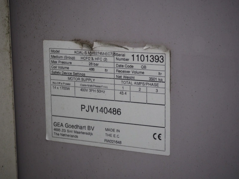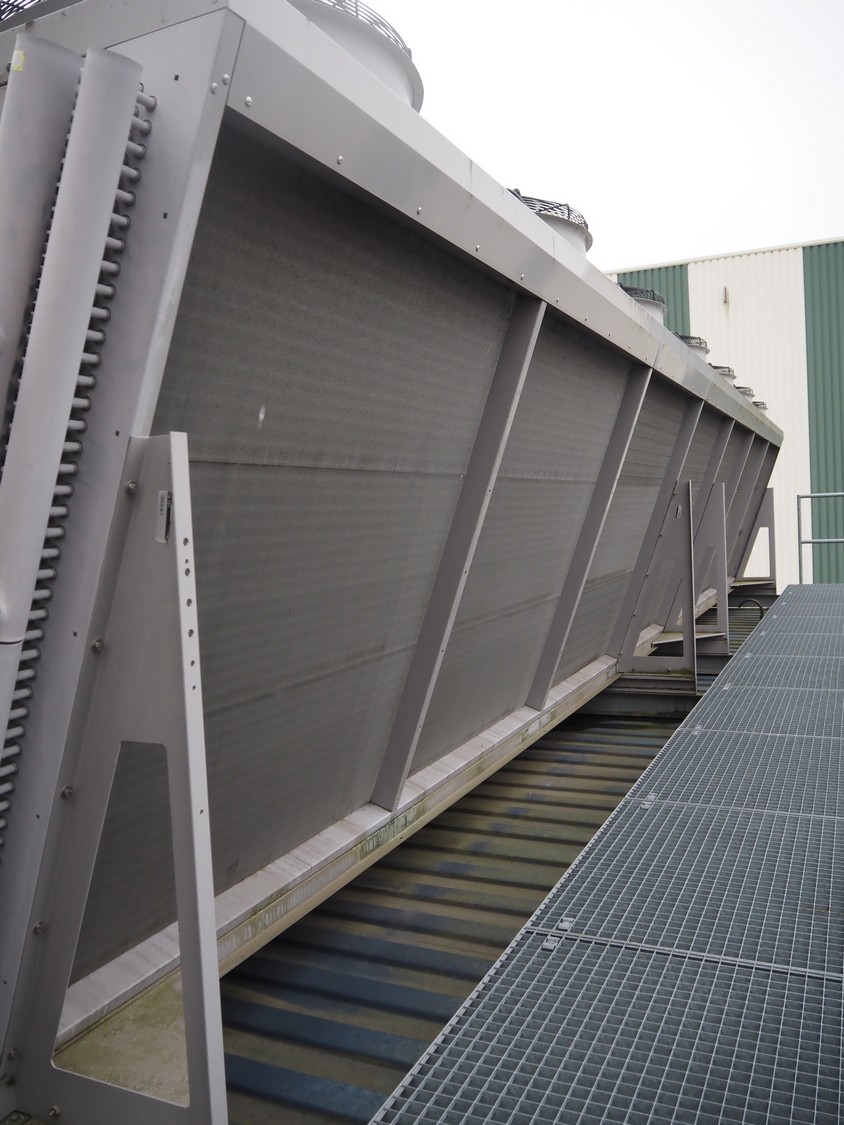 GEA Goedhart BV air-cooled condenser, model: KOAL-S MVB274M-EC725, serial number: 1101393, 400 V, 3 Ph, 50 Hz, 43.4 A, 14 fans, 14 x 1700 W, maximum pressure: 28 bar, coil volume: 486 liter, total dimensions: 10300 mm x 2230 mm x 2200 mm. Including s/s platform.