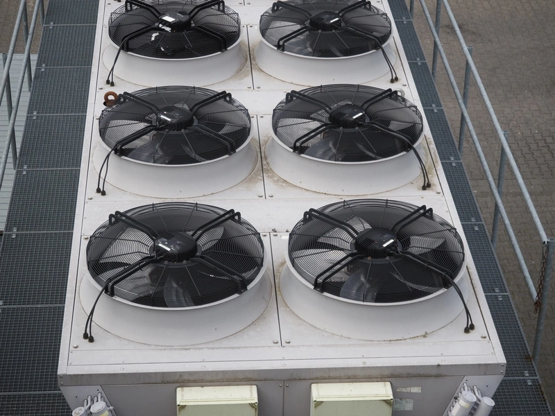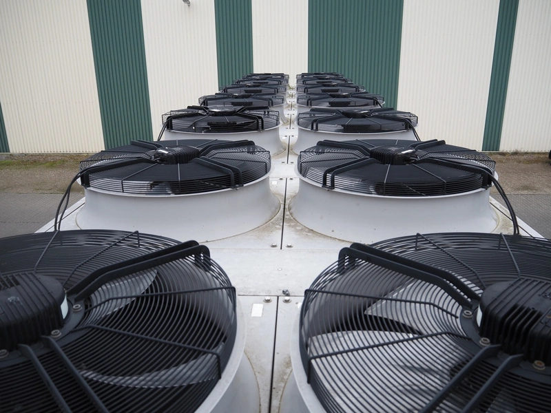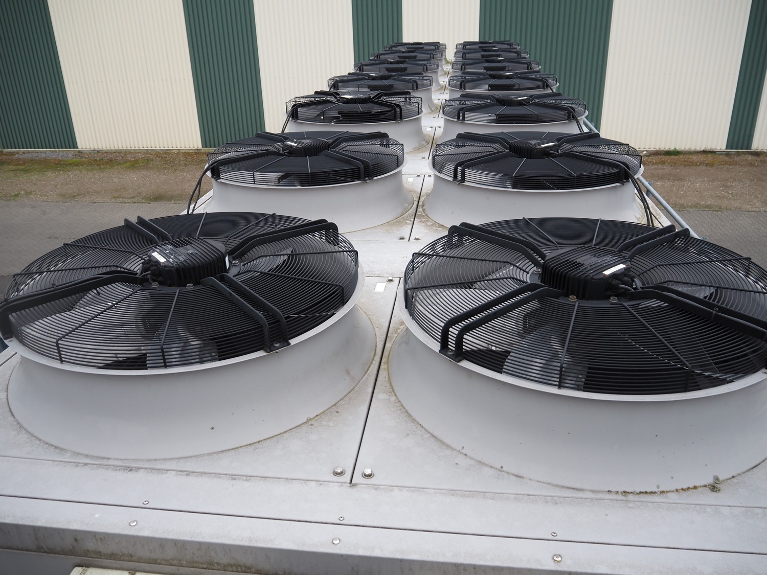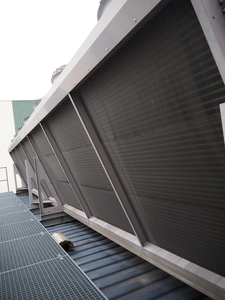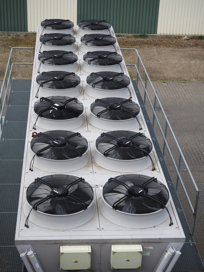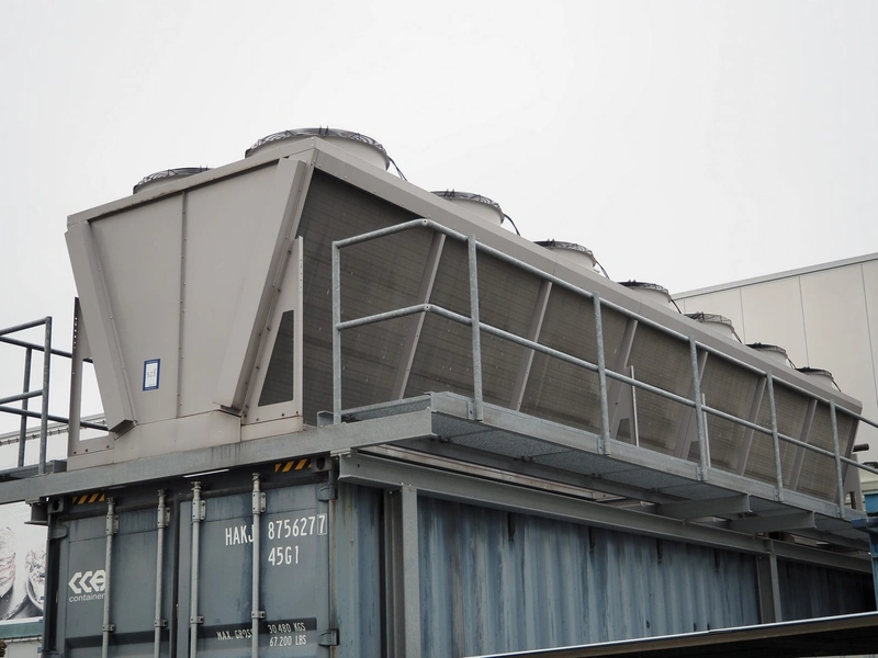 GEA Goedhart BV air-cooled condenser, model: KOAL-S MVB274M-EC725, serial number: 1101393, 400 V, 3 Ph, 50 Hz, 43.4 A, 14 fans, 14 x 1700 W, maximum pressure: 28 bar, coil volume: 486 liter, total dimensions: 10300 mm x 2230 mm x 2200 mm. Including s/s platform.