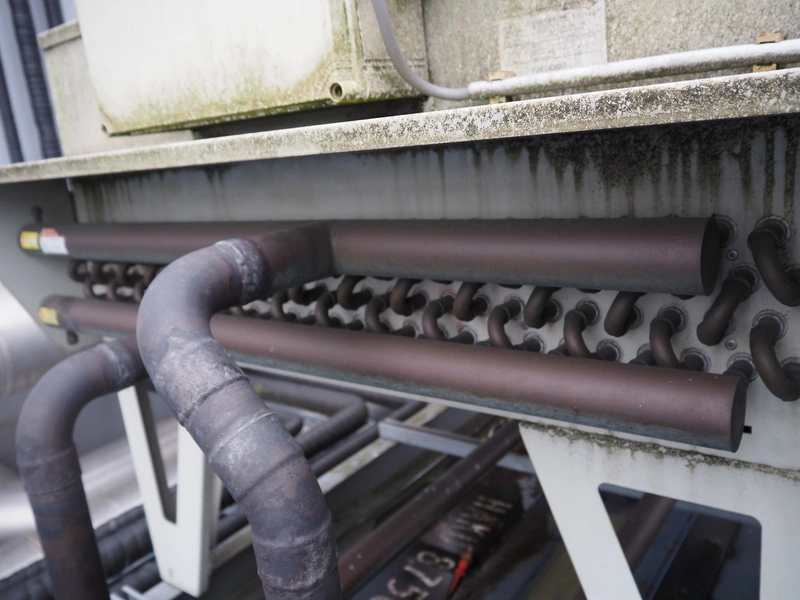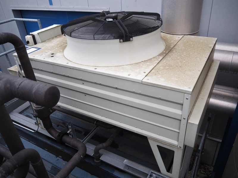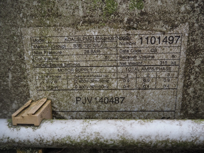 GEA Goedhart BV roof condenser, model: KOALSLFMC101K4H091, serial number: 1101497, 400 V, 3 Ph, 50 Hz, maximum pressure: 28 bar, net weight: 315 kg, total dimensions: 2100 mm x 1200 mm x 1300 mm.