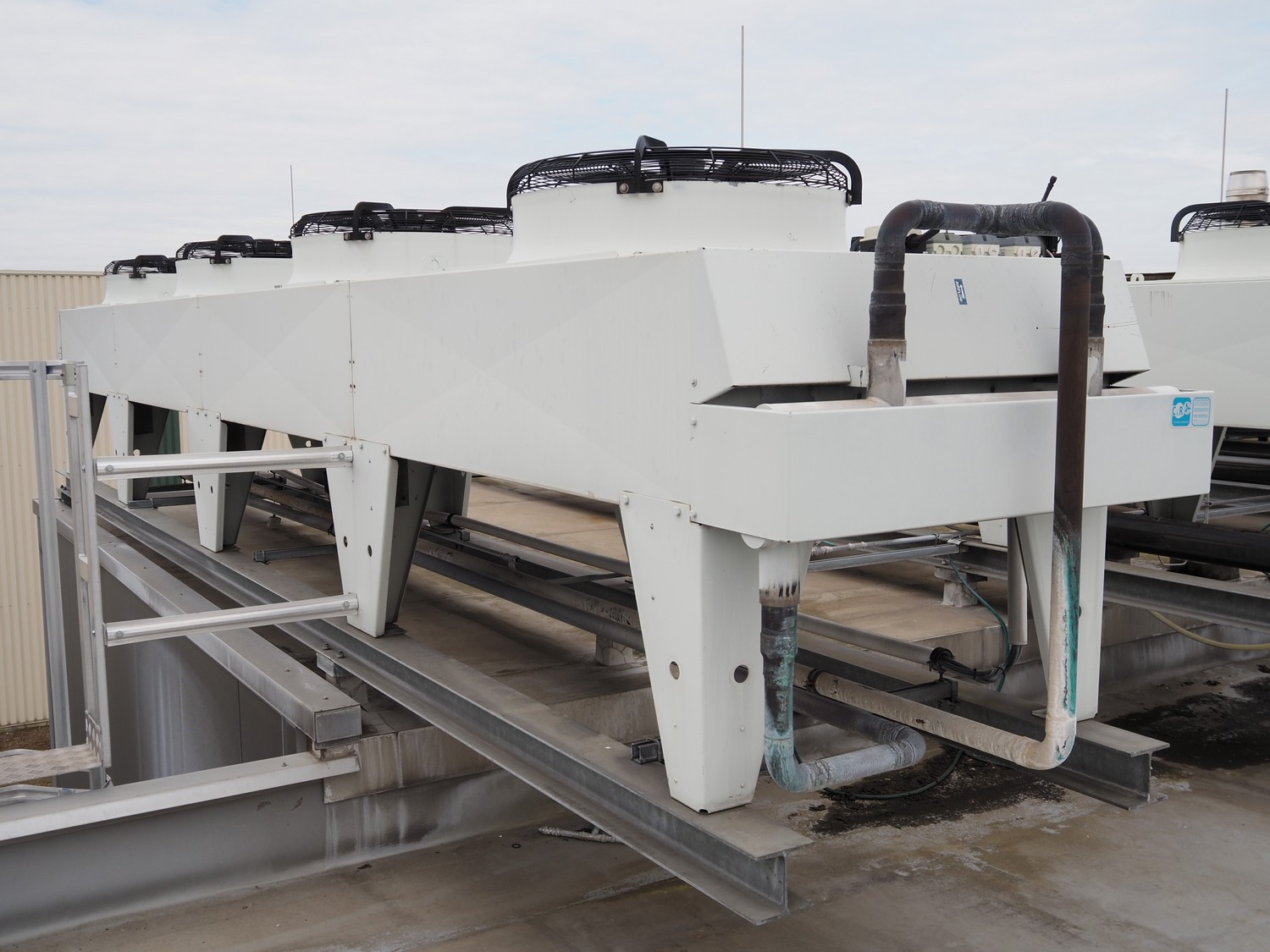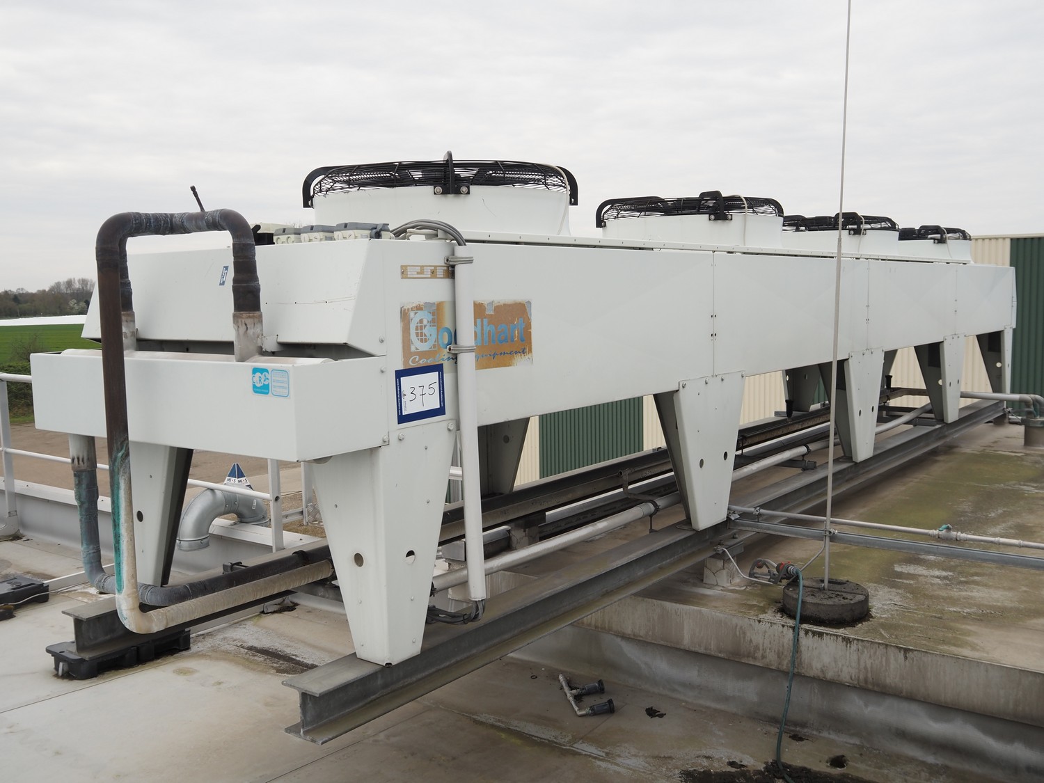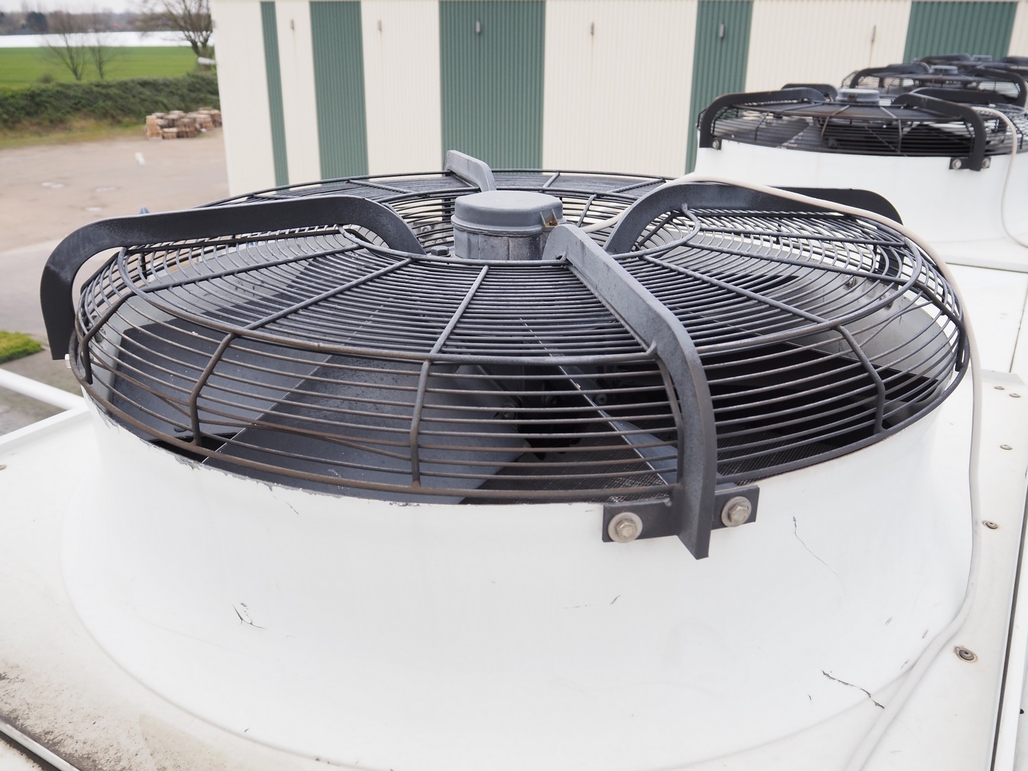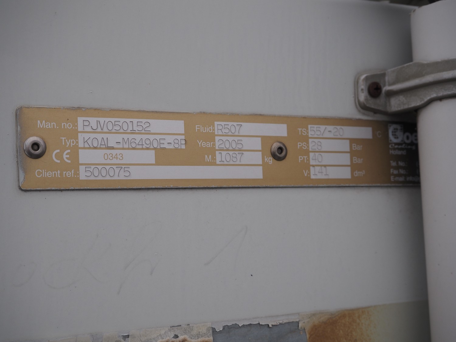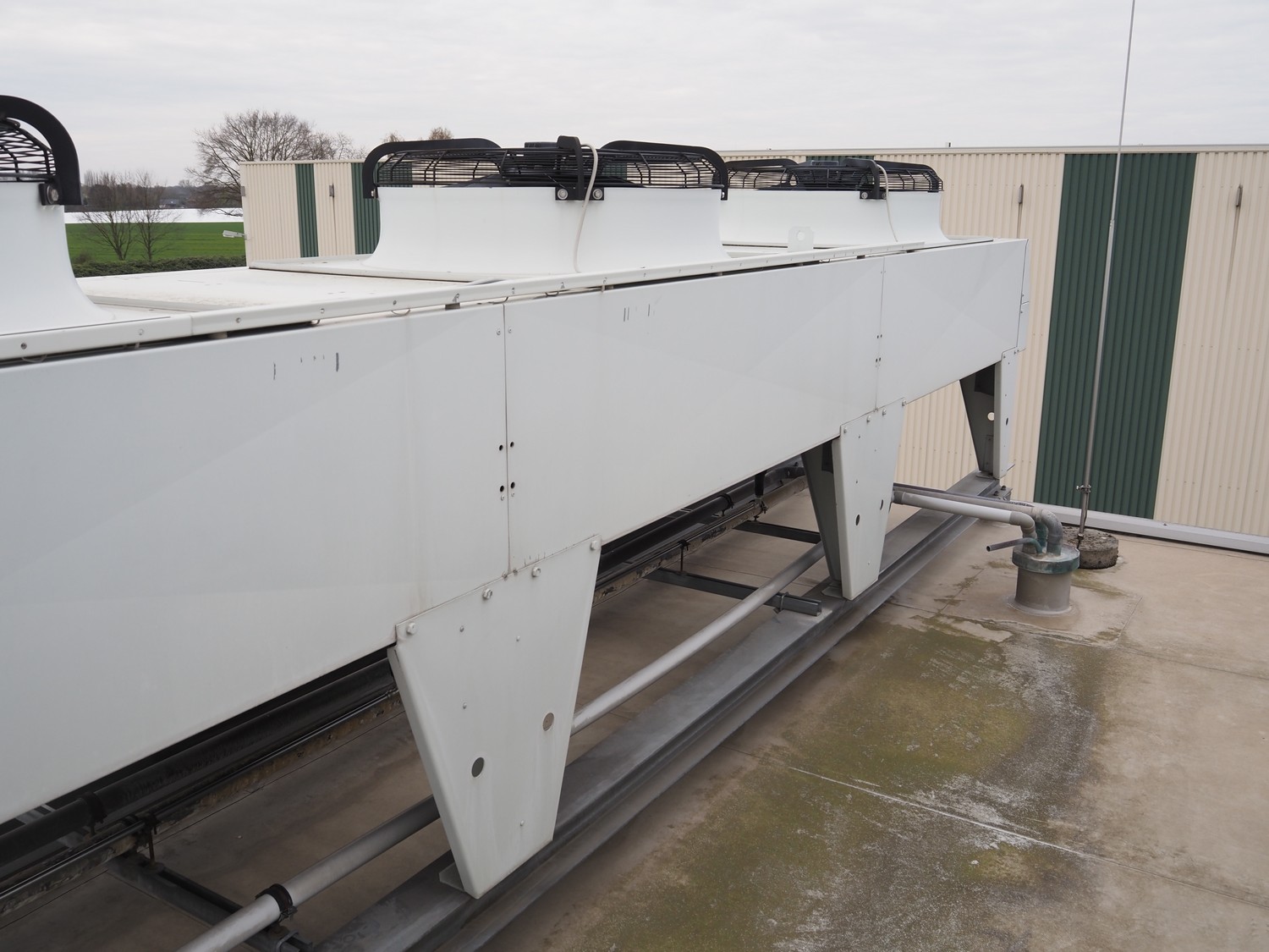 Goedhart roof condenser, type: KOAL-M6490E-8P, manufacturing number: PJV050152, year of construction: 2005, working pressure: 28 bar, test pressure: 40 bar, volume: 141 dm³, weight: 1087 kg, refrigerant: R507, 4 fans, dimensions: 8400 mm x 1220 mm x 1500 mm.