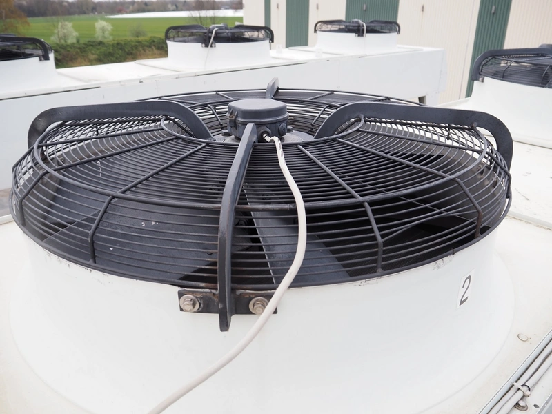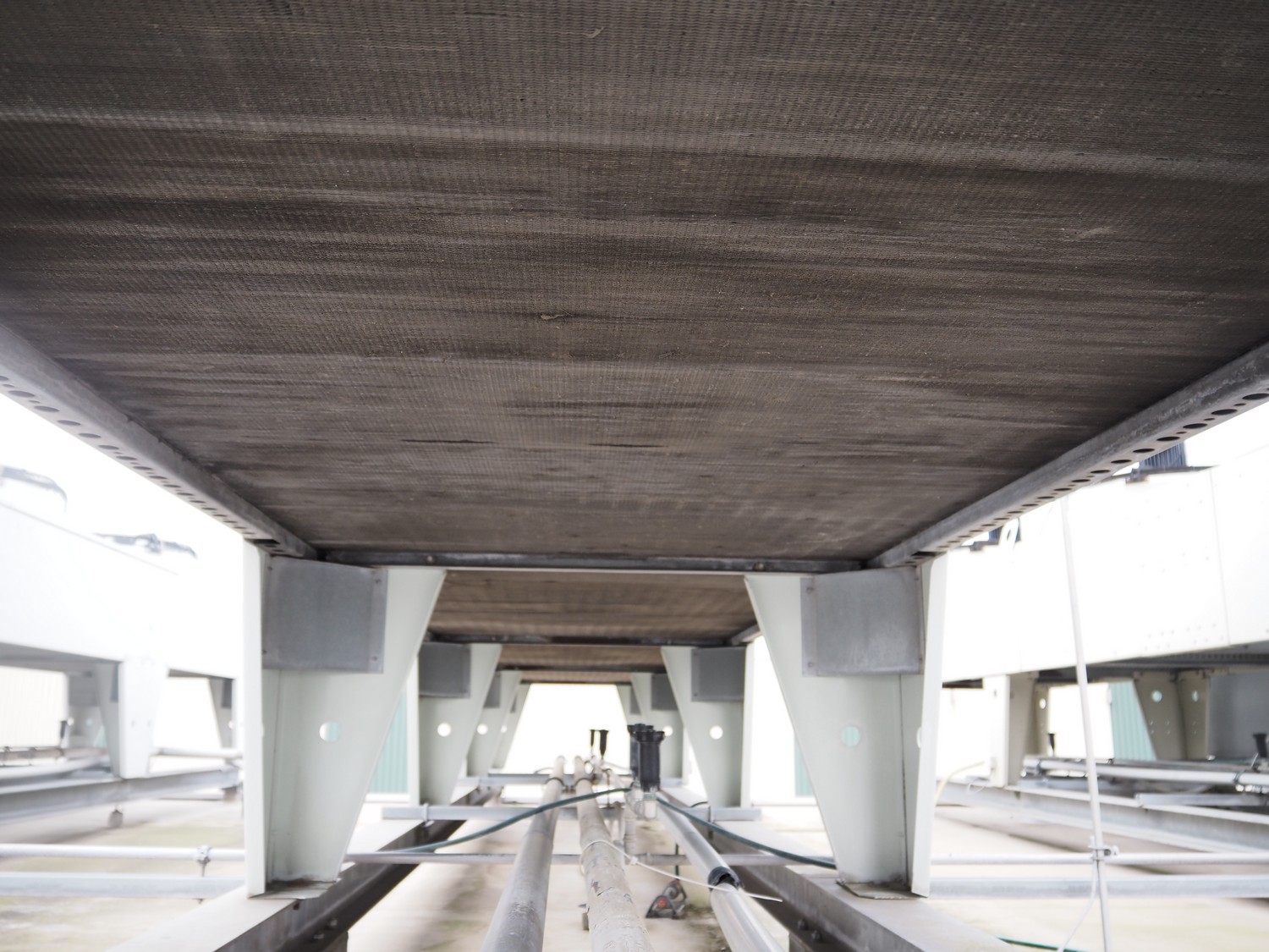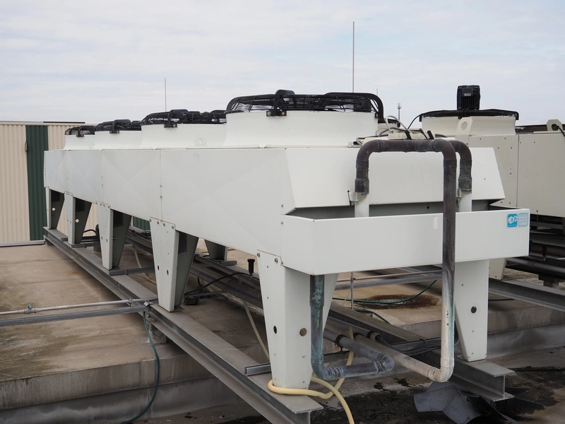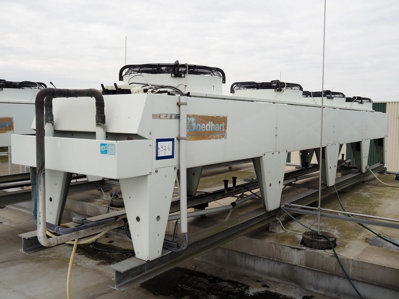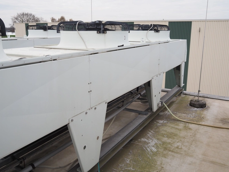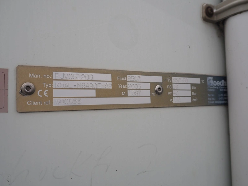 Goedhart roof condenser, type: KOAL-M6490E-8P, manufacturing number: PJV051208, year of construction: 2005, working pressure: 28 bar, test pressure: 40 bar, volume: 141 dm³, weight: 1087 kg, refrigerant: R507, 4 fans, dimensions: 8400 mm x 1220 mm x 1500 mm.