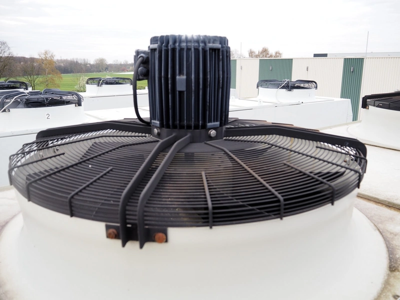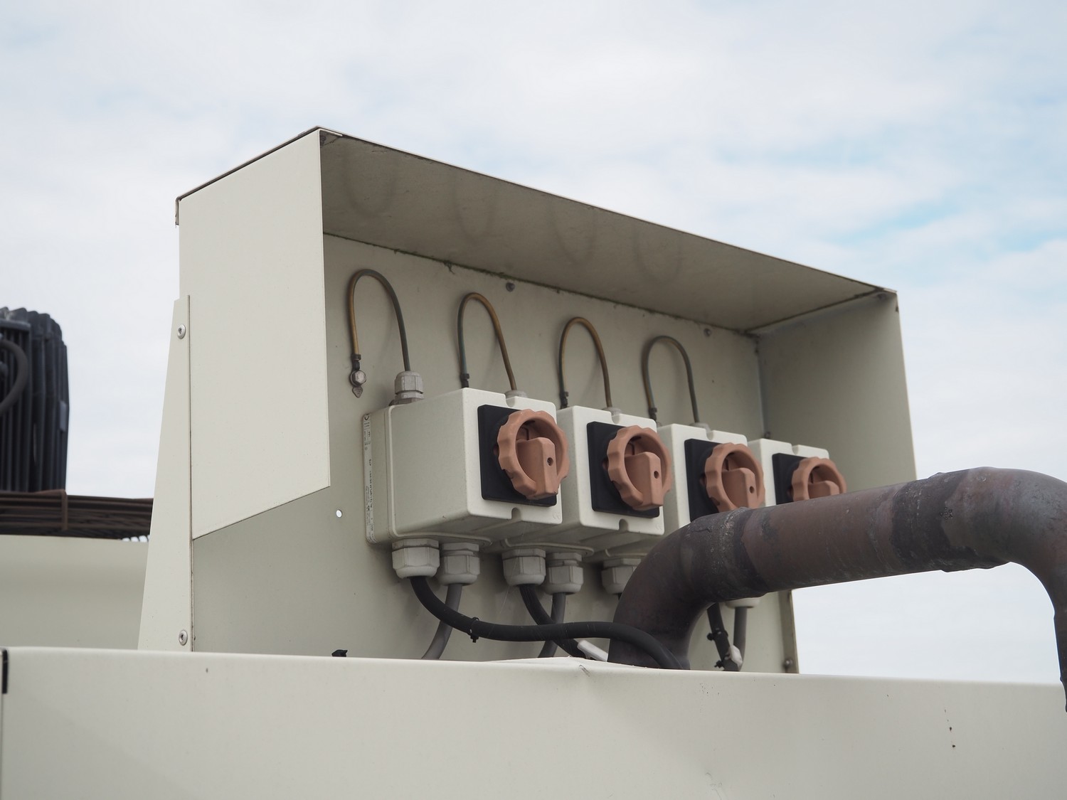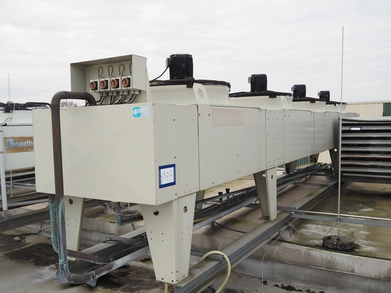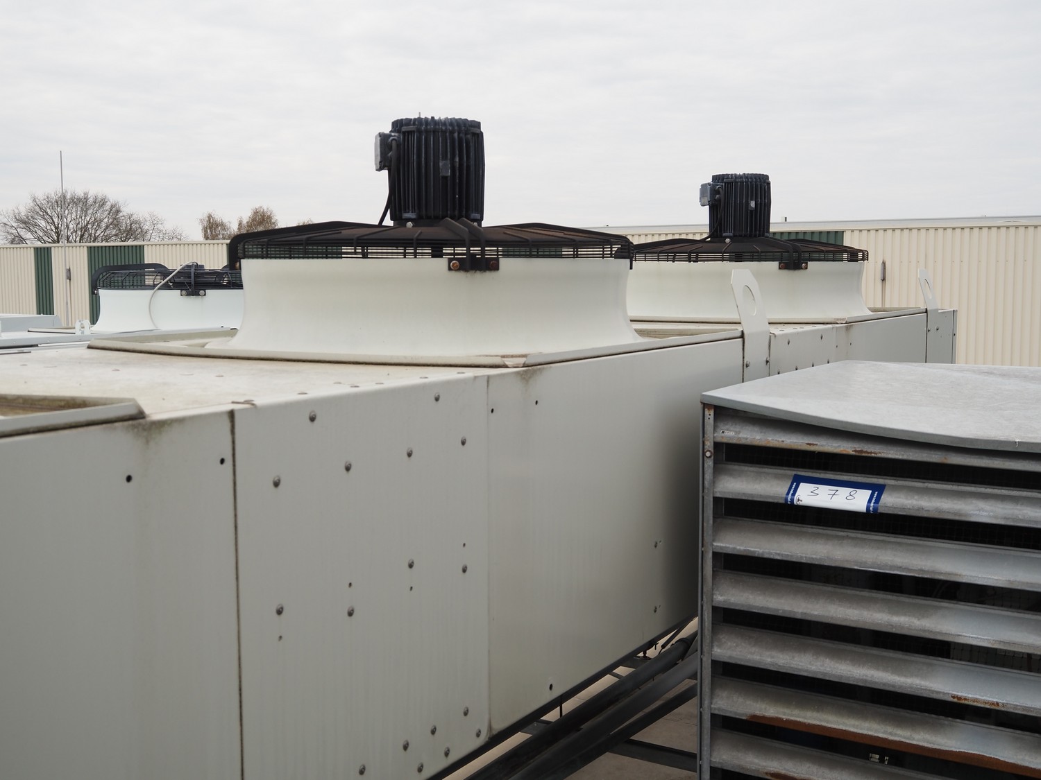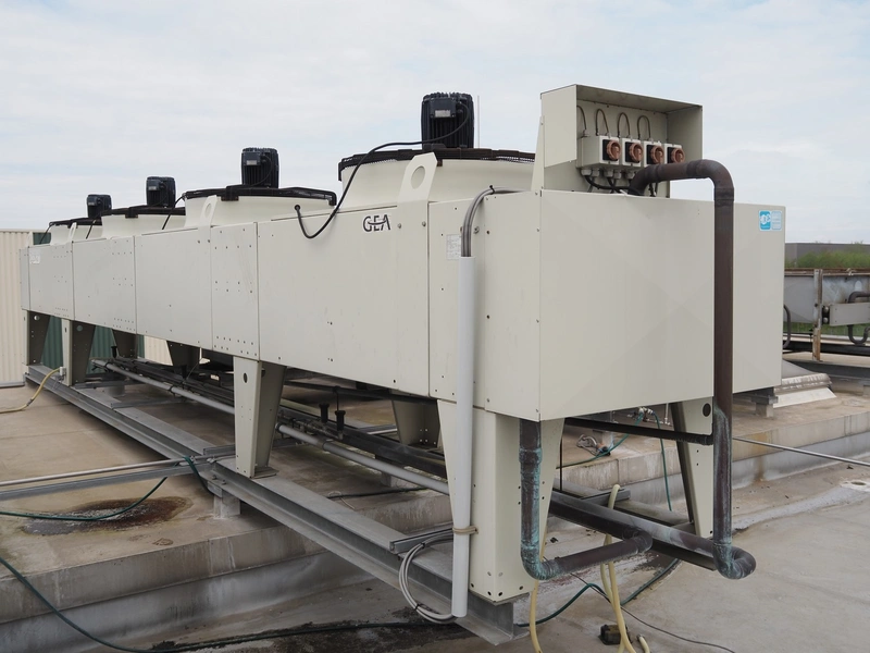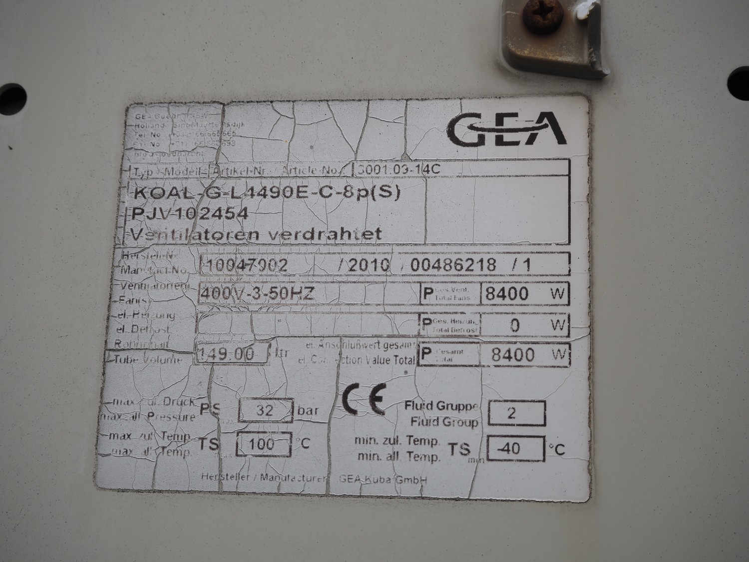 GEA Goedhart BV roof condenser, model: KOAL-G-L4490E-C-8p(S), manufacturing number: 10057002 / 2010 / 00486218 / 1, 400 V, 3 Ph, 50 Hz, tube volume: 149 liter, maximum pressure: 32 bar, 4 fans, 8400 W, total dimensions: 8400 mm x 1200 mm x 1900 mm.