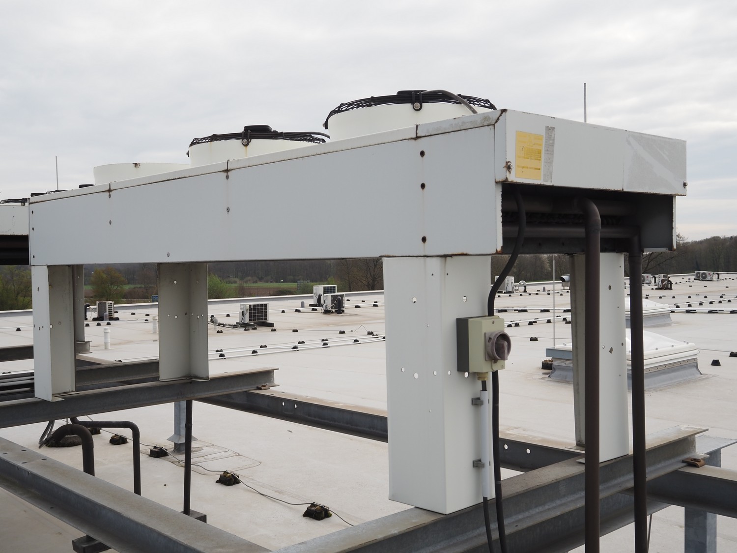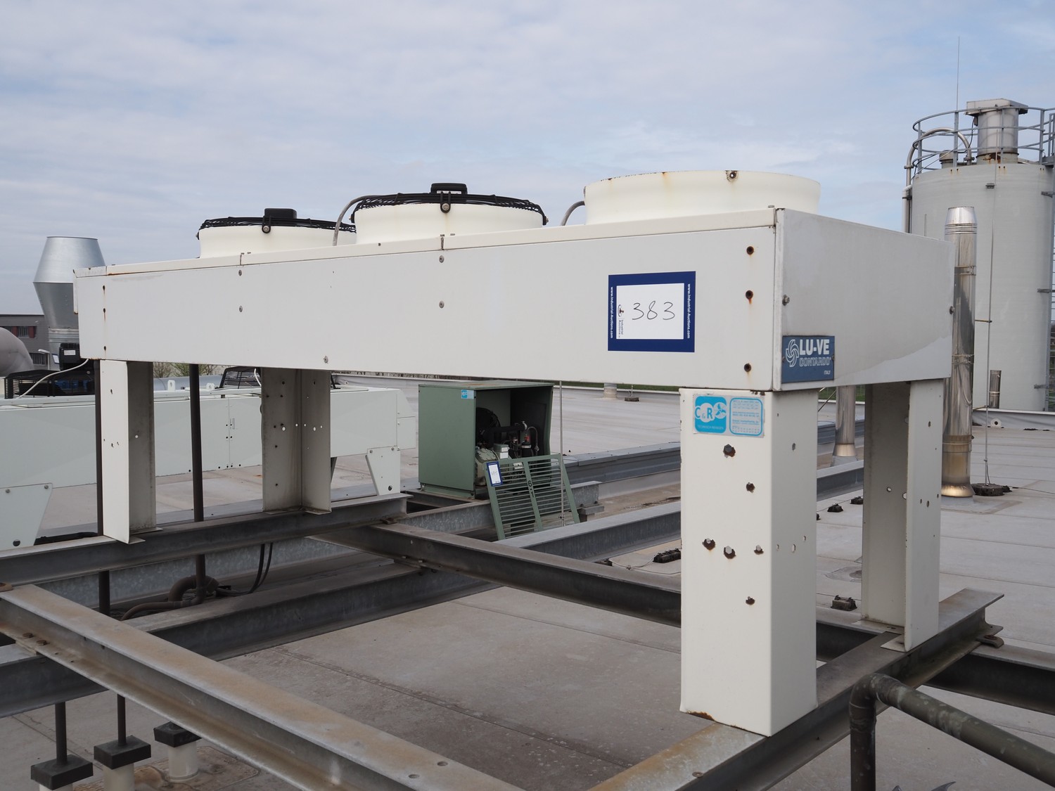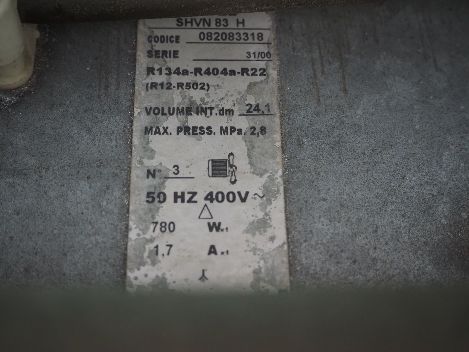 Lu-Ve Contardo roof condenser, model: SHVN 83 H, serial number: 082083318, 400 V, 3 Ph, 50 Hz, internal volume: 24.1 dm³, 1.7 A, refrigerant: R134a - R404a - R22, 3 fans, dimensions: 2750 mm x 800 mm x 1200 mm. 1 fan already been dismantled.
