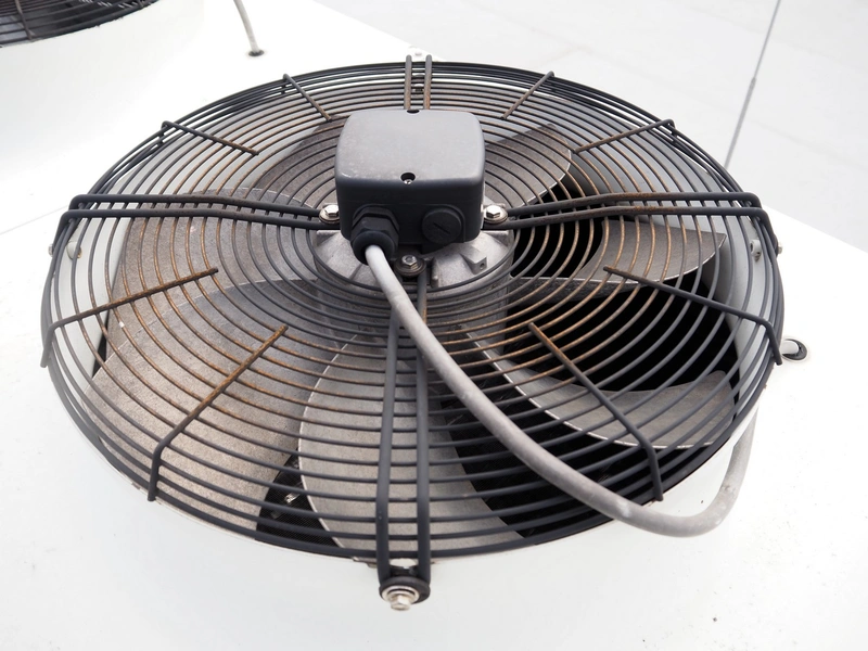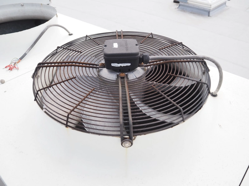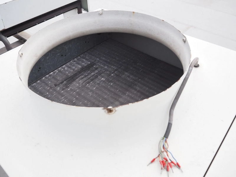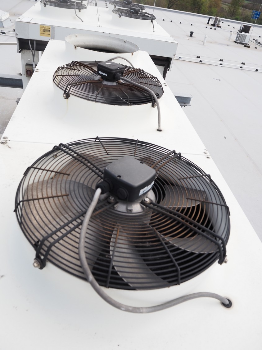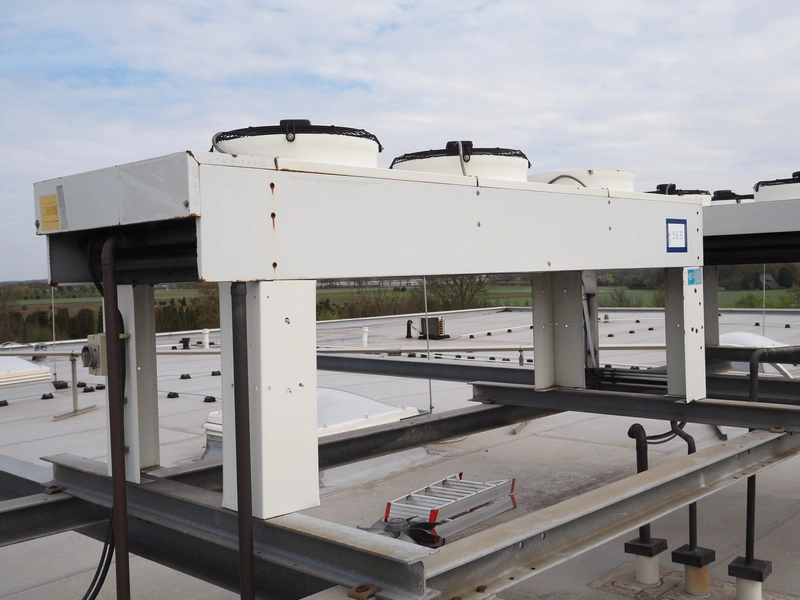 Lu-Ve Contardo roof condenser, model: SHVN 83 H, serial number: 082083318, 400 V, 3 Ph, 50 Hz, internal volume: 24.1 dm³, 1.7 A, refrigerant: R134a - R404a - R22, 3 fans, dimensions: 2750 mm x 800 mm x 1200 mm. 1 fan already been dismantled.