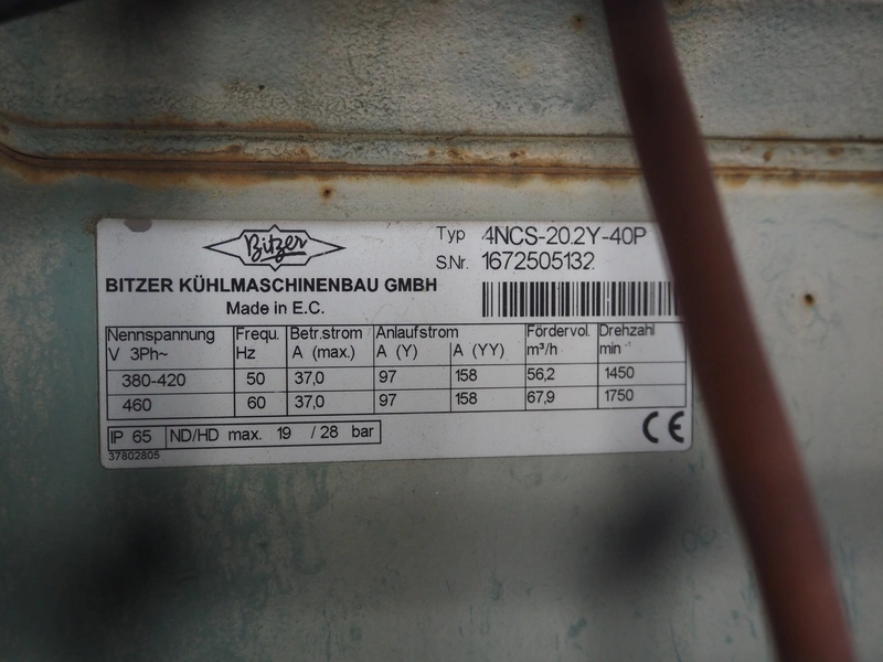 Bitzer Kühlmaschinenbau GmbH compressor / condensing unit, compressor type: 4NCS-20.2Y-40P, serial number: 1672505132, 50/60 Hz, capacity: 56.2 / 67.9 m³ per hour, 1450 / 1750 rates per minute, dimensions: 1650 mm x 1100 mm x 1050 mm.