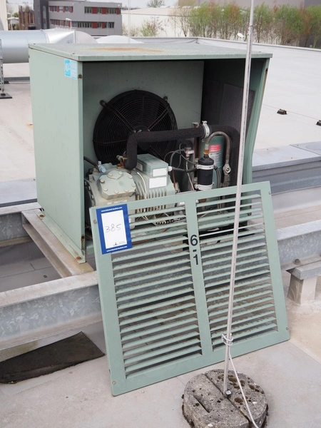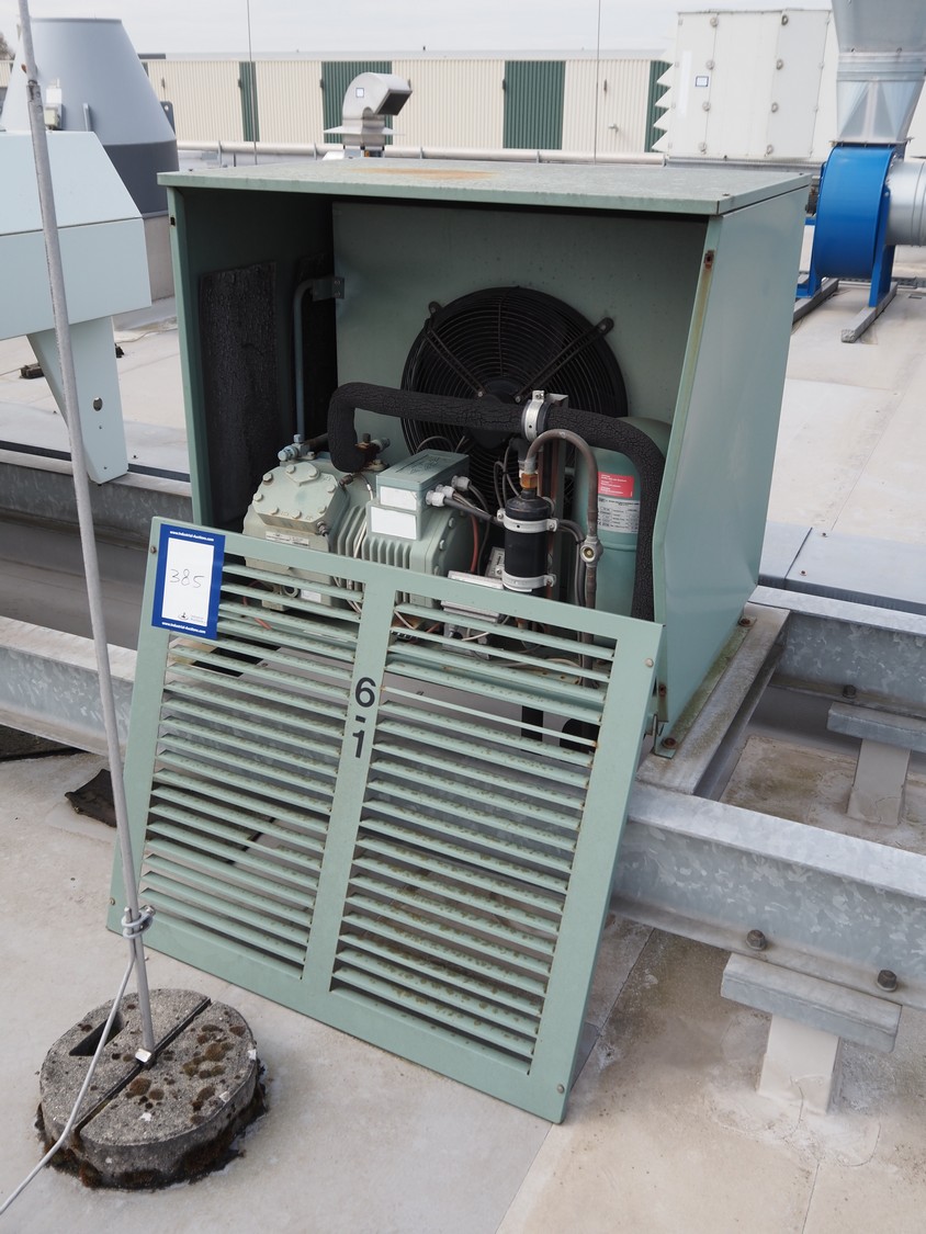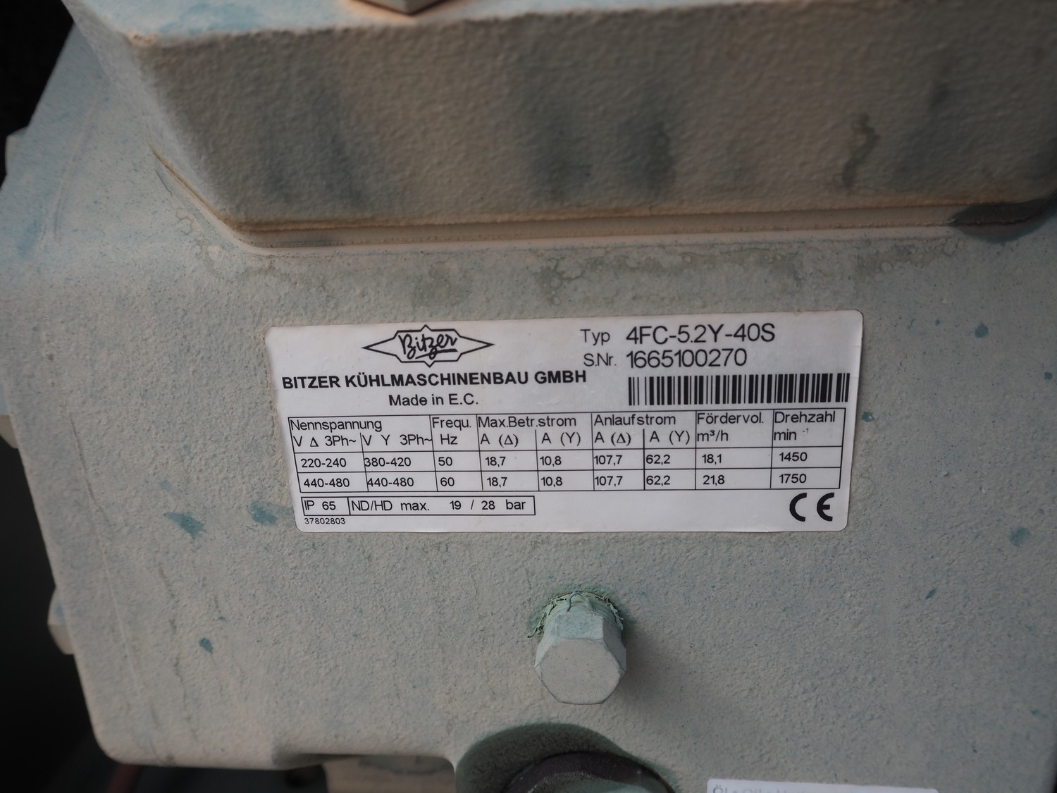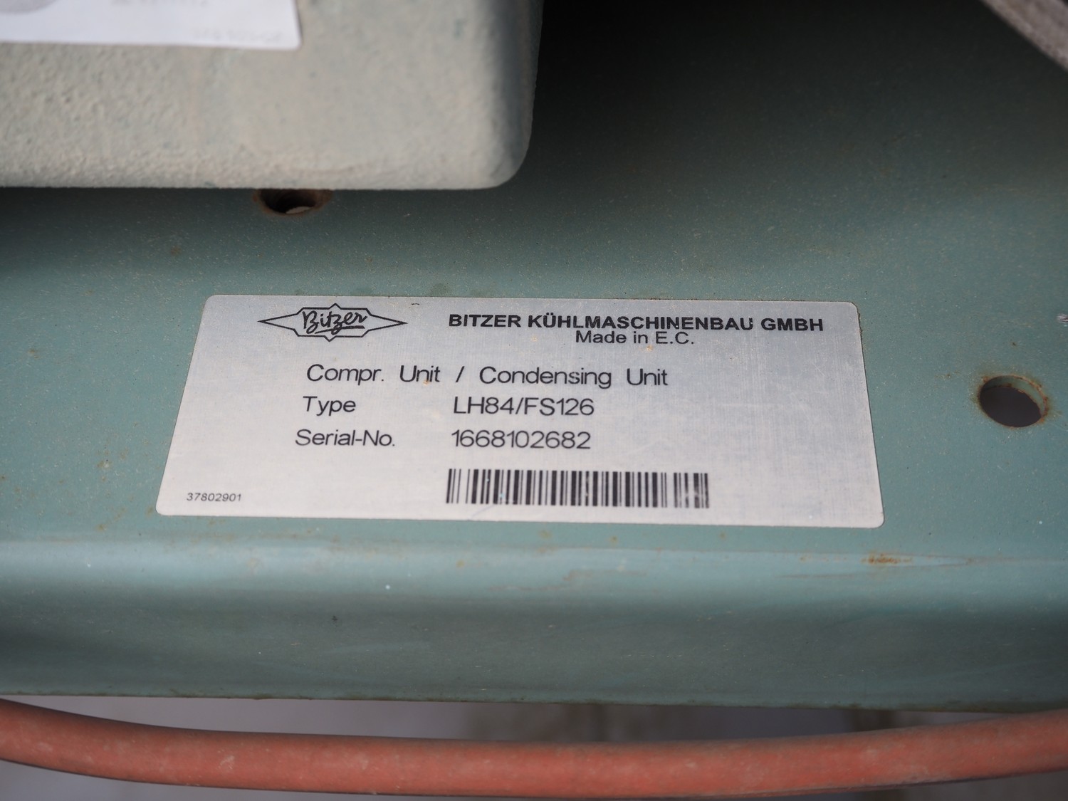 Bitzer Kühlmaschinenbau GmbH compressor / condensing unit, type: LH84/FS126, serial number: 1668102682, compressor type: 4FC-5.2Y-40S, serial number: 1665100270, 50/60 Hz, capacity: 18.1 / 21.8 m³ per hour, 1450 / 1750 rates per minute, dimensions: 1000 mm x 700 mm x 920 mm.
