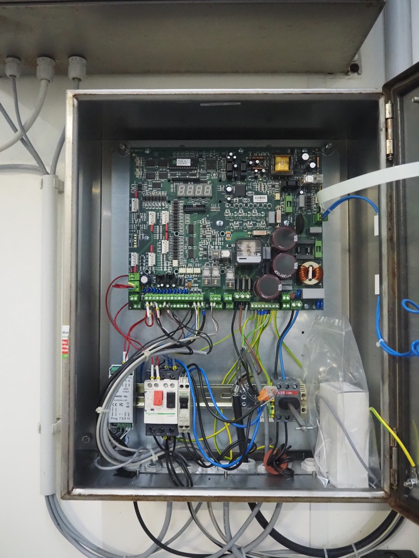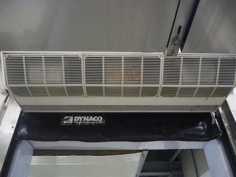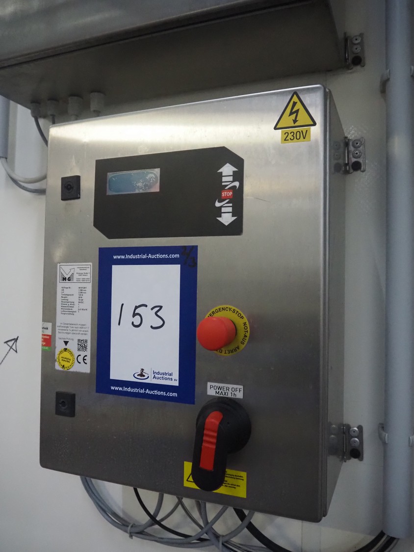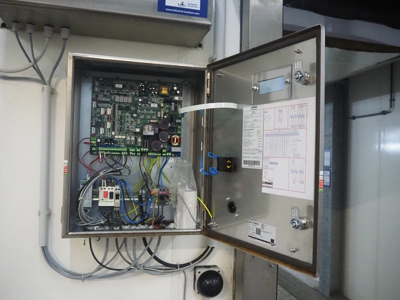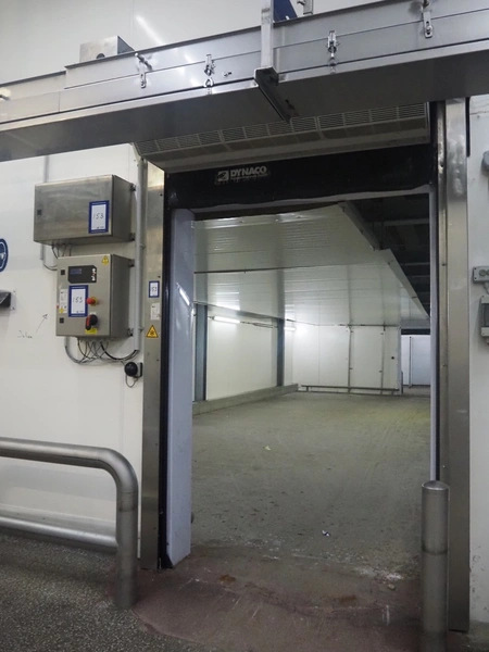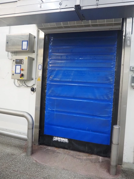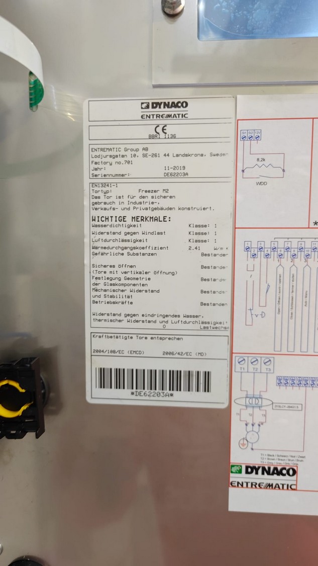 Dynaco electric high speed shutter door, type: Freezer M2, serial number: DE62203A, year of construction: 11-2019, door dimensions: 1530 mm x 2350 mm, dimensions frame: 1850 mm x 3100 mm. Including 2 switch cabinets, dimensions switch cabinets: 400 mm x 300 mm x 500 mm and 600 mm x 200 mm x 600 mm.
