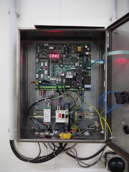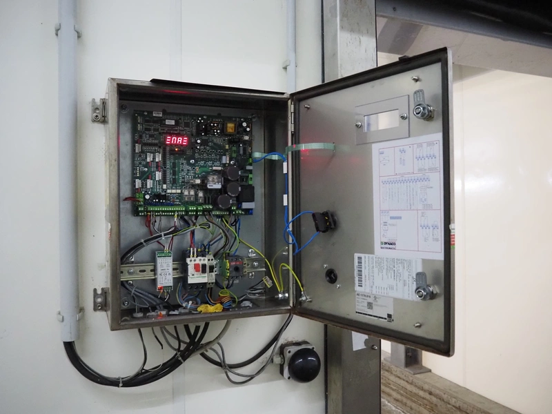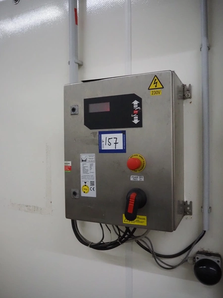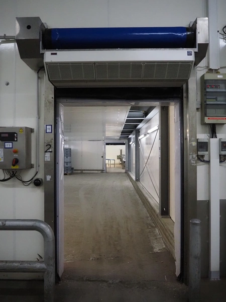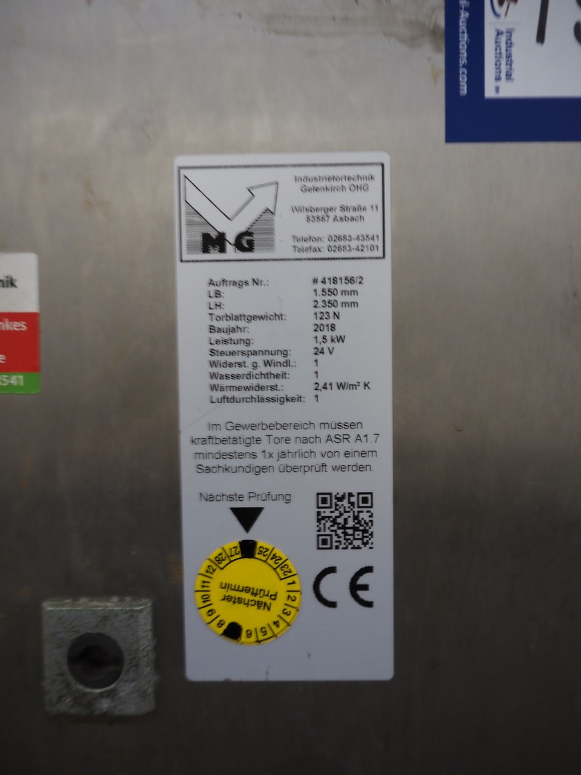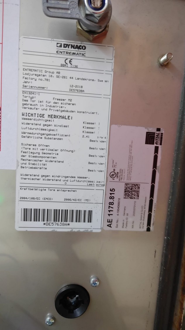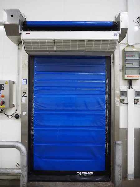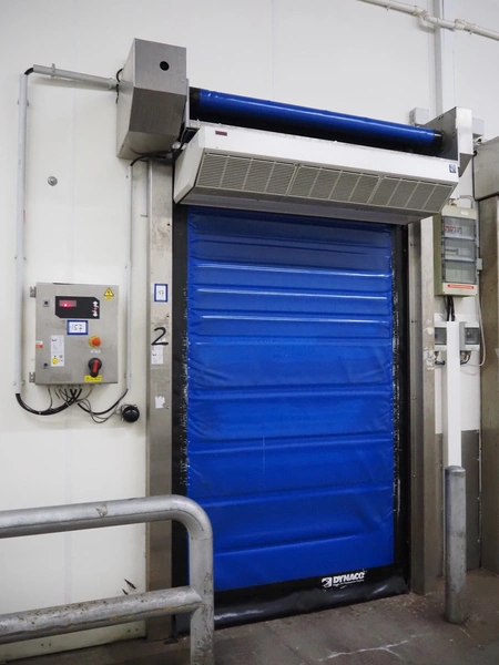 Dynaco electric high speed shutter door, type: Freezer M2, serial number: DE57638A, year of construction: 12-2018, door dimensions: 1500 mm x 2250 mm, dimensions frame: 2000 mm x 3050 mm. Including switch cabinet, dimensions switch cabinet: 400 mm x 250 mm x 550 mm.